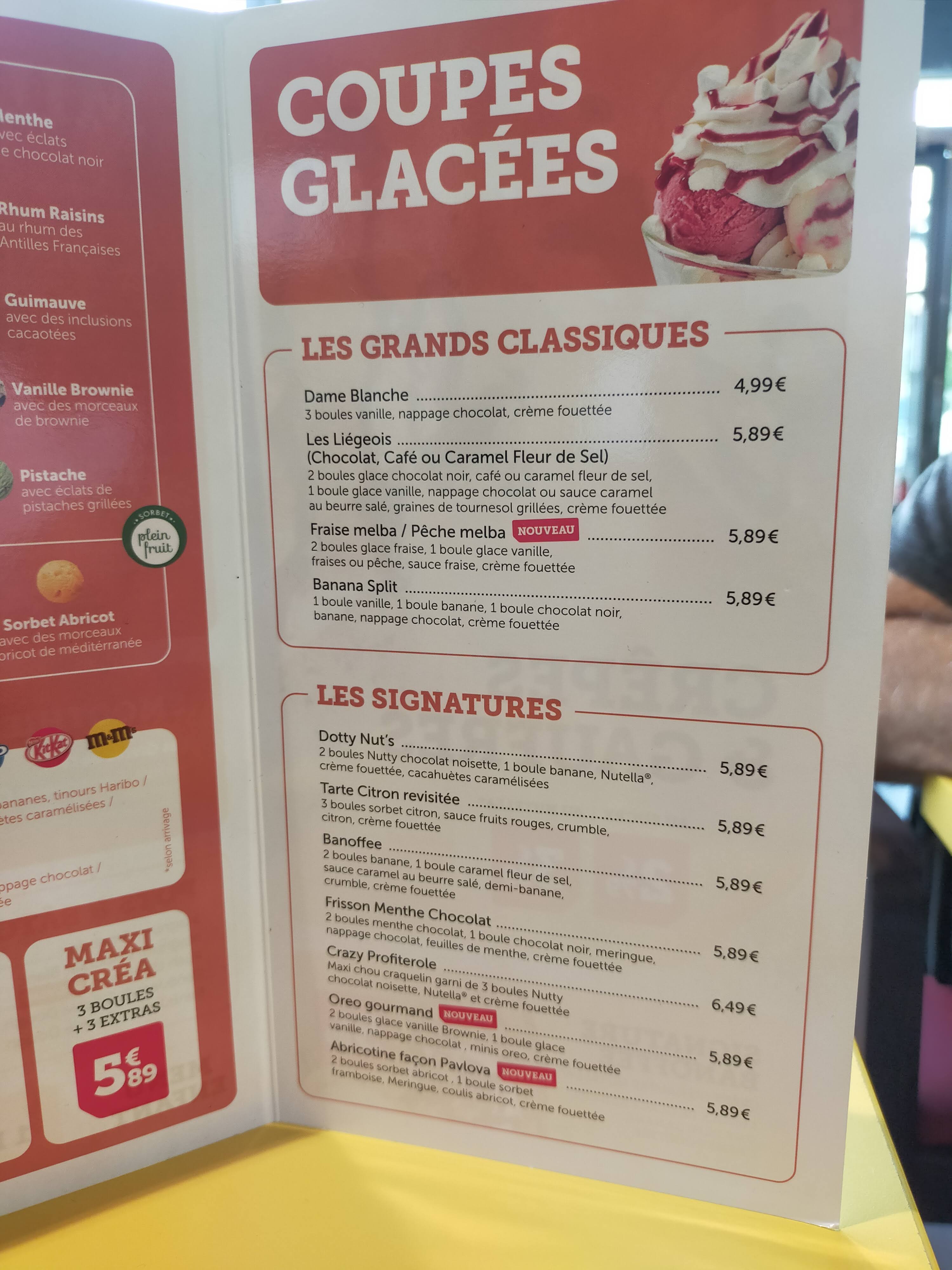 Passé vers 17h un après-midi pour déguster une coupe glacée. Pour celle que je voulais , le parfum n'était plus disponible ( il aurait été préférable de le mentionner sur les panneaux ) et j'ai du me rabattre sur une autre plus classique. Sinon la personne qui m'a servi à table après une courte attente était aimable et la coupe généreuse. En revanche le buffet des entrées était toujours disponible ( sûrement depuis le repas de midi ) sans aucune protection et bien que sur de la glace, l'hygiène n'était pas vraiment au rendez vous car situé très près de l'allée du mail et surtout de la sortie extérieure. Je pense que ce point doit être amélioré.