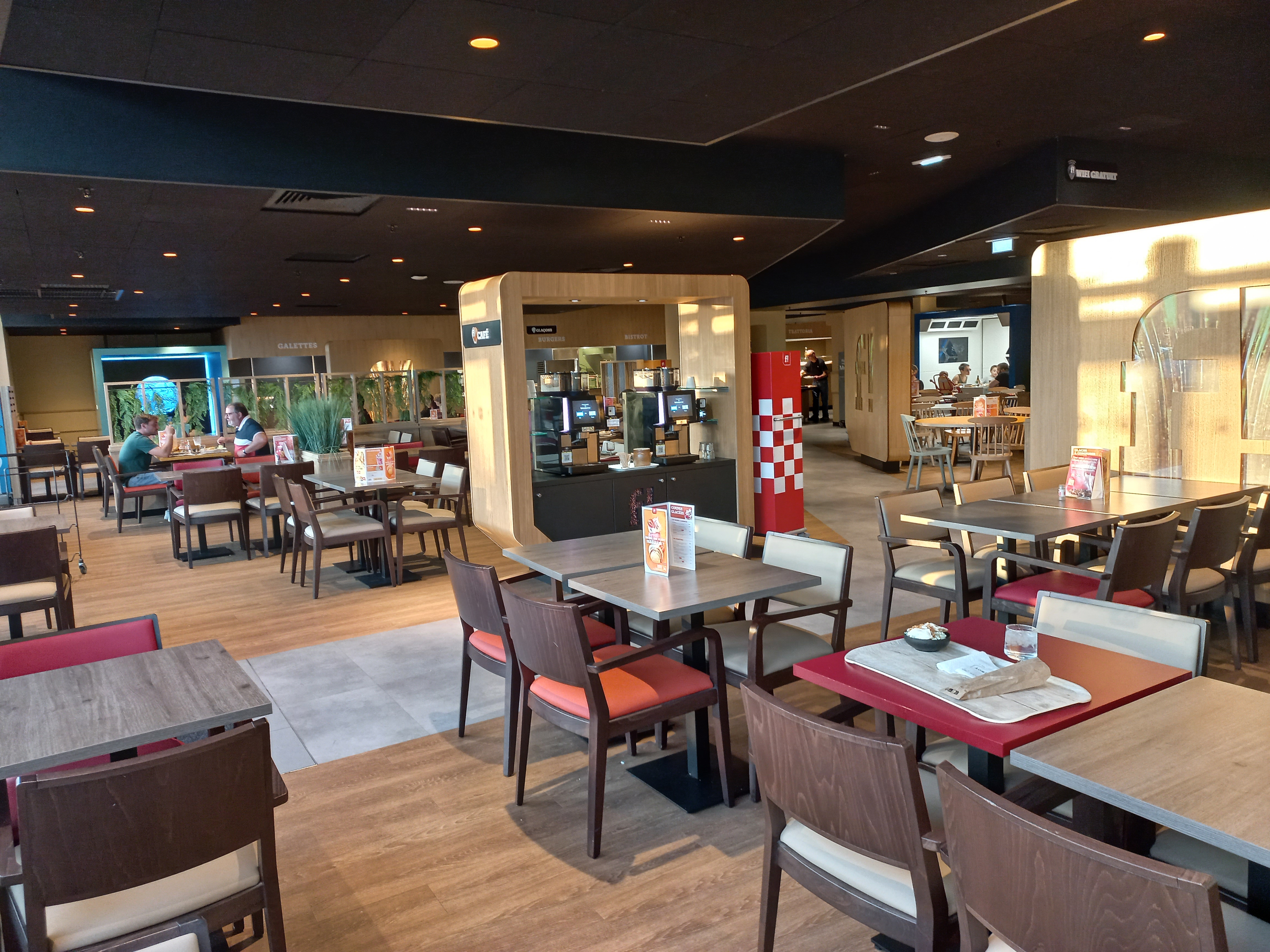 C'est agréable ça ne fait pas cantine pour partager un moment entre amis ou famille quand on est pressé c'est idéal.. Un peu bruyant.. Il manque quelques des séparations entre les groupes de tables,pour plus d'intimité..