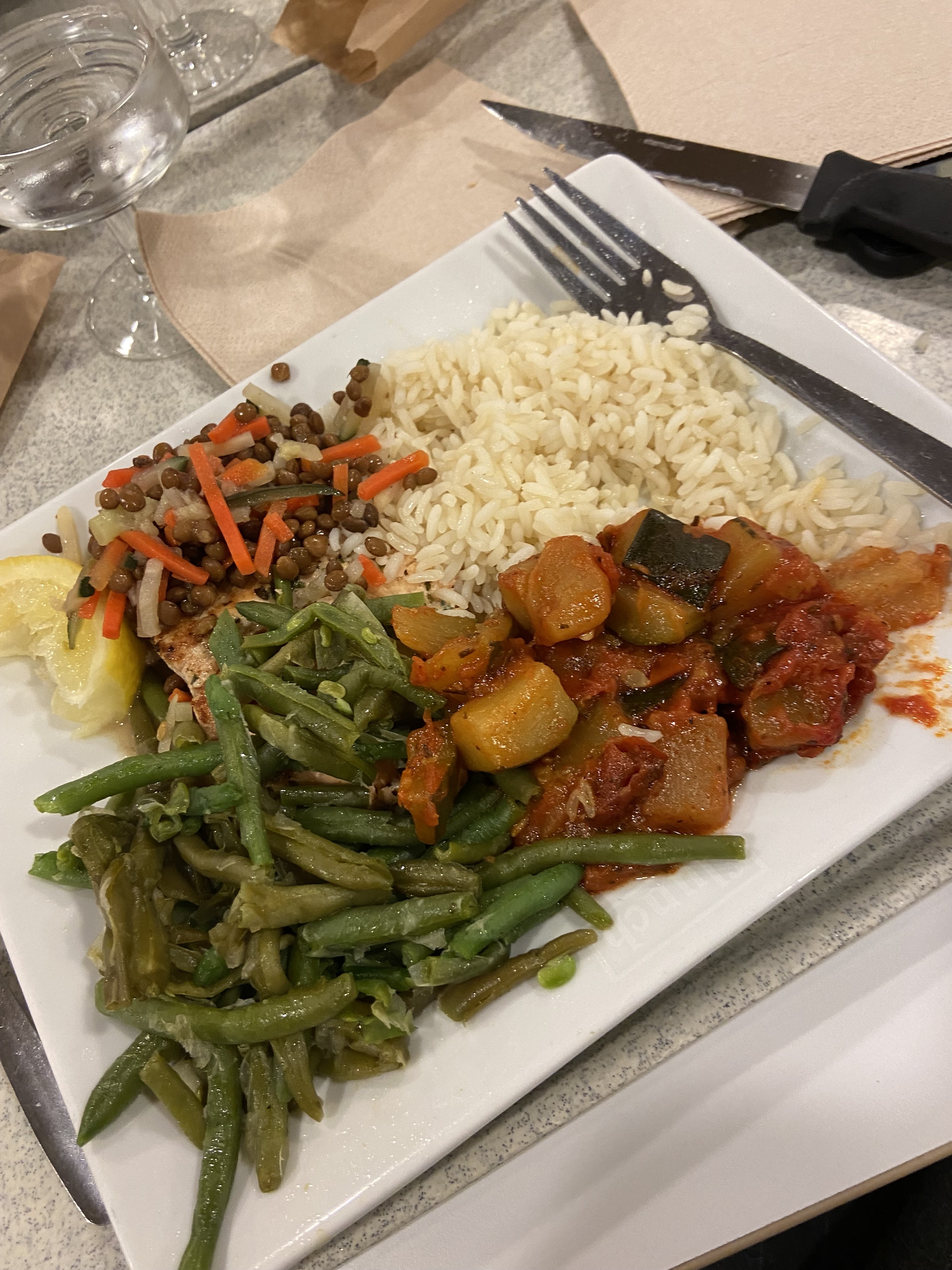 Il n'y avait pas beaucoup de choix dans les plats proposés. Il n'y a pas non plus beaucoup de légumes et féculents différents. Pour finir, la viande que j'avais demandée bien cuite était saignante. Au moins, ça nous a permis de reprendre des forces pour le trajet.