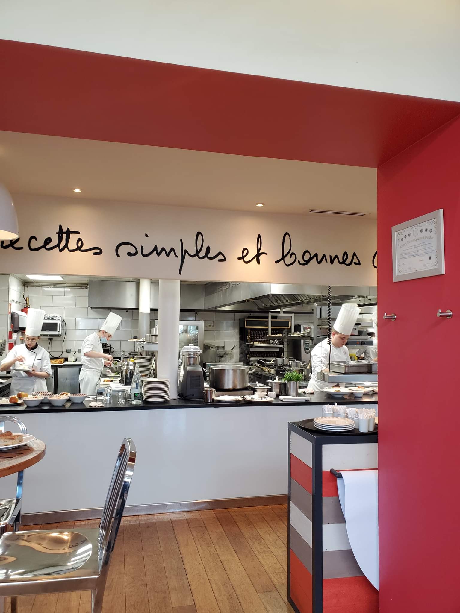 Une institution, à deux pas de chez nous ! Délicieux et toujours plaisant cette vue en transparence depuis la salle sur l’effervescence des toques en cuisine ! La partie terrasse surélevée donne un air d’évasion d’exception.