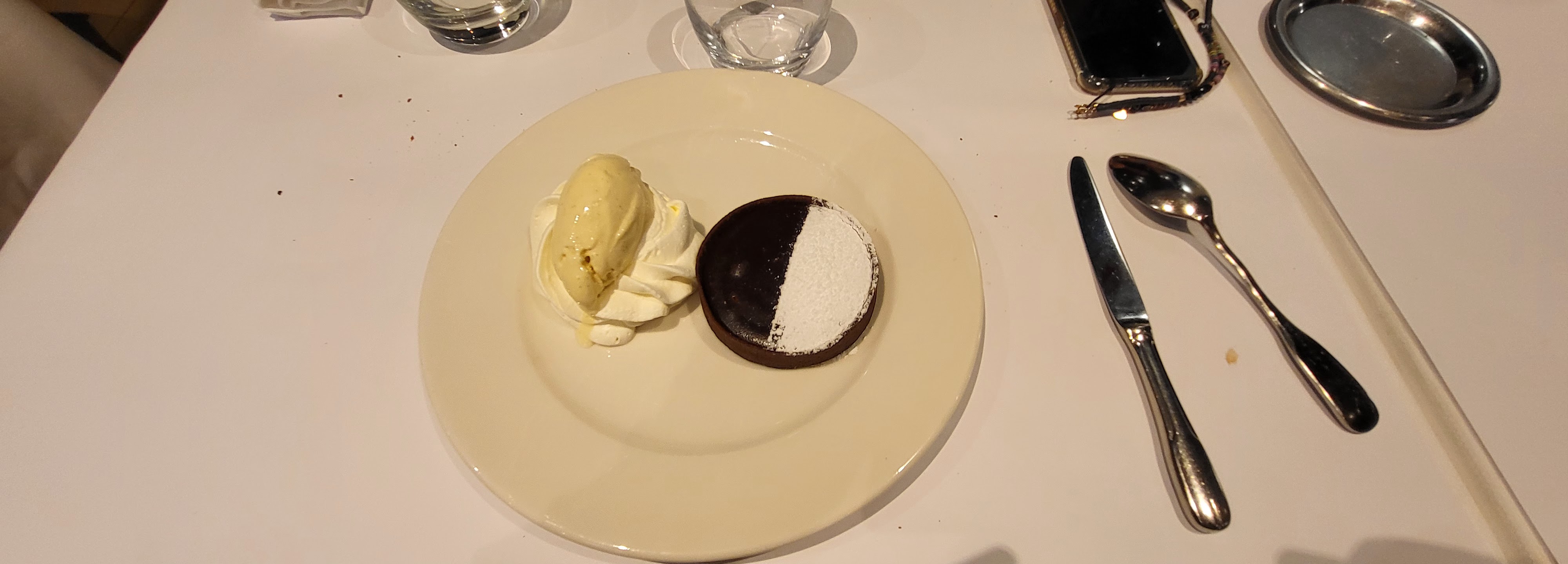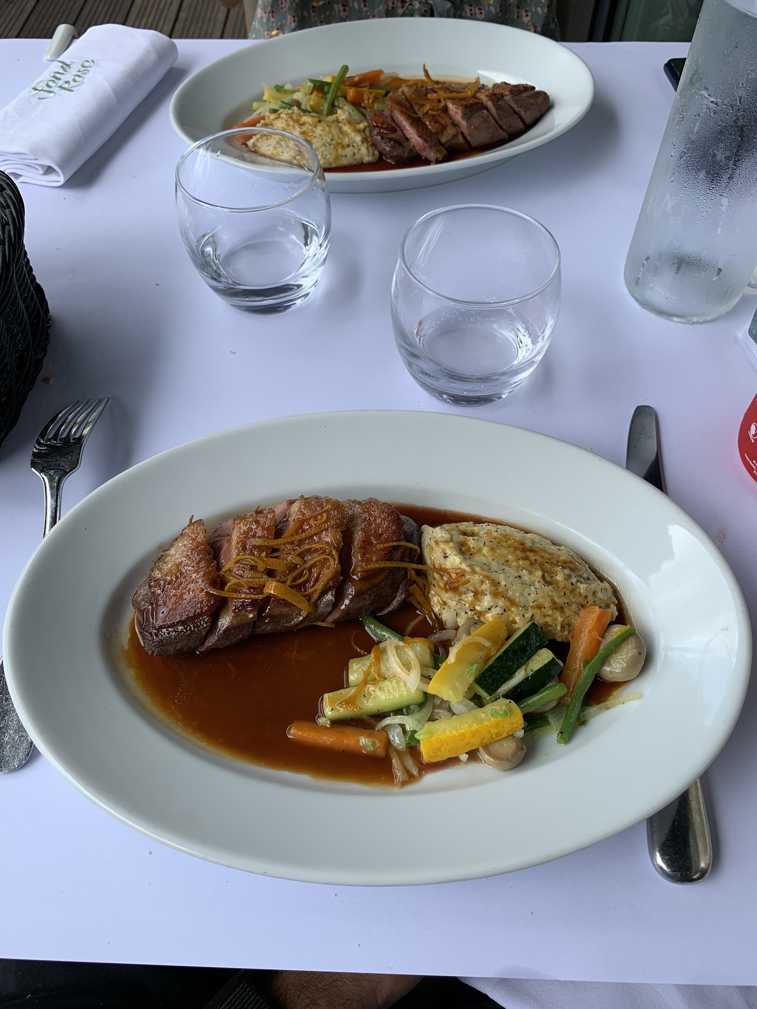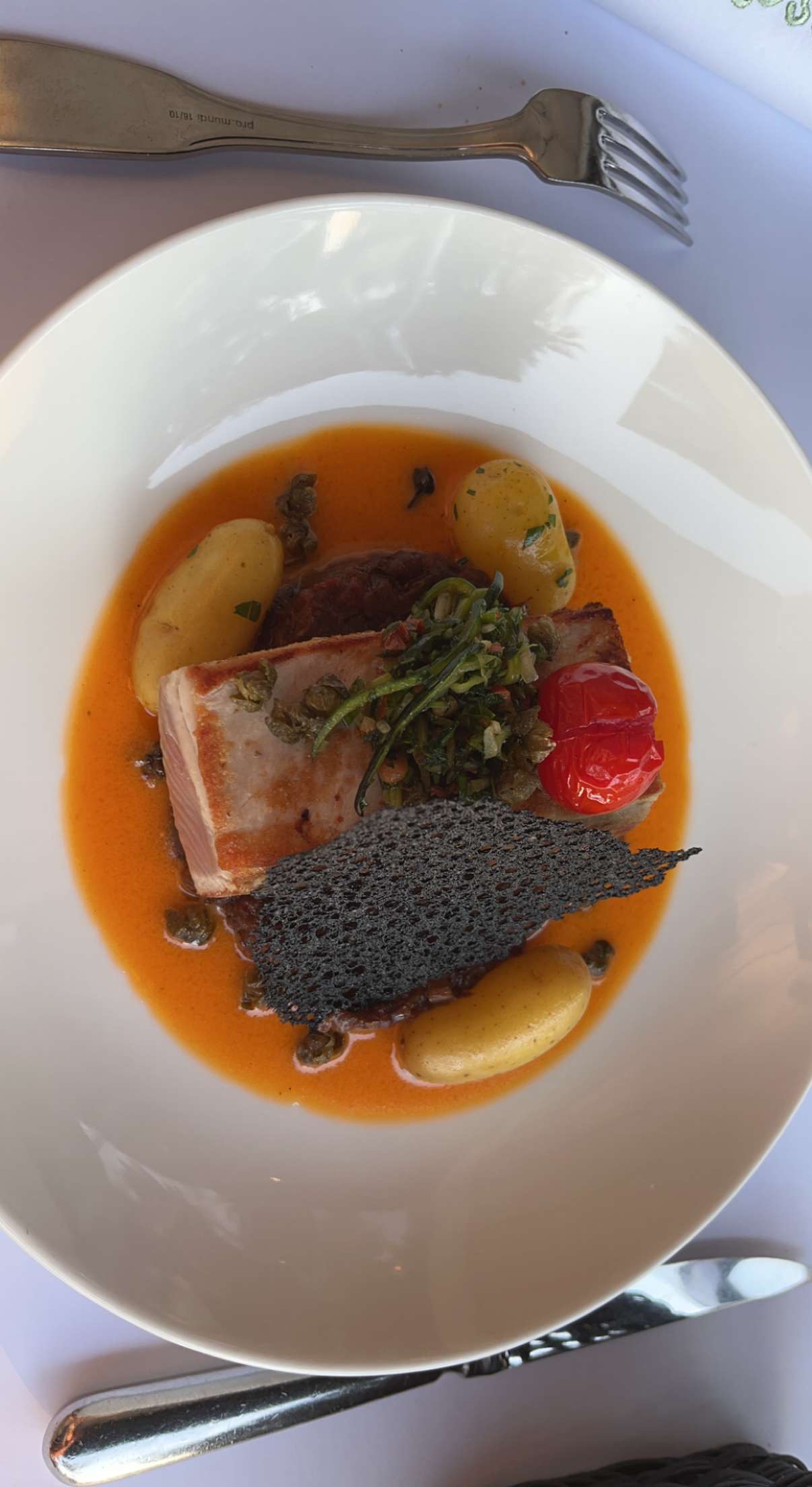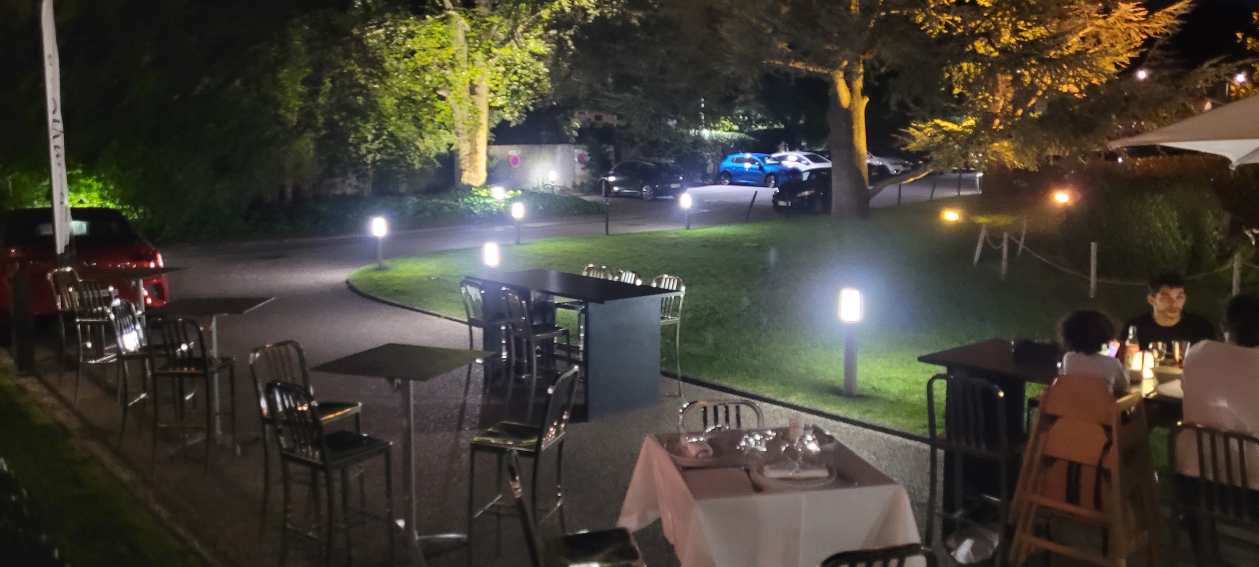 Nourriture de qualité, mais c'est attendu compte tenu du prix. Le service était correct étant donné le nombre de personnes qui dînaient. Le tartare de saumon était bien assaisonné et frais, le canard était parfaitement cuit et la sauce bien préparée, le dessert était bon mais j'essaierais autre chose la prochaine fois. Le seul problème était la pluie, ils devraient mieux préparer les sièges extérieurs pour permettre une plus grande couverture. Le groupe avec lequel j'étais a dû déplacer la table et se serrer les uns contre les autres pour ne pas se mouiller.