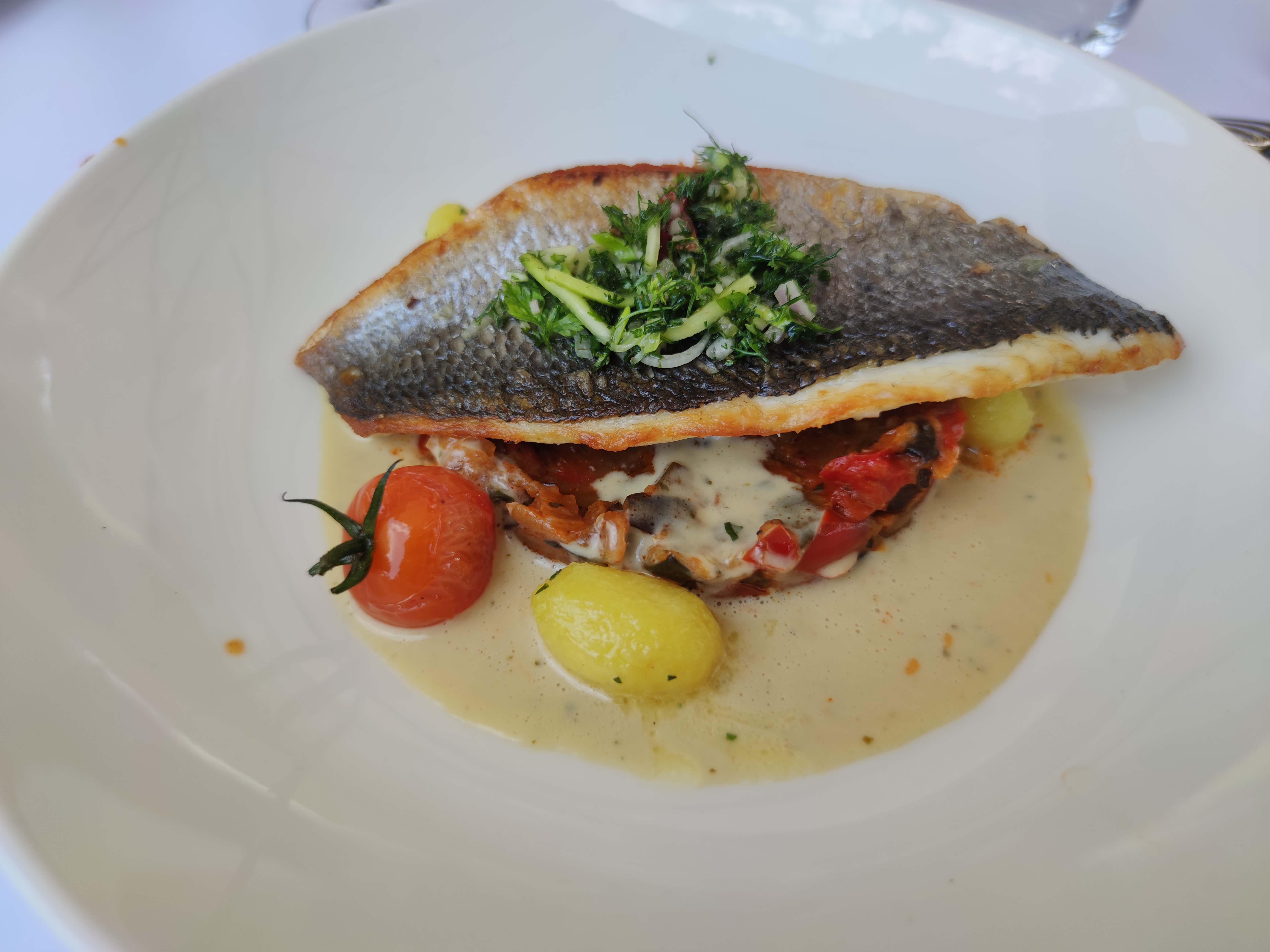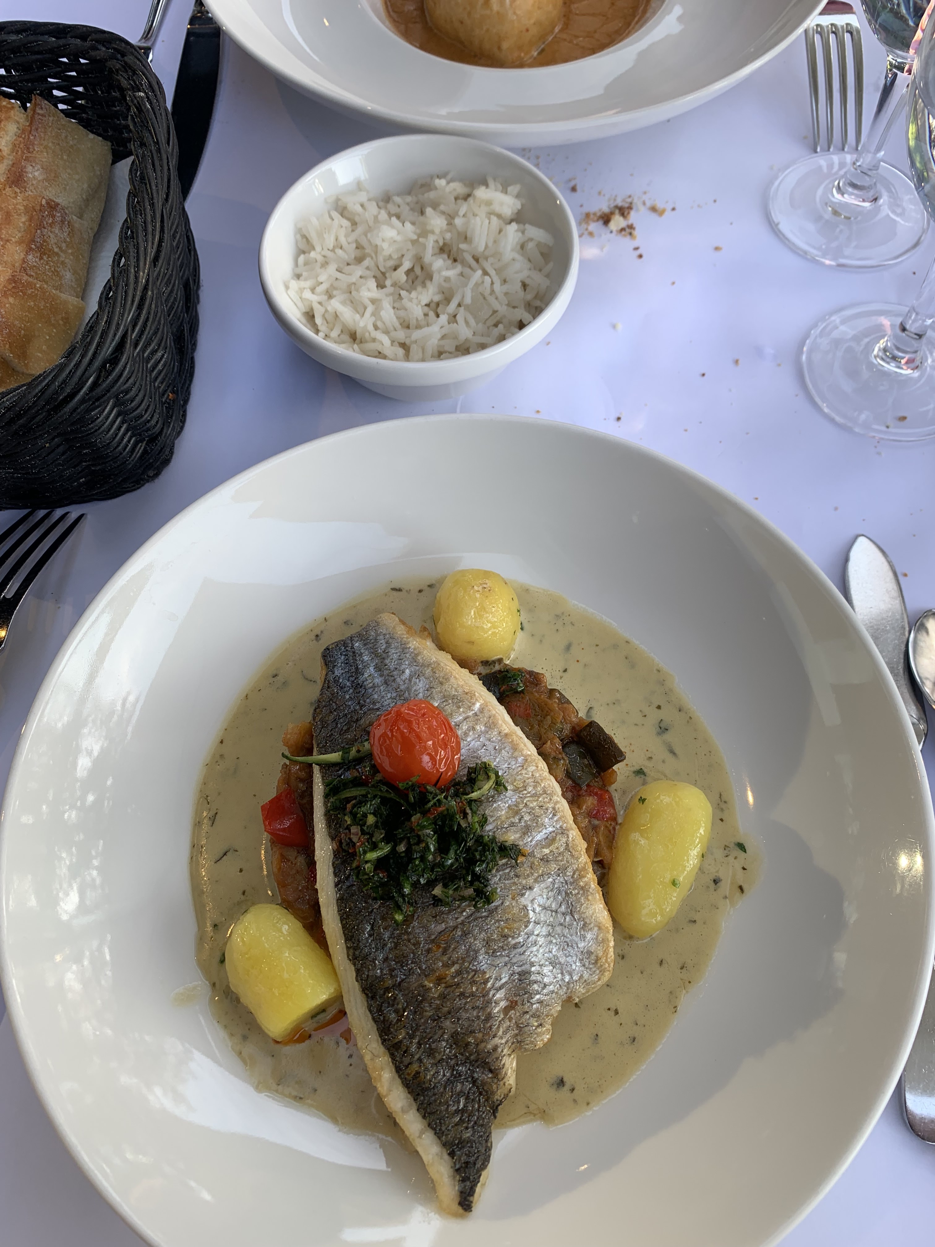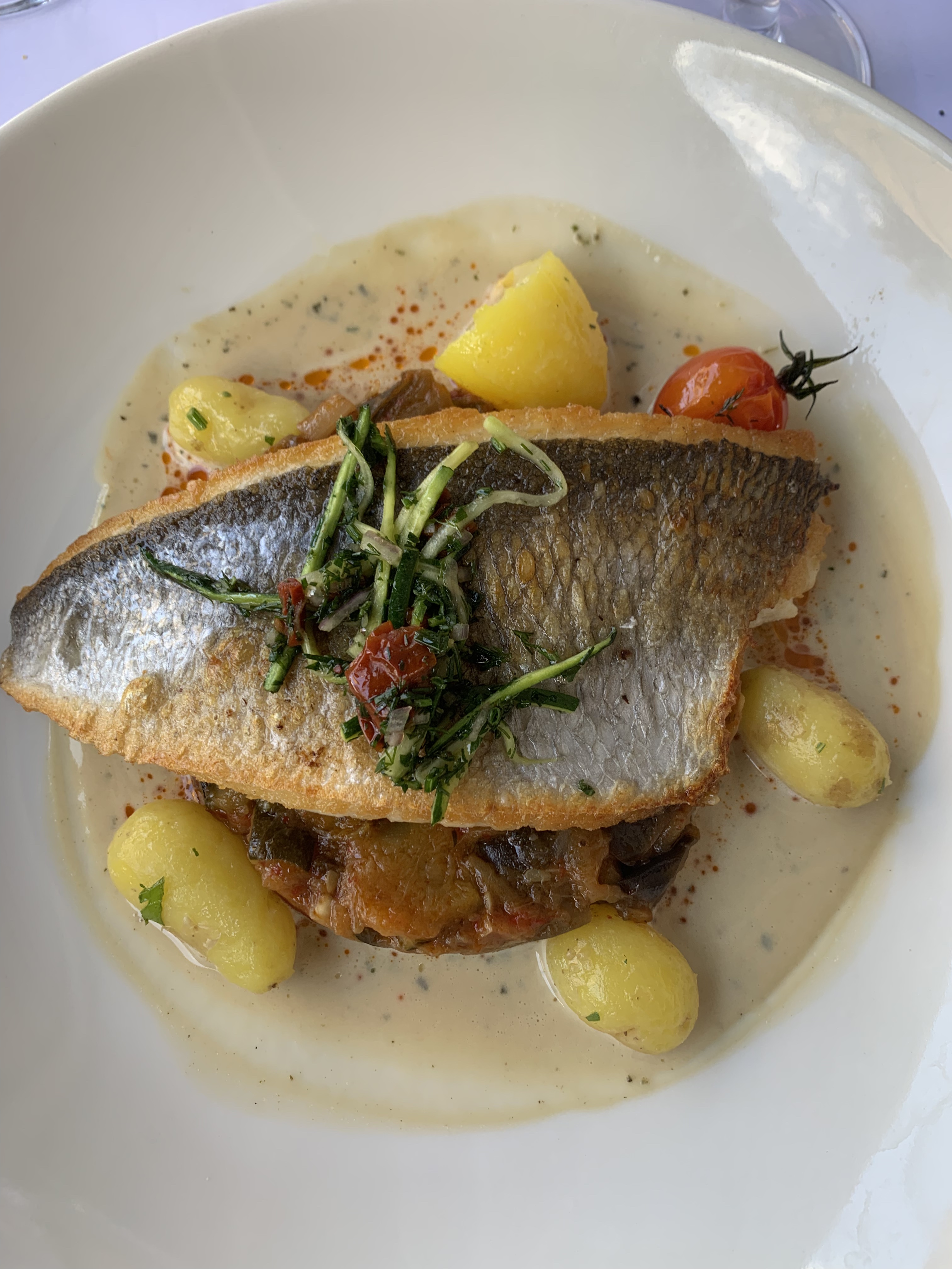 Absolument décevant. L'emplacement est magnifique, mais cela commence par une couverture en papier sur les tables et des parasols usés. Mais le plus décevant était la nourriture et le service. Nourriture : clairement préparée à l'avance dans l'assiette, la salade de tomates sortait directement du frigo, la présentation mais surtout la qualité n'était pas à la hauteur de ce qu'on attend. L'autre entrée était trop froide aussi (aubergines barbecue à la burrata). Le plat principal, nous avons pris le poisson le plus cher et il était cuit à mort (trop cuit). Service : trop de monde pour une table, personne ne savait ce que nous avions commandé ou pas : on ne nous a pas demandé une seule fois d'avoir un vin avec notre carte. Après avoir commandé du champagne pour l'apéritif, les verres à vin ont été retirés de la table sans rien demander. Certainement trop cher pour ce que vous obtenez et je recommanderai ce restaurant à mes collègues et à ma société basée à Lyon. Le nom n’est pas la clé du succès.