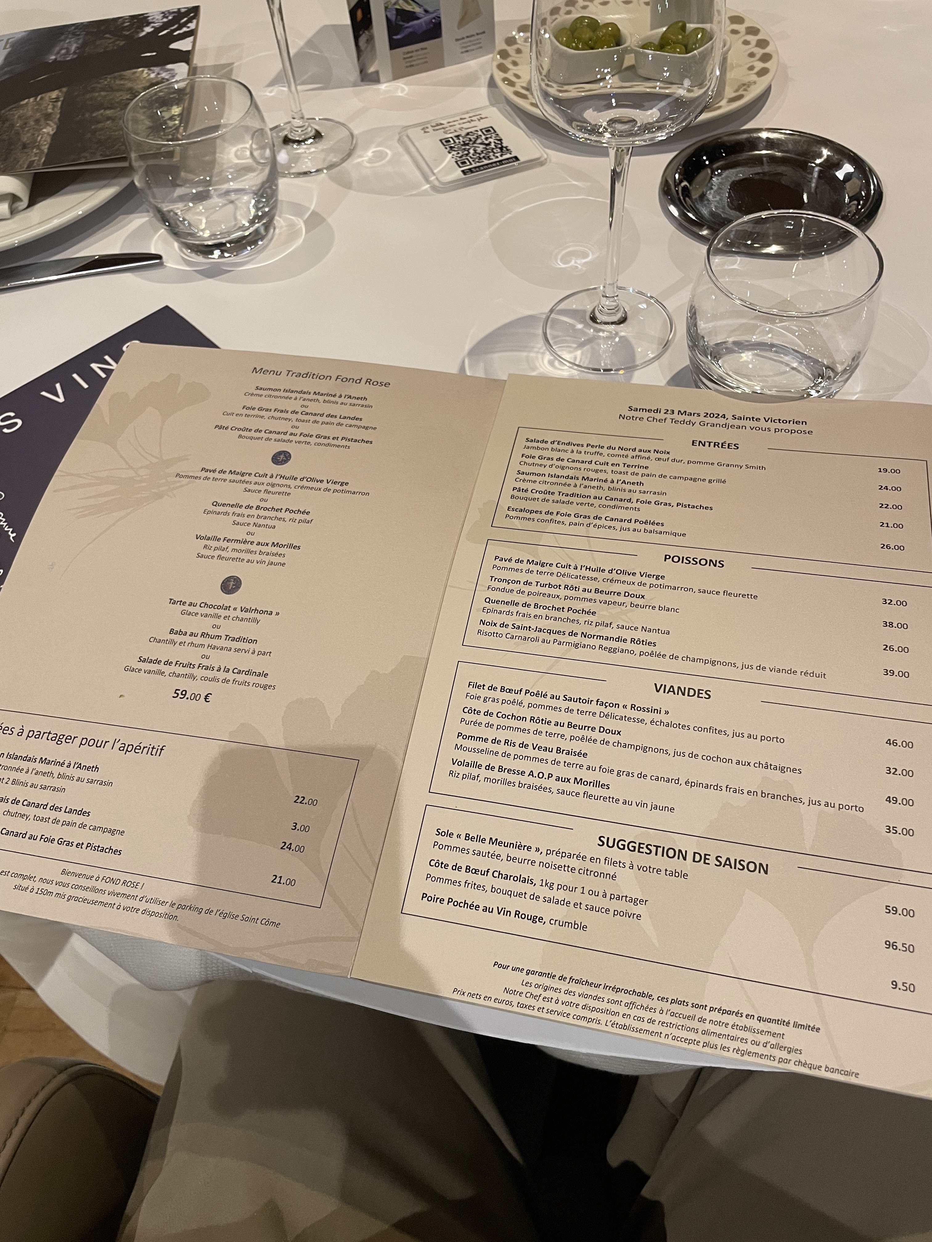 Là Fond Rose, on touche le fond !... 3 menus tradition à 60€ commandés... 6 olives chichement offertes à l'apéritif. Service du Saint Joseph... 3 fois la serveuse tachera la nappe (la nappe ! que dis-je, la feuille de papier)... Foie gras servi avec un pain carbonisé... Une fois le foie gras desservi, on nous propose le café... Dix minutes plus tard, on nous dresse les couverts à dessert ! On s'énerve devant tant d'approximations. Voilà enfin les volailles aux morilles... Servies tièdes... Retour en cuisine...10 minutes plus tard, on peut enfin déguster le plat principal. Dommage, le riz pilaf est froid. Avant le service du dessert, on nous repropose un café. Voilà le dessert. Rien à signaler, puis le café avant même la fin du dessert.. Mais surtout pas de petits gateaux, genre financiers ou madeleines, même pour un menu à 60€. Tout part à vau-l'eau. Au moment de payer, le serveur recueille notre argent et notre insatisfaction et s'étonne que l'on puisse mettre un commentaires négatifs sur Google Maps en disant ceci ne peut-il pas rester en nous ?.... Cela faisait au moins la 10ème fois que l'on venait en 5 ans... Personnellement, c'est probablement la dernière.