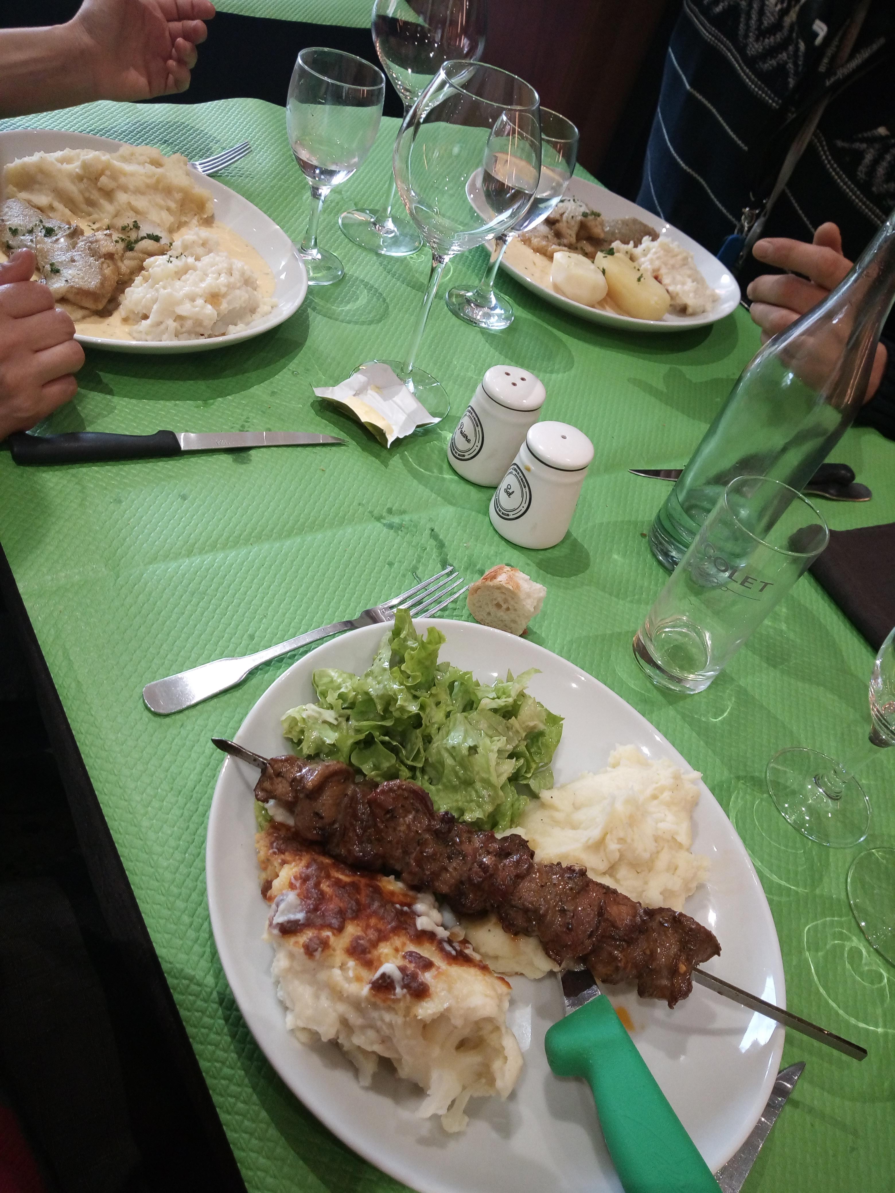Plats types brasserie (piece de viandes, assiettes charcuteries, cuisse de grenouille, poisson, etc.) et assiettes très copieuses. Bon rapport qualité/quantité prix. Nous y sommes passés le midi et nous y avons bien mangé. Patron à l'écoute.
