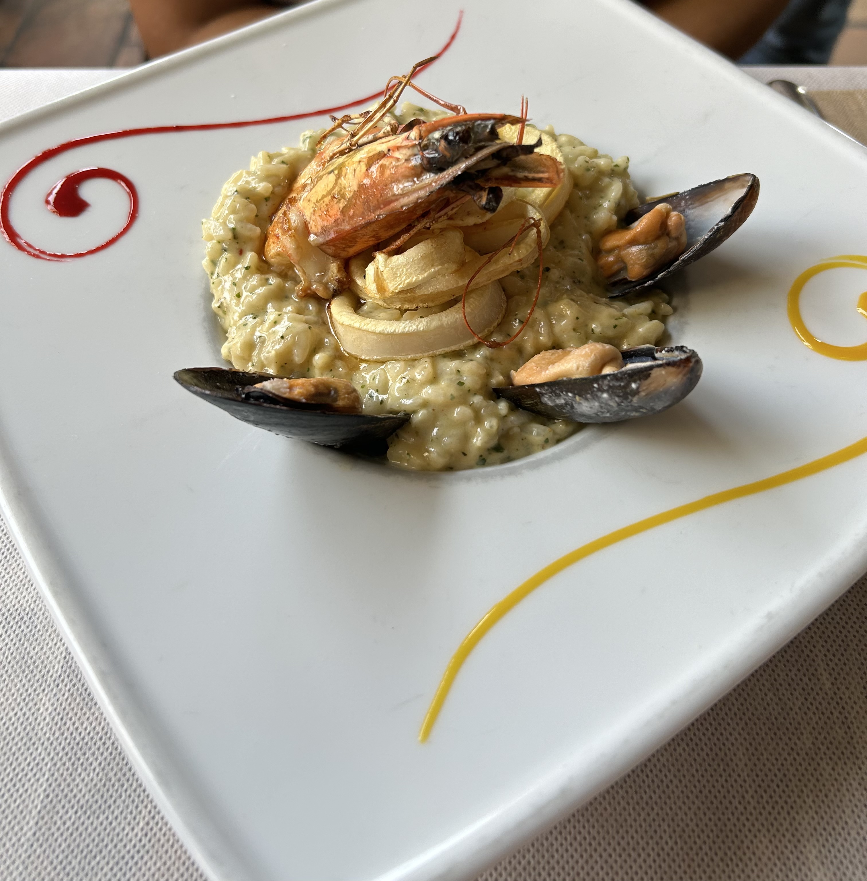 Bon et copieux, J’ai pris le risotto aux fruits de mer qui est normalement une entrée et j’ai été largement rassasié. Il était succulent. La serveuse était adorable Le restaurant offre une vue dégagée sur le port de Porto Veccio.