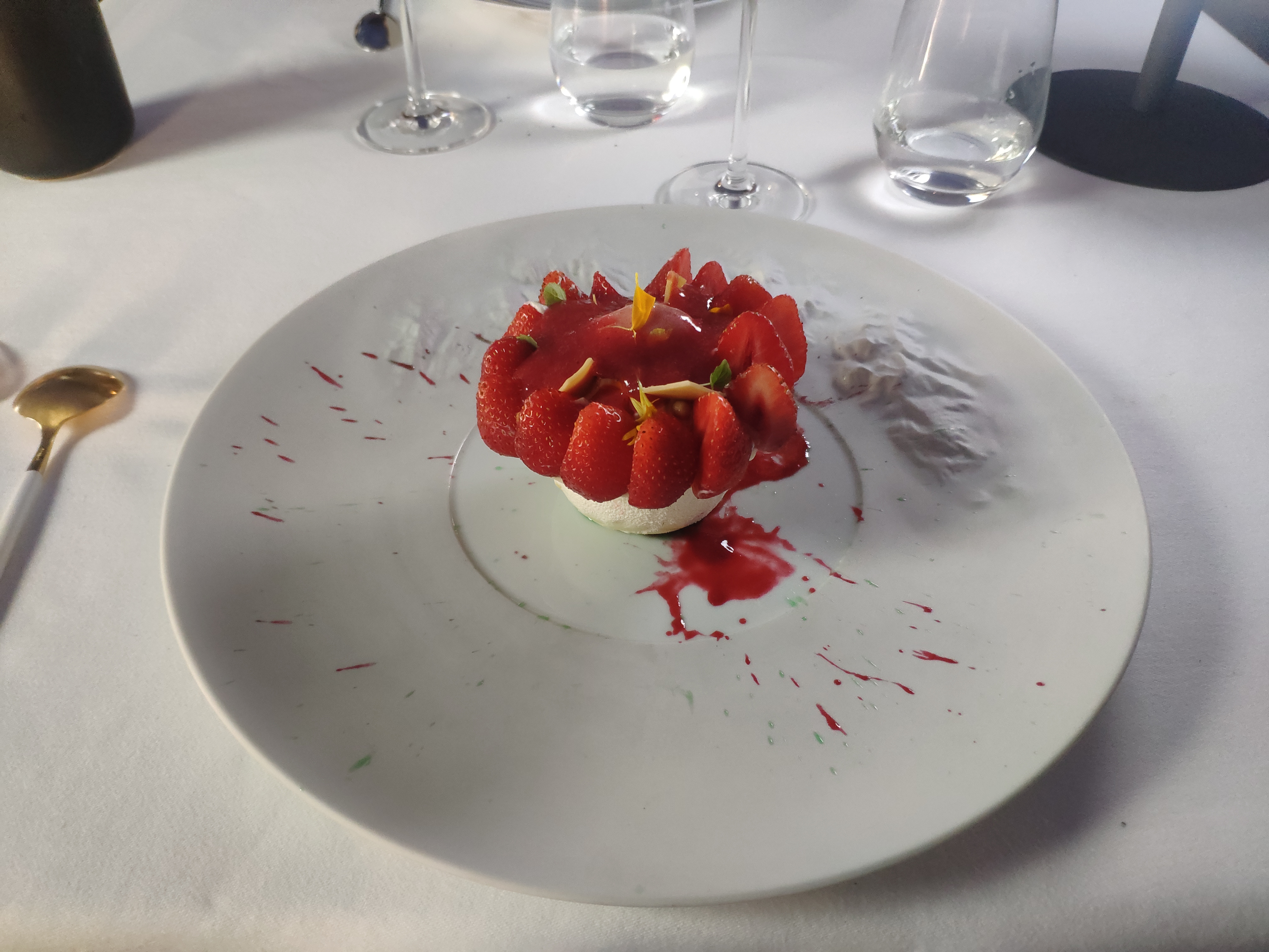 Rapport quantité-prix qui frise l'arnaque. Le cadre est agréable et très raffiné, et en terrasse, nous avons apprécié. Le service est très correct pour un restaurant gastronomique. Cependant, les quantités sont trop petites. on a pensé que ce n'étaient que des amuses bouches tout le long du repas ! Les plats sont très créatifs et visuellement c'est très beau mais trop peu à chaque plat. Le gaspacho était trop épicé pour moi, et pas exceptionnel en terme de découverte gustative. La gambas ( encore une fois, 2 morceaux dans l'assiette ) bonne mais sans plus. La viande beaucoup trop salé. Nous avons l'habitude de manger dans des restaurants étoilés, celui là n'est pas à la hauteur. L’assiette de fromage est ridiculement petite même si les minis portions de fromage sont excellen, je pense que les confitures qui les accompagnement sont servis à la pipette. En revanche, le dessert à la framboise était excellent et très bien exécutée et en quantité suffisante. Le pain est très bon. Bref, nous avons pris le menu Apostrophe avec les vins en dégustation. Nous avons été déçu. Dommage