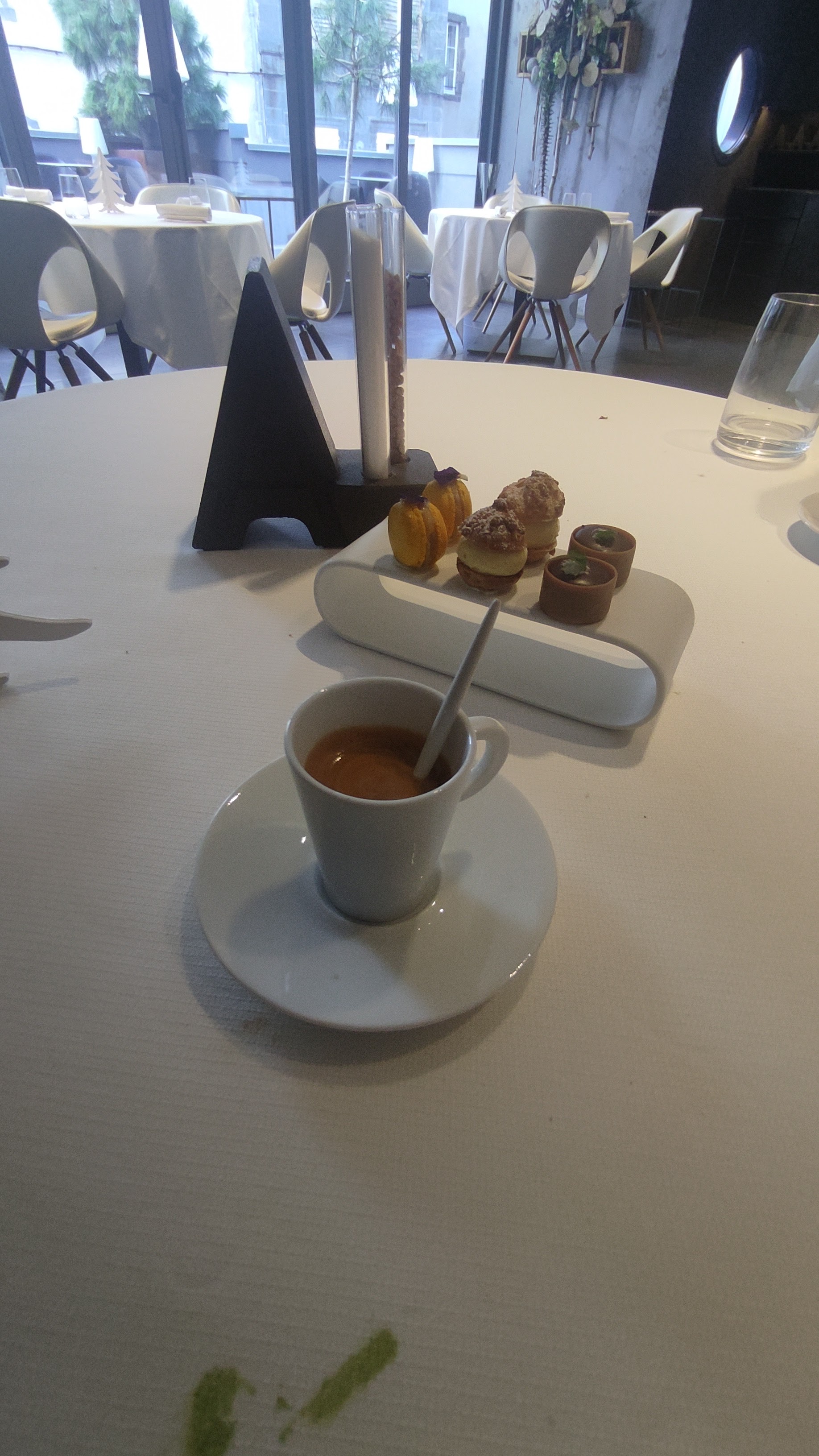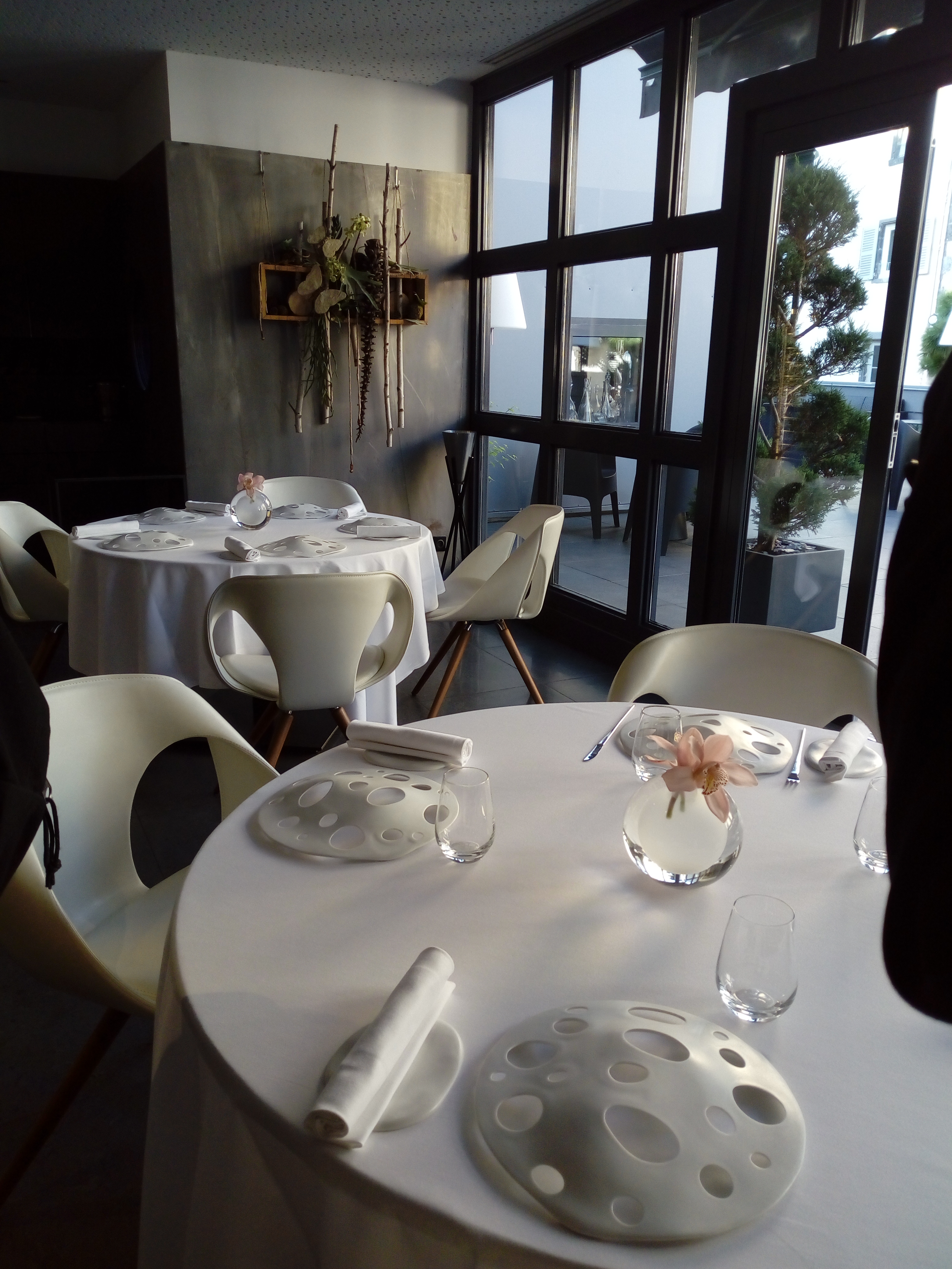 Désolé pour la cigarette sur la terrasse. Mais sinon excellent repas, super service, très belle présentation de la nourriture dans une ambiance sobre mais intense en intensité. La motricité de la disposition des couverts sur le porte repas joliment décoré de blanc, et vice et versa.