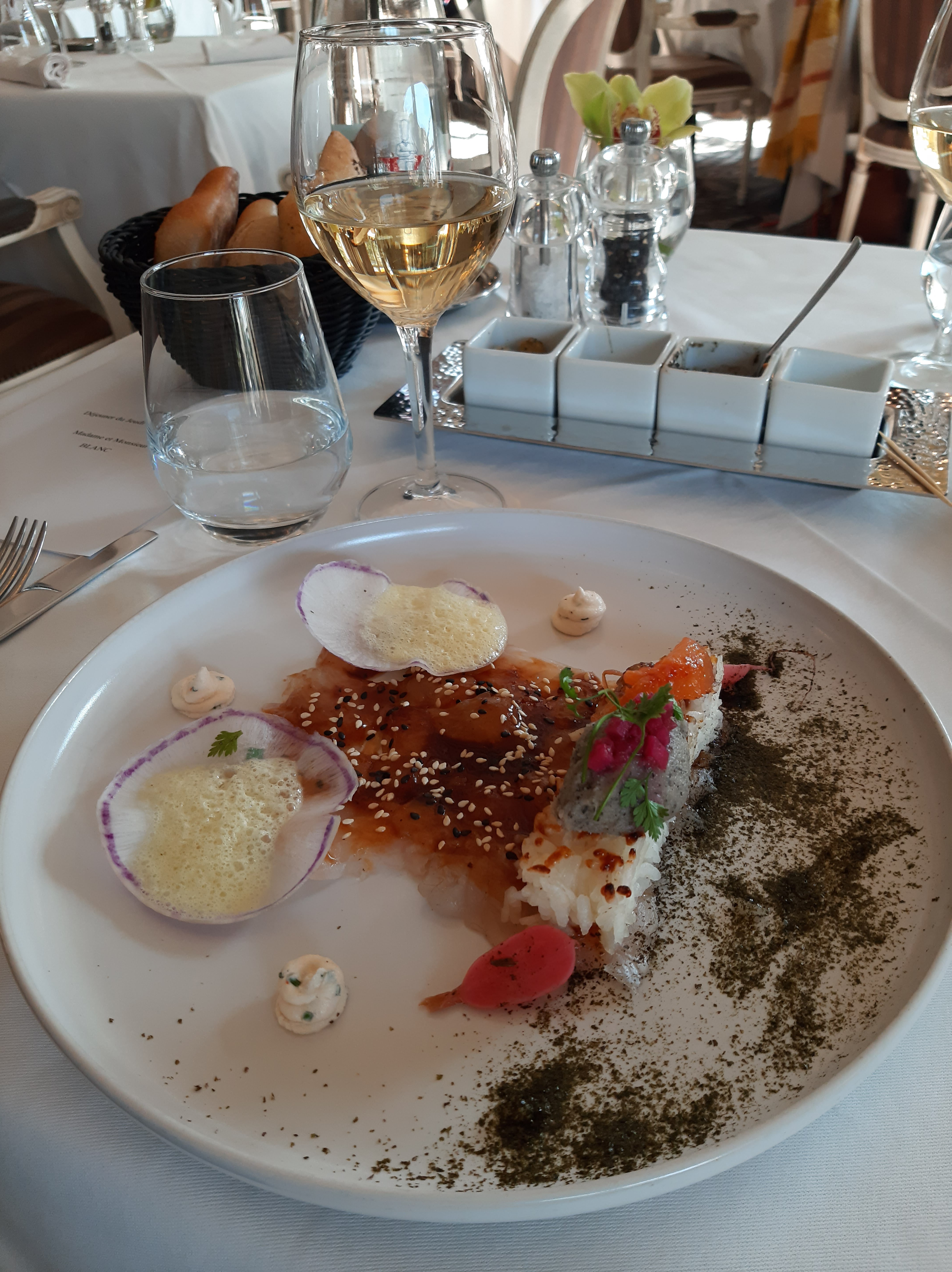 A part des coquilles Saint Jacques extraordinaires, nous sommes globalement déçus par tous les autres plats sans exception, le foie gras justement gras et amer accompagné par une foultitude d'assortiments et pas mal d'acidité très désagréable qu'on retrouve d'ailleurs dans le maigre vraiment très maigre d'ailleurs et perdu au milieu d'un catalogue de goûts très divers, dont l'assortiment laisse perplexe, ou nous nous sommes perdus et toujours une grosse grosse pointe d'acidité. On pensait que le dessert alliance de trois chocolats allait sauver les meubles mais c'était vraiment très lourd, écoeurant et pas à la hauteur du tout. Bref du coup le repas est devenu très cher et on s'est pris à regretter notre choix... de restaurant. En conclusion il y a longtemps que je n'ai pas passé un aussi mauvais moment dans un restaurant surtout que le service était très lent et ça venait de la cuisine. Dieu Merci le personnel a été parfait, discret tout en étant présent et efficace avec une pointe d'humour. Magnifique mais ce n'est pas suffisant.