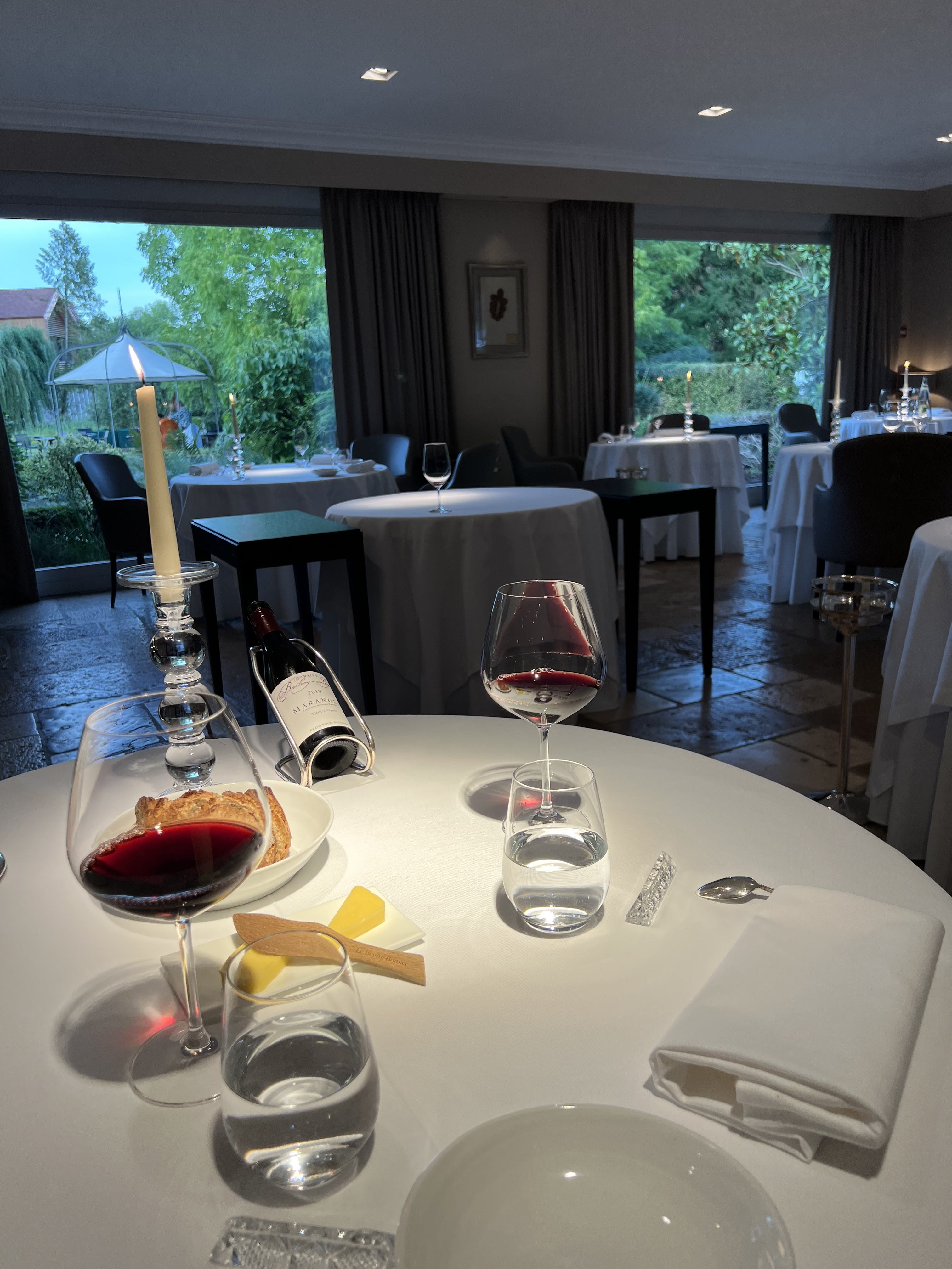 Nous avons vraiment apprécié le menu gastronomique avec 3 entrées de ce restaurant. Les plats sont magnifiquement coordonnés les uns avec les autres et également une parfaite coordination des goûts dans les plats eux-mêmes. Nous avons pensé que le plat de poisson aux coques et moules était le plat le plus savoureux... puis le pigeon, particulièrement bien cuisiné. La carte des vins de ce restaurant est extrêmement vaste, même si le choix de vins si vous ne prenez qu'un verre est quelque peu limité à 3 vins rouges différents. Le dessert contenait beaucoup de chocolat. C'était agréable de prendre un café et de déguster au coin du feu. L'ensemble du restaurant est situé dans un magnifique jardin avec un beau bâtiment dans lequel se trouve le restaurant. Je recommande vivement ce restaurant. le rapport qualité/prix est certainement bon.