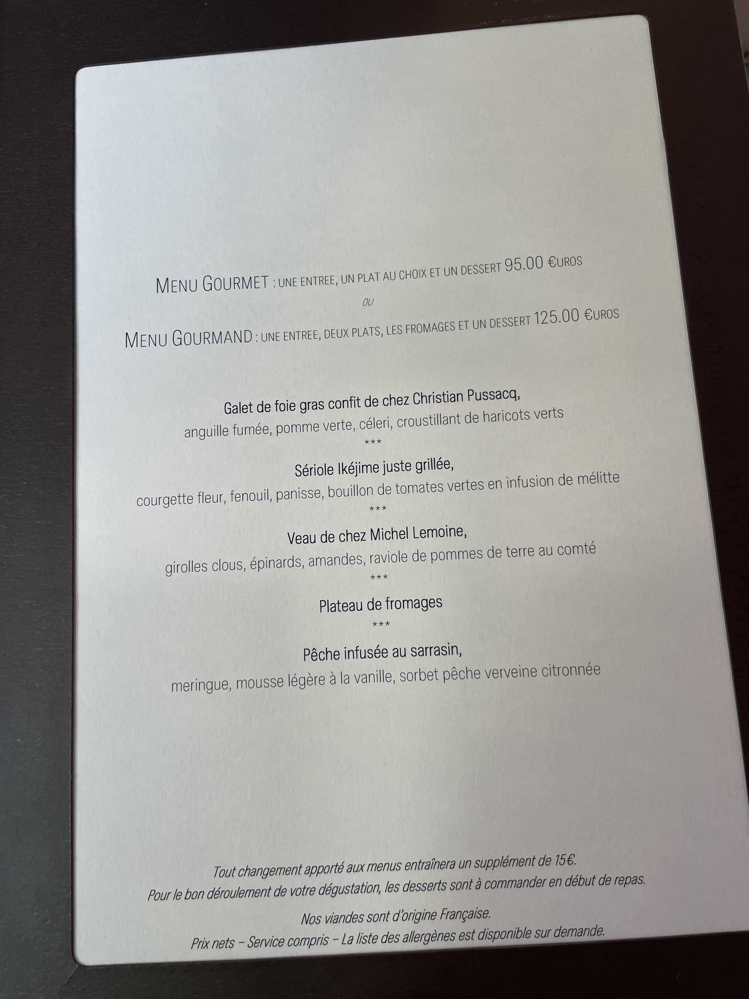 Il est étoilé Michelin et le service et les coûts sont à ce niveau. Deux constats que je suis heureux de vous faire : je pense n'avoir jamais rencontré un Maître d'hôtel aussi compétent, doté d'un grand sens du communication pour illustrer les plats, d'une convivialité qu'on apprécie aujourd'hui autant qu'il y a 10 ans. Le deuxième constat concerne la cuisine. Très brièvement : j'ai très bien mangé !!