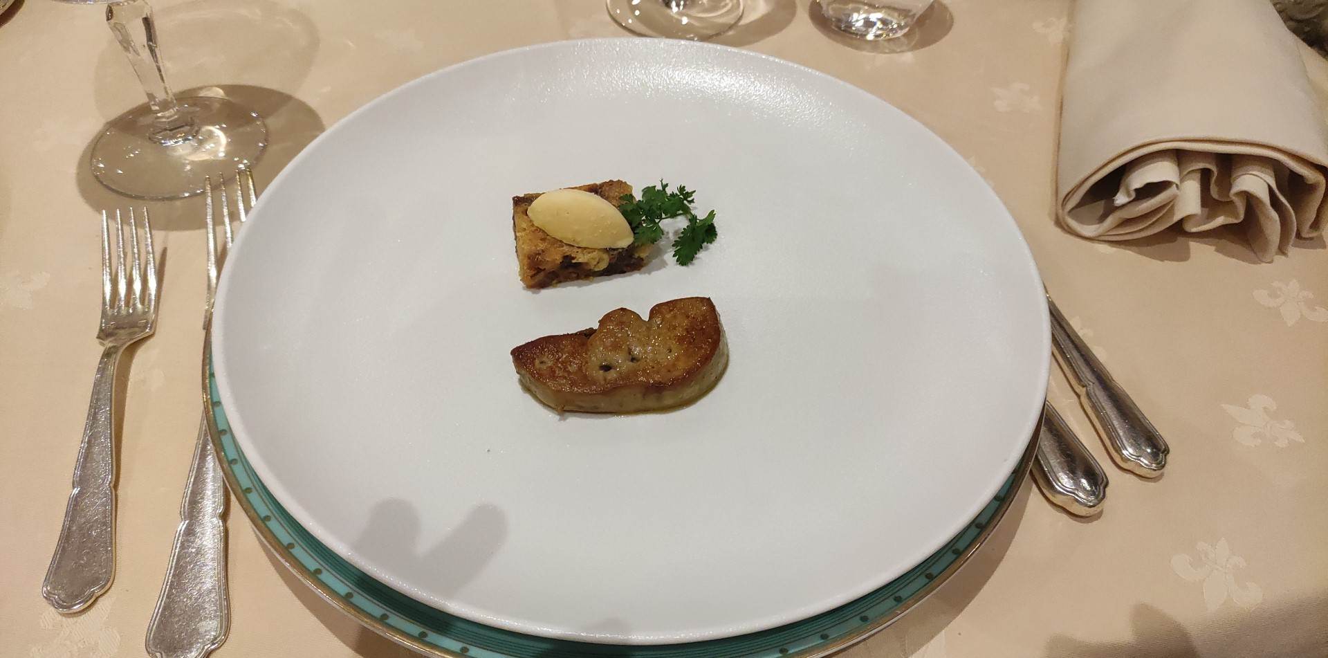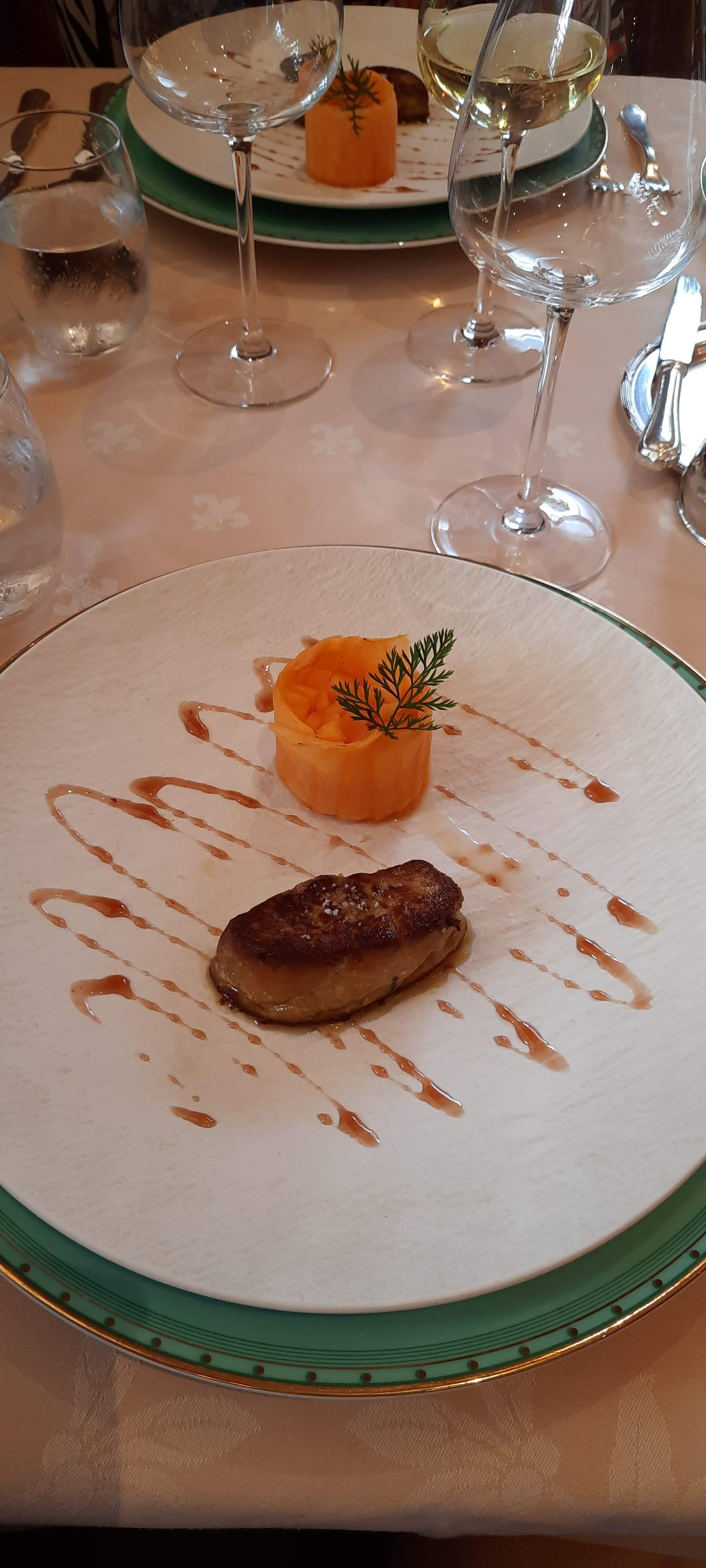 Nous avons pris le menu a 79 euros par personne: emulsion de foie gras en entree tres jolie dans l'assiette (cf photo) mais pas du tout au goût. Concernant le plat principal: la viande exquise mais accompagnements pauvres et pas cuits. Enfin dessert qualité flunch. Le vin est en moyenne a 90e la btl. Service banal. Pas de chef de rang, pas de visite d'un cuisinier en salle. En resumé: on paye le cadre, les plats ne valent pas 79 euros et le service n'est pas du tout a la hauteur.