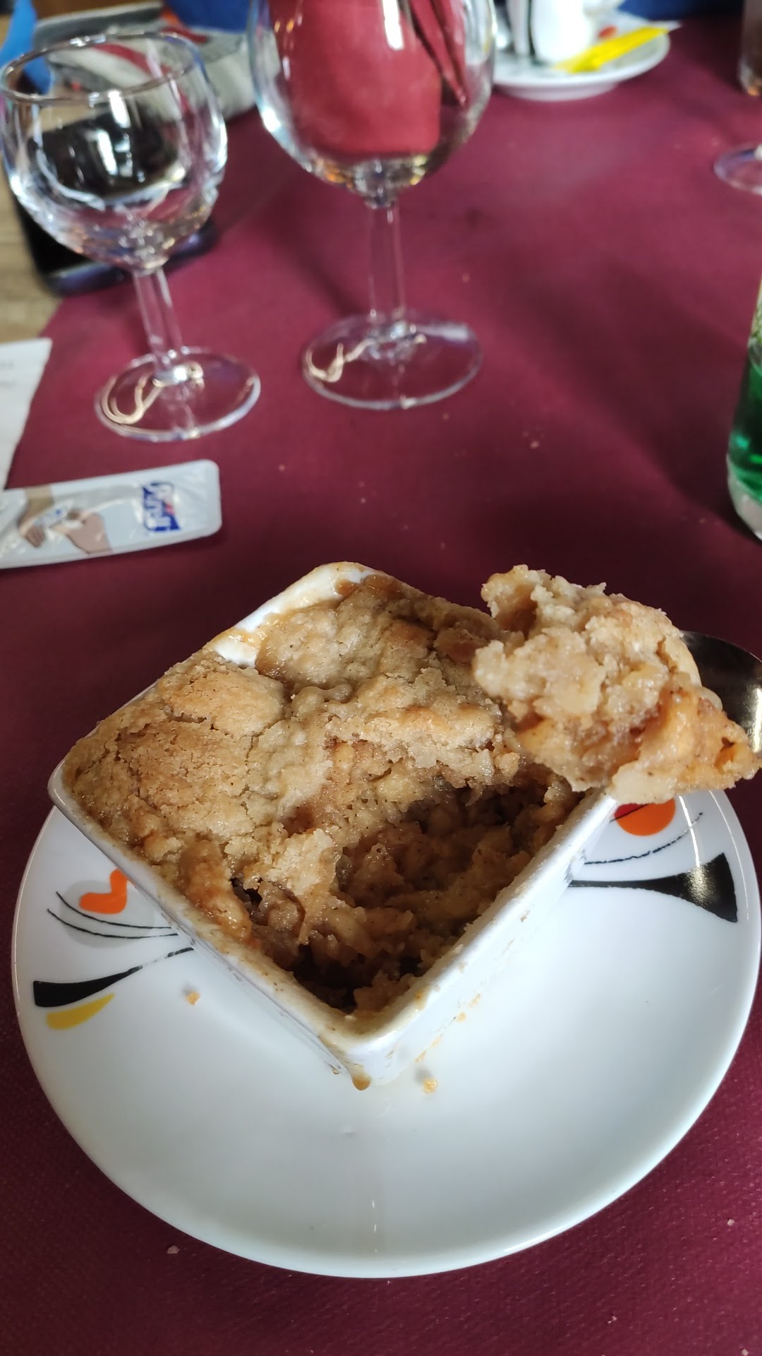 Repas en terrasse au soleil. Ragoût de sanglier et gratin agrémenté de champignons sauvages, excellents. Formule 15€ plat simple, 21€ avec dessert ou entrée , 23€ complet. Je recommande pour la qualité de la cuisine.