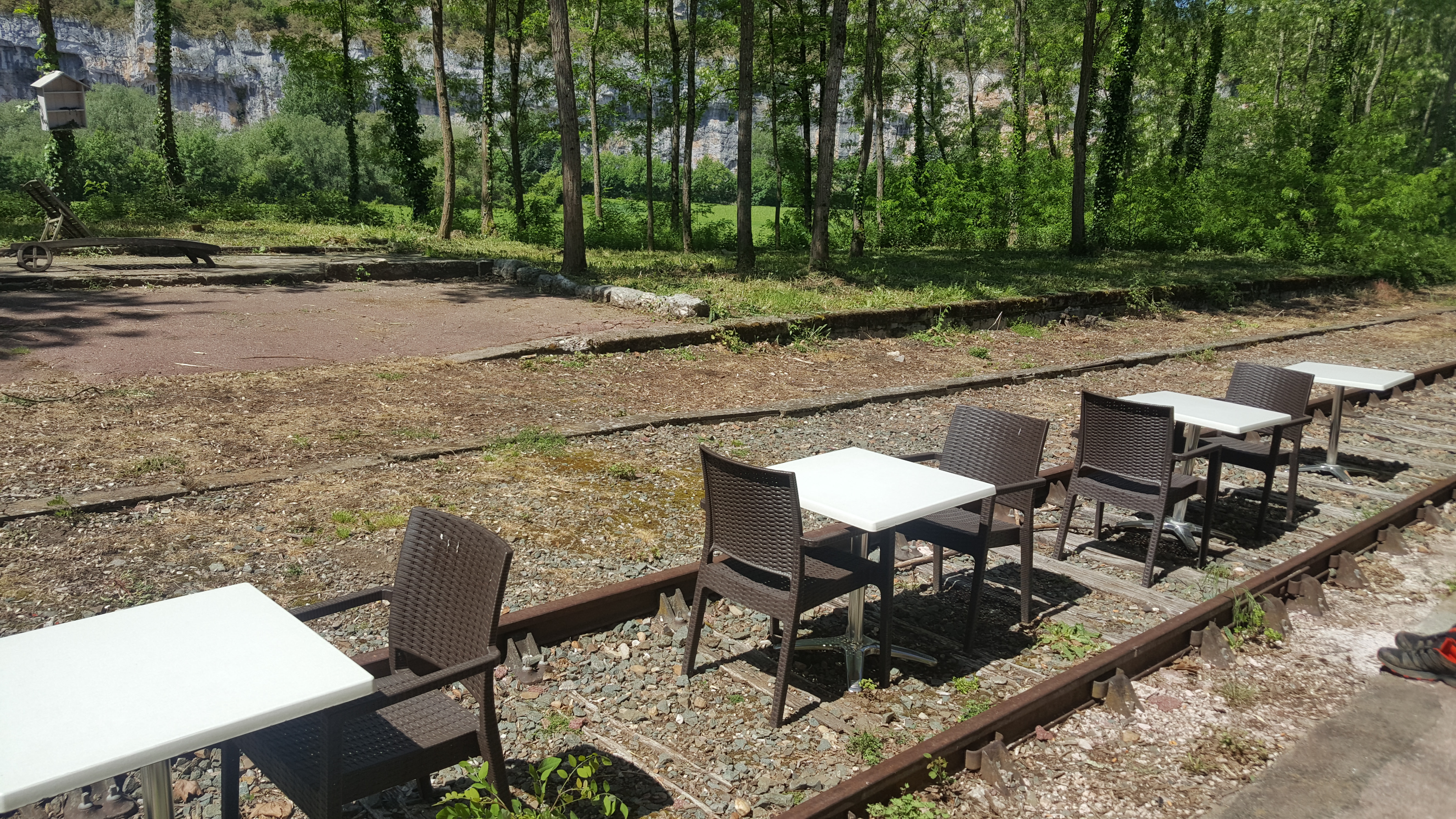 Terrasse agréable sur ancien quai de gare. Parfait pour une fin de randonnée.