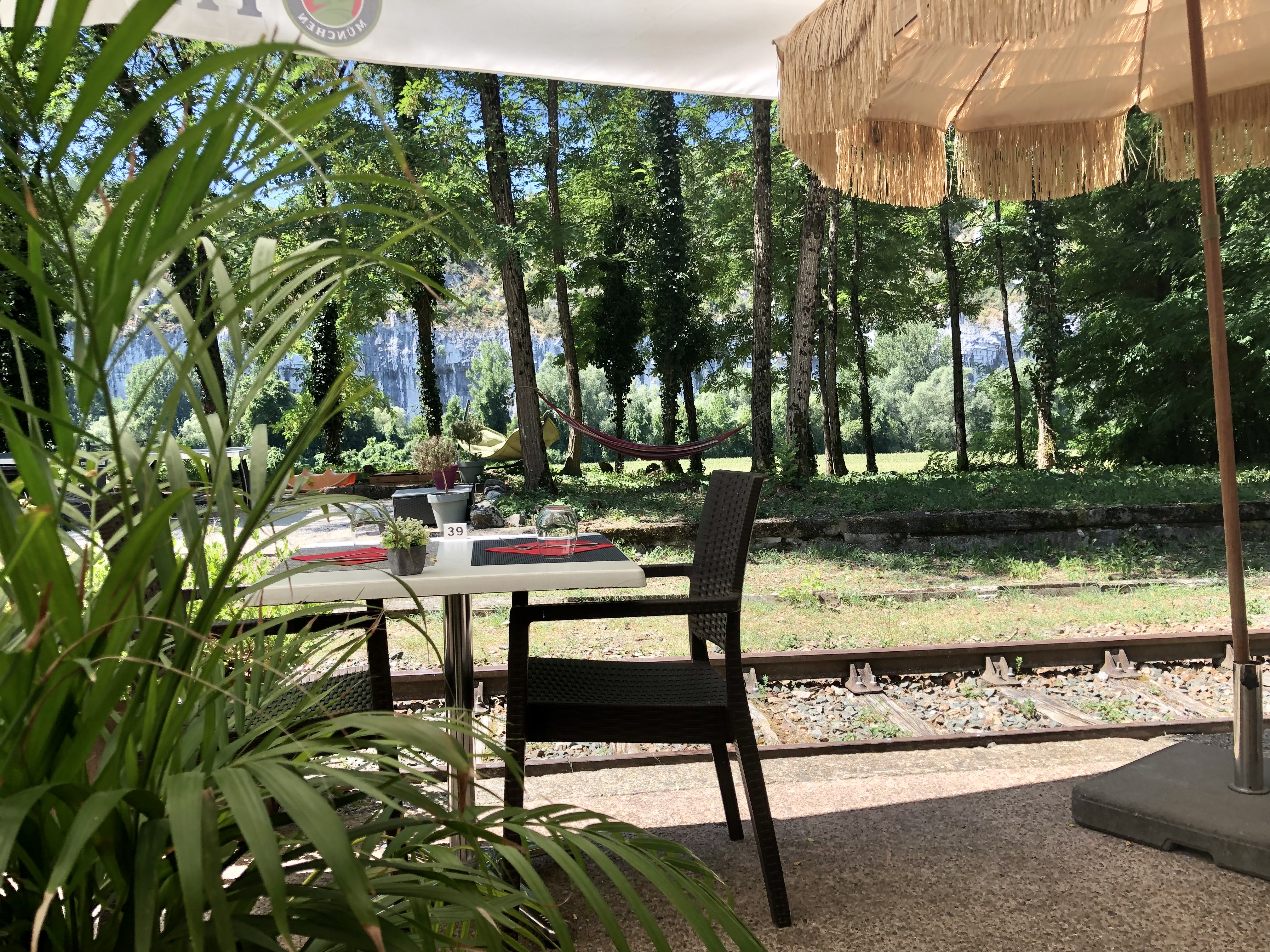 Endroit insolite : gare désaffectée avec terrasse donnant sur les rails et falaises calcaires, au pied du Lot. A découvrir sans hésitation. Personnel tres accueillant et sympathique. Cuisine simple du terroir.