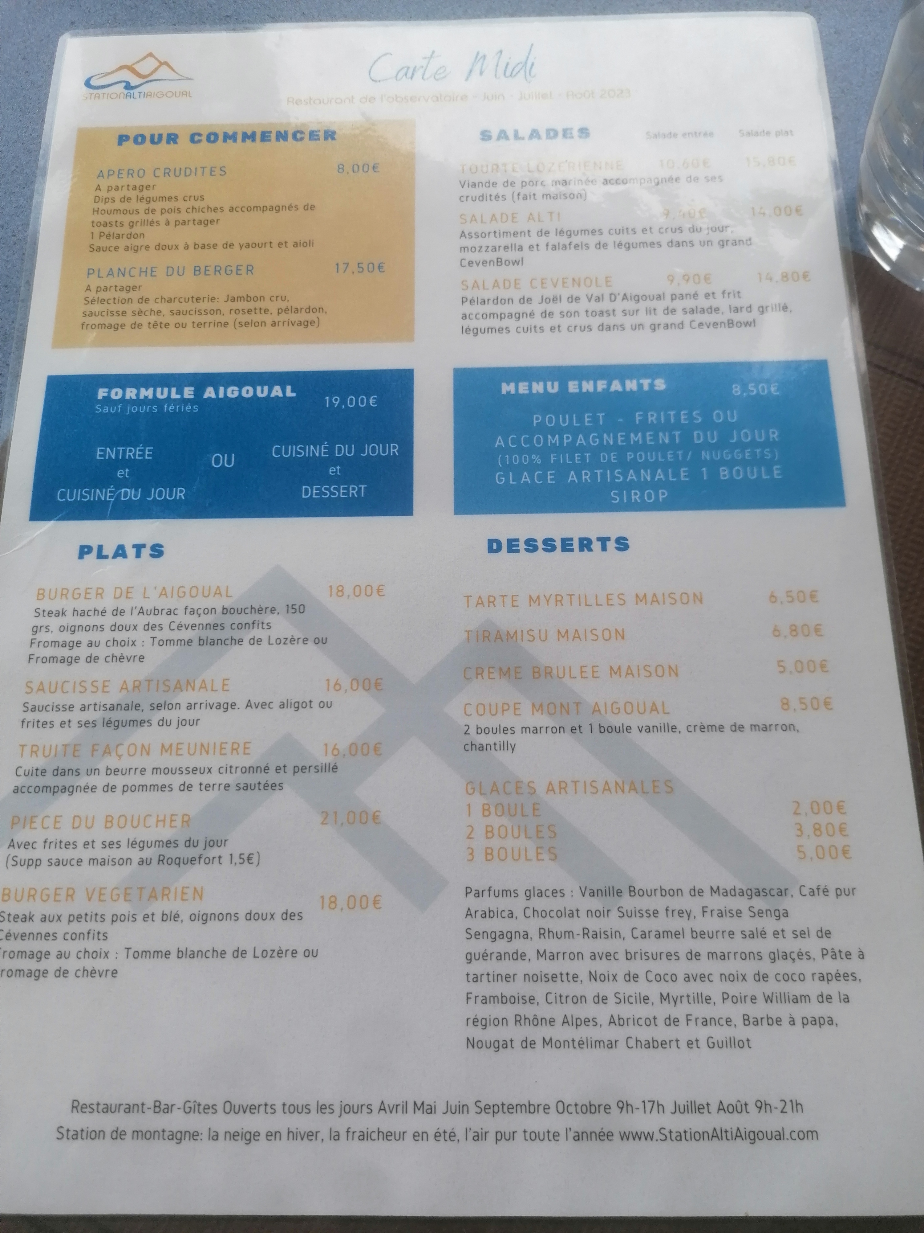 Mi Septembre. Envie d'une collation entre 15 et 16h ... Rien !!! Pas de gâteau, tartes, cookies ou autres. Et je vous laisse imaginer quand on a demandé....des crêpes ! ( réponse pas aimable) Pour le reste , il faut commander au bar ... pas de serveur ! Et pourtant...une tirelire sur le bar pour les pourboires !!!! Grand beau temps ce jour là et beaucoup de monde ... Dans la restauration il faut prévoir l'afflux de clients si besoin... 3e passage à L' Aigoual en peu de temps pour y amener des amis en vacances, et c'est chaque fois pareil... Heureusement il reste le magnifique panorama....