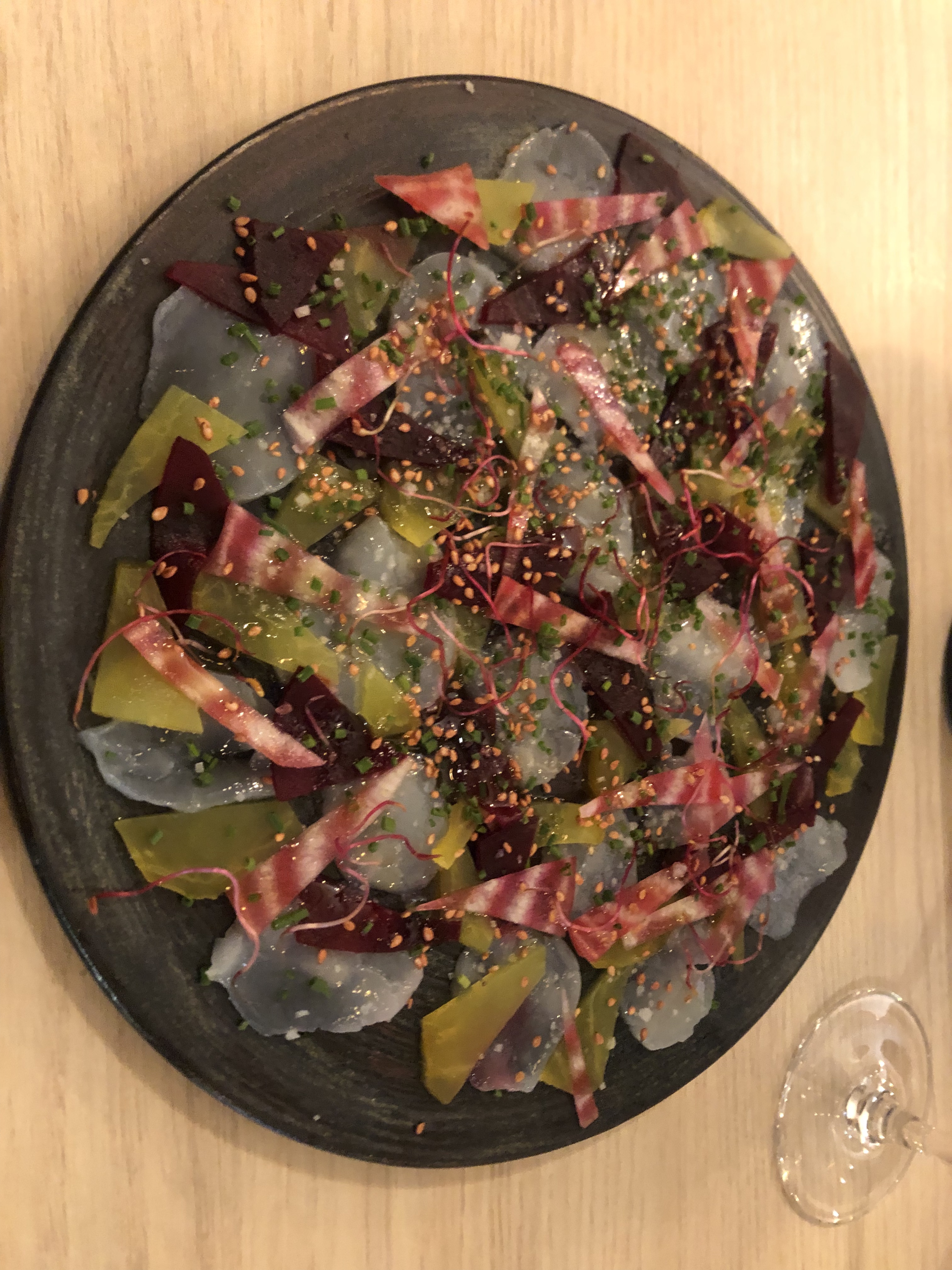 J'ai trouvé Goulu(e) en cherchant un endroit local pour dîner après une journée de visites bien remplie et je ne pourrais pas être plus heureux de cette découverte ! Le chef est venu et nous a décrit le menu du mieux qu'il pouvait car nous ne connaissions pas le français, c'était très serviable et sympathique. Nous avons eu le menu 3 plats pour 40 €. Nous avons tous essayé différentes choses et elles étaient fantastiques. C'était aussi très agréable de voir le chef depuis la cuisine ouverte. Je suis sûr que le menu change fréquemment, mais la ratatouille, le ceviche, le veau et le thon étaient des plats remarquables. Le dessert était fantastique. Si vous séjournez dans la région, c'est le répit idéal après une journée bien remplie, un endroit où vous pourrez vous détendre et profiter.