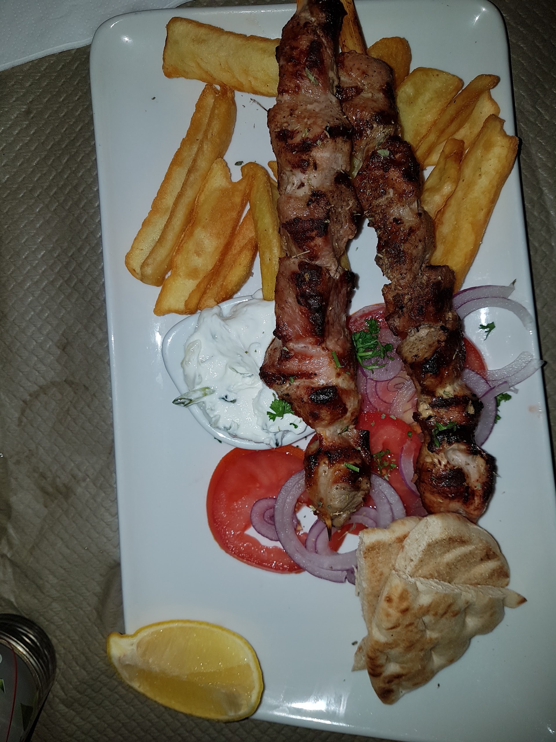 Très bien, vin rosé grec très bon. Souvlaki (brochette poulet) très bon, un goût de trop peu. Par contre les cartes des menus à revoir, elle ne donne pas envie alors que nous avons très bien mangé. Un gros + pour le personnel très discret et très agréable.
