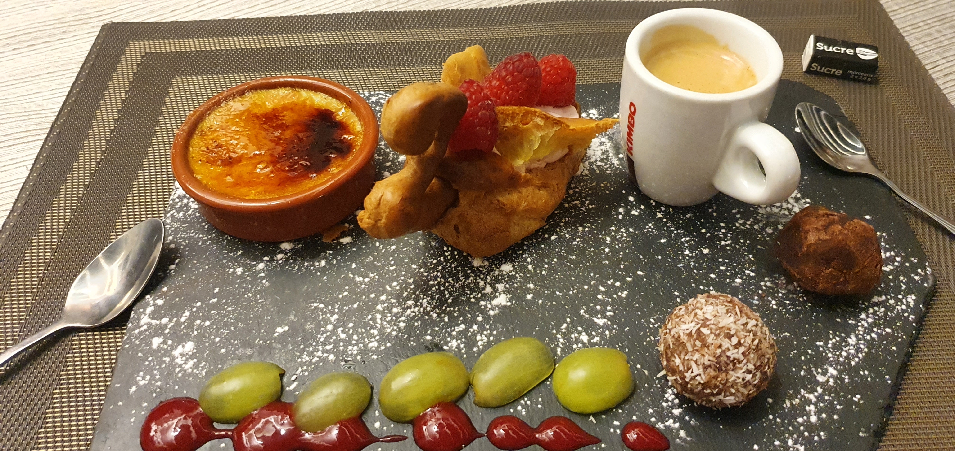 Très bon,quantité suffisante café gourmand super! Ambiance chaleureuse un peu bruyante mais logique quand il y a du monde! Impec.