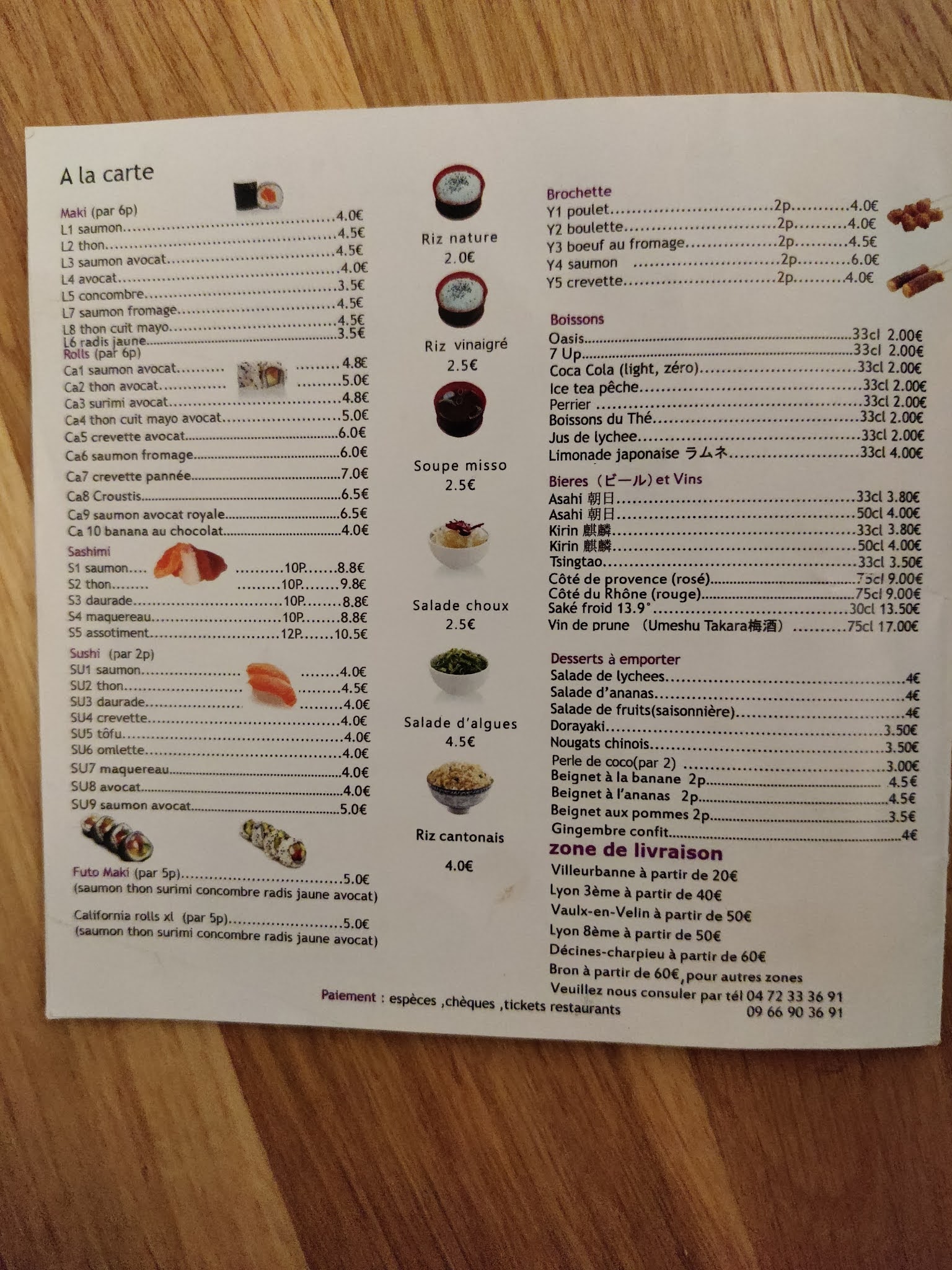 Excellent restaurent! Livraison rapide ça fait 2 ans que je commande chez eux jamais une erreur et toujours chaud! Les plats et les sushis sont succulents, un des meilleurs chinois de Lyon!