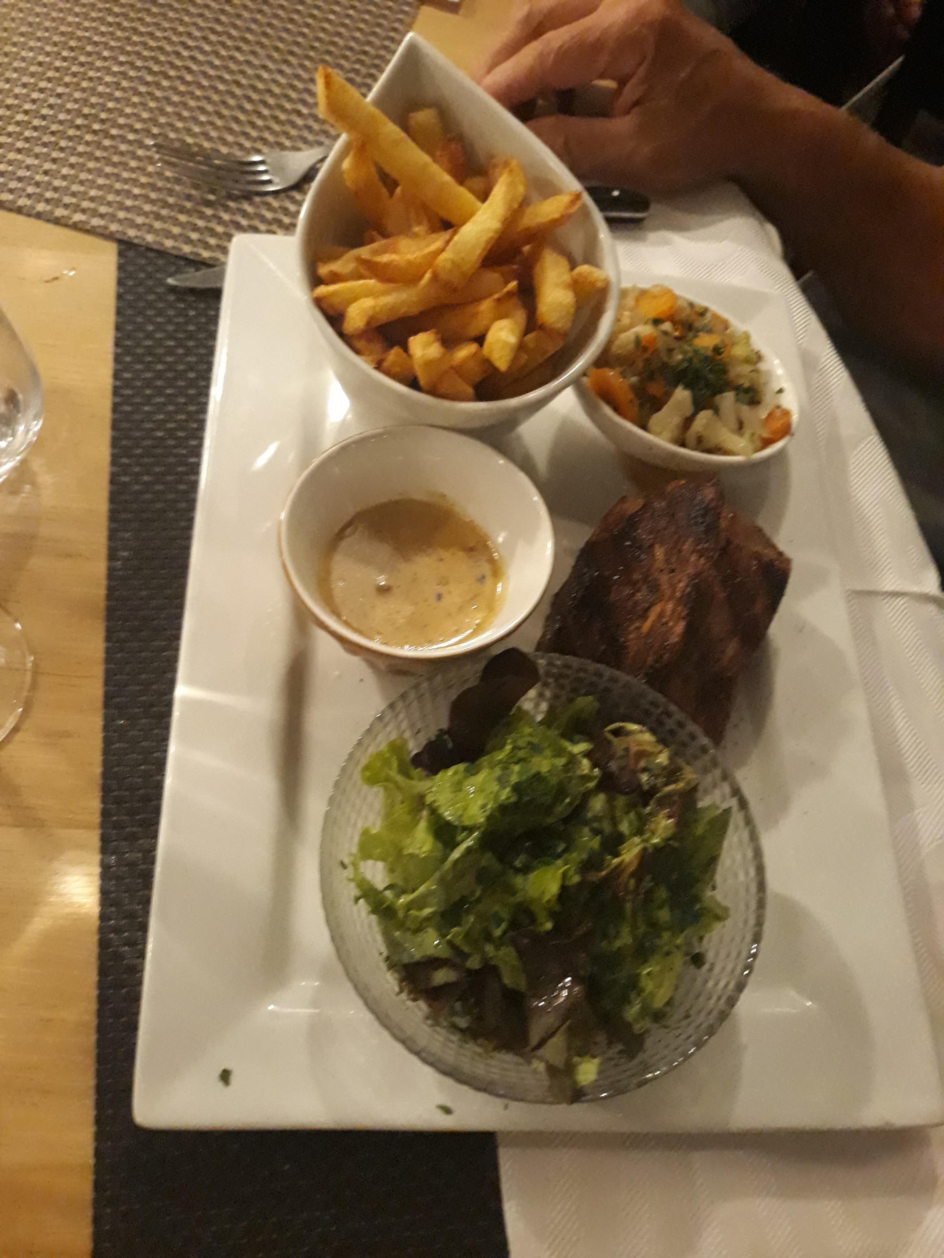 Éviter ce restaurant ou contenter vous de prendre la viande à emporter, service bancale, remarque déplacé de la part du serveur ex boulanger ex ex et ex, sauce périmé, le restaurateur ce doit de respecter les dates même si il estime qu'elle servent à rien !!!! Vaisselle très très sale, voir photos, on se demande même si le lave vaisselle tourne, portions pas généreuse, la viande est bonne et les cuisson respecter. Tarif élevé pour une prestation dans l'ensemble décevante !!