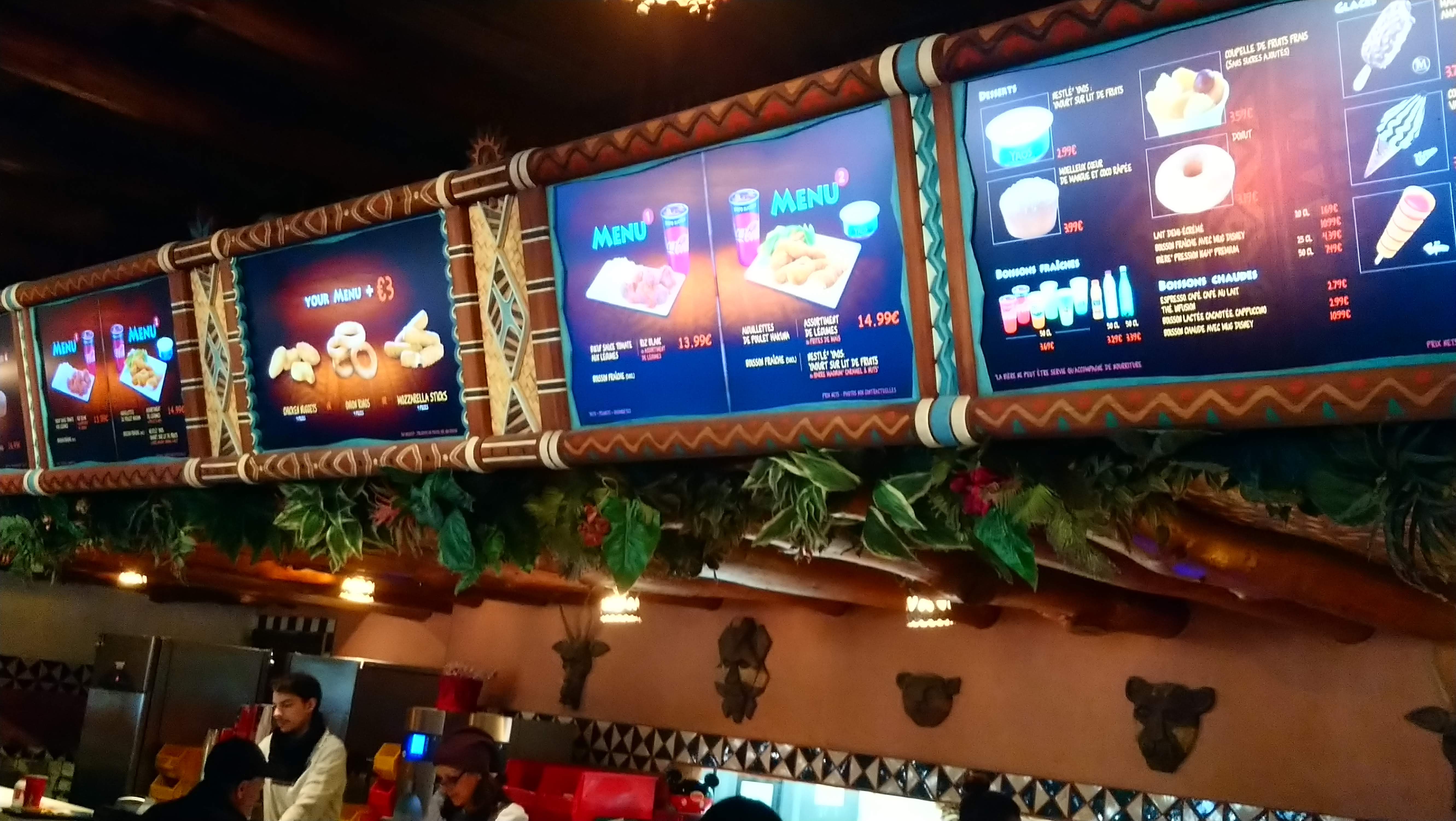 Hormis le tarif Magic Disney (16 €!) , le menu festin de lion était bon (un donner kebab avec frites de maïs), menu enfant à 9€ avec possibilité de légumes. Bien pour manger rapidement et déco sympa
