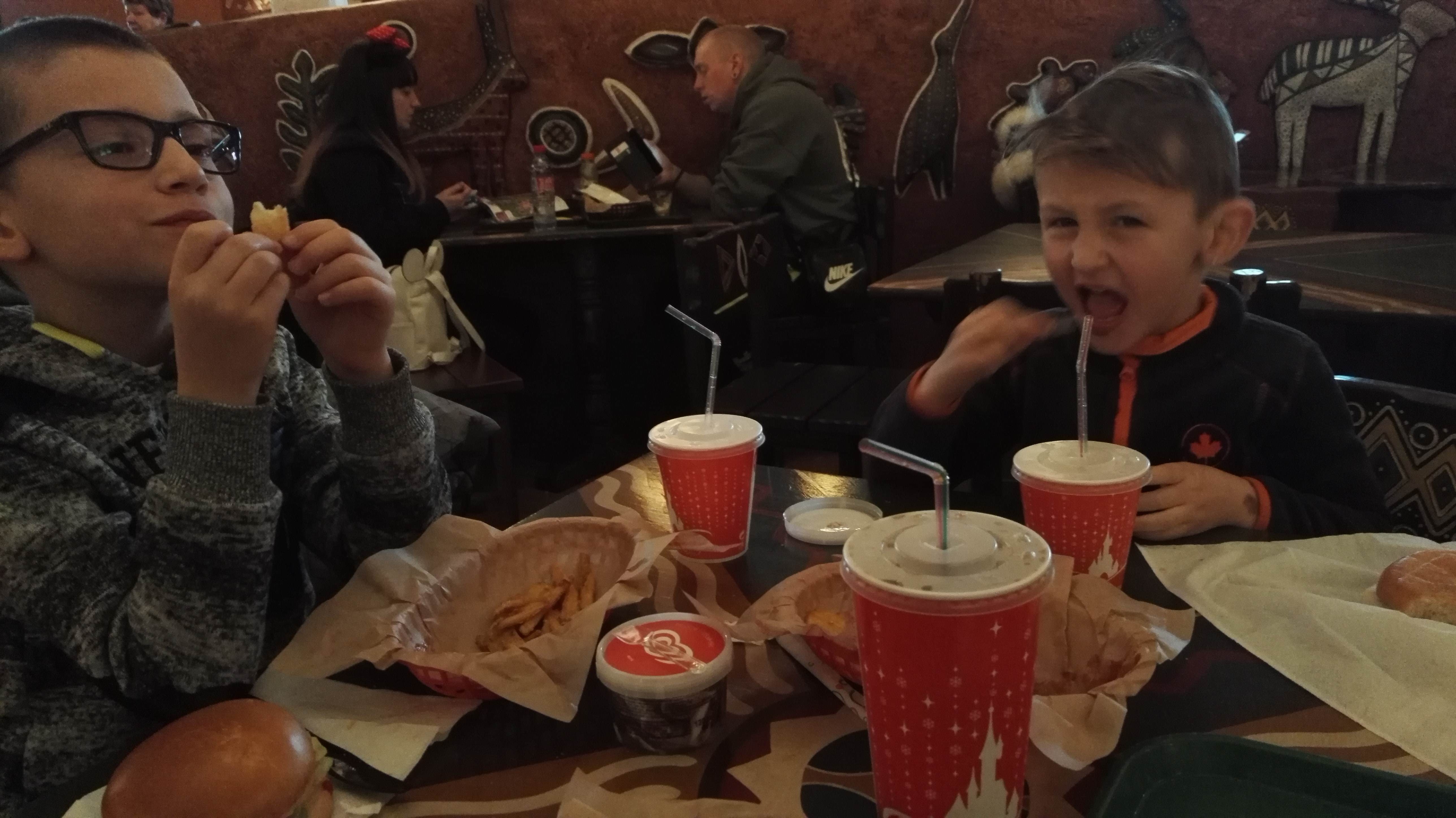 À notre grande surprise, les plats que nous avons pris étaient assez bon, sûrement car on s'attendait à manger comme à la cantine, comme Disneyland Paris nous l'a habitué à un moment, mais cette fois la nourriture était d'une bien meilleure qualité ! Par contre les prix sont pire qu'excessifs et les portions ne sont pas énormes ... Le restaurant en lui même est simple mais bien thématisé, et il y a souvent un homme déguisé en chef de tribu avec son tam tam pour faire l'animation dans la file d'attente.