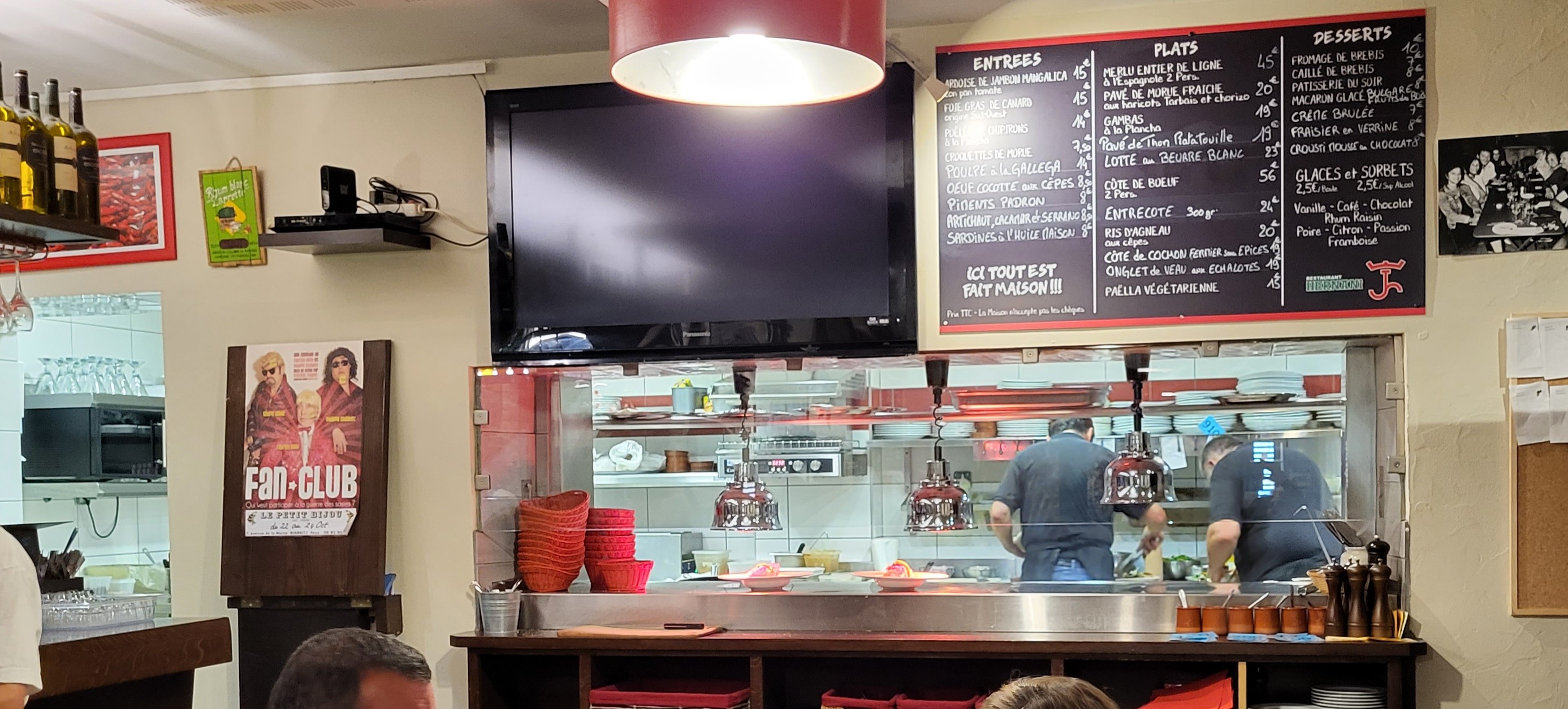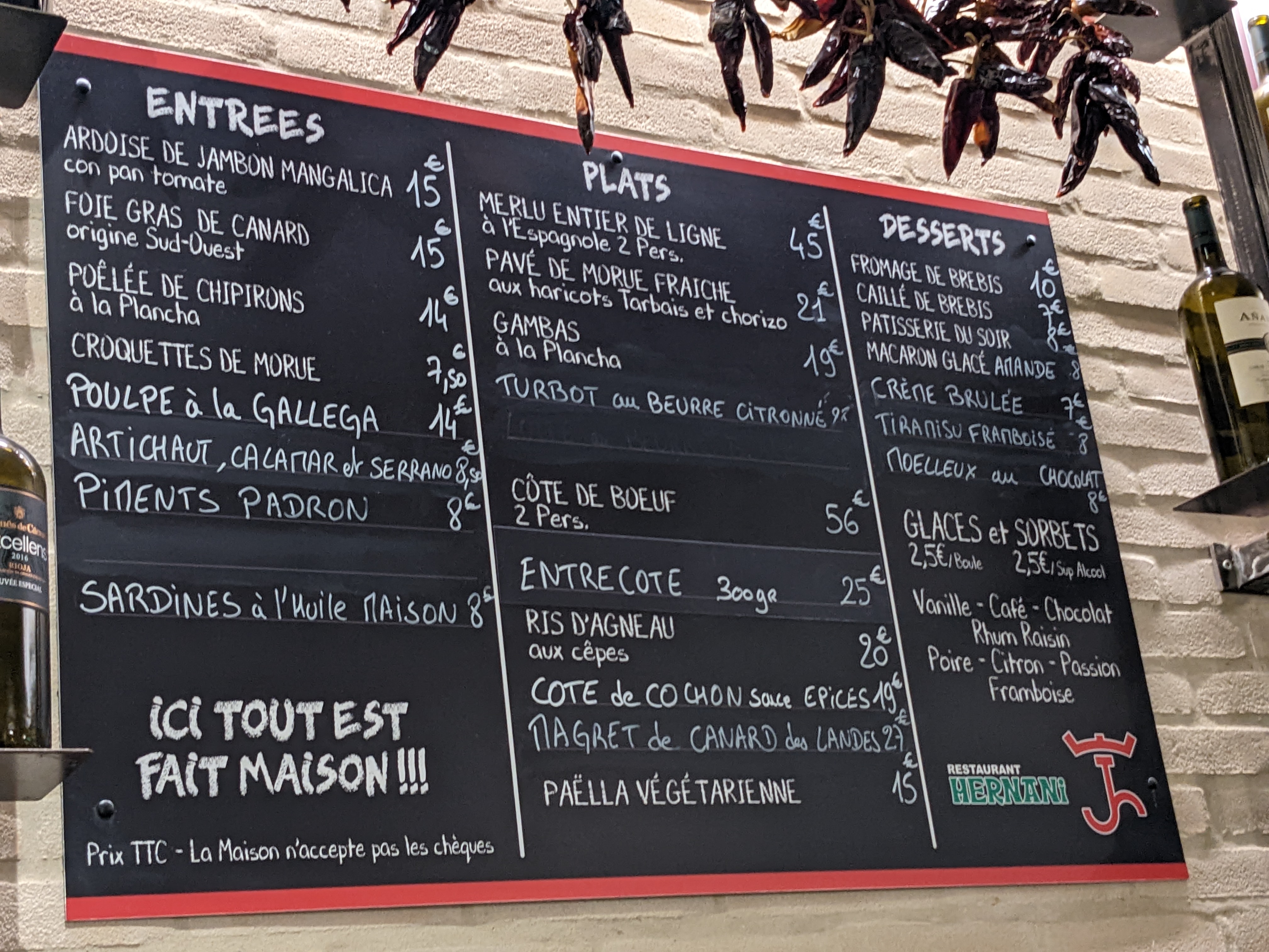 Accueil sympathique, très sud ouest. Ambiance table d'hôte. Parfait pour manger un gueuleton entre amis en grande tablée ou seul au bar. Le grand passe panoramique sur la cuisine est sous la télévision, ou le contraire, je ne me souviens plus... Le vin est bon. 6 vins au verre ou en pichet, parmi une vingtaine de cépages différents. 12 tablées de 6 ou 8 personnes enjouées. Chipirons a la plancha, omelette aux cèpes, couteaux en persillade, poêlée de morue fraîche a l'ail, gambas en plancha, énorme cote de boeuf, ris d'agneau aux cèpes, cote de cochon aux épices, et le magret de canard du coin, plutôt bon : demander la cuisson du cuisinier bien sûr ! Pour la découverte, opter pour l'assiette Hernani! Et partagez la en entrée. Ouvert tard...= service OK. Un des meilleurs accueils de Biarritz Le plus : cuisine Maison y compris les desserts!