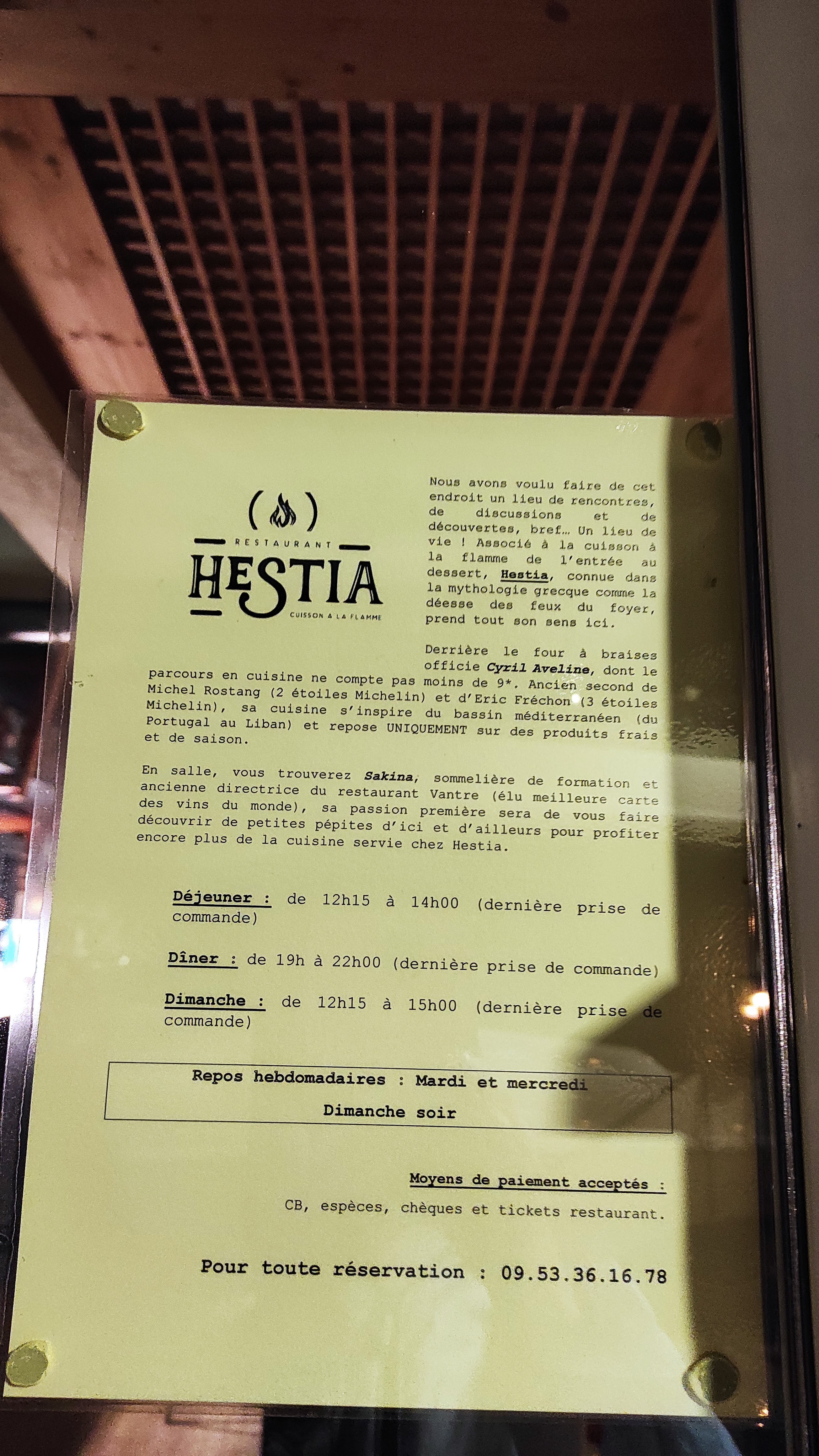 La cuisine, l'accueil, les vins, le lieu, tout est parfait ! Pour un repas entre amis, en famille ou en amoureux je vous recommandé mille fois Hestia ! Expérience heureuse garantie !