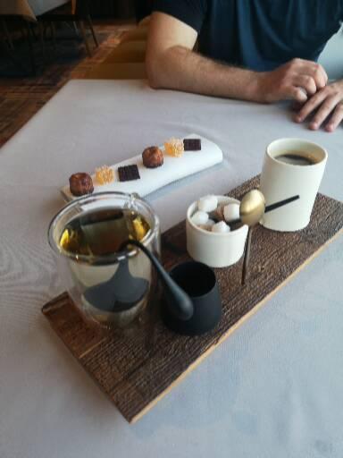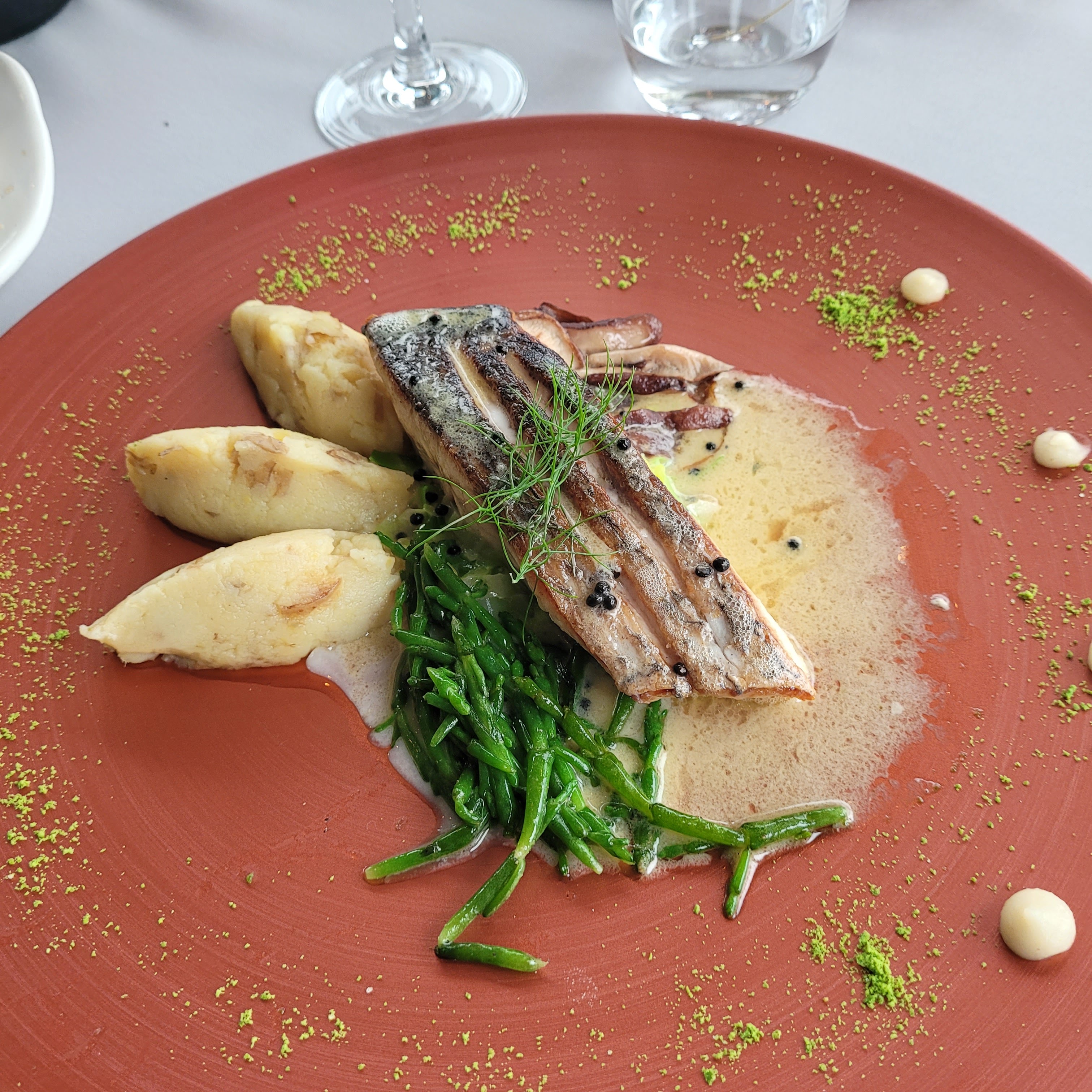 Excellent accueil de la part des deux jeunes personnes par contre la personne aux lunettes noires beaucoup moins plaisante ( nous avions l’impression d’être devant un donneur de leçon de comment se bien tenir …. Il n’avait pas appris à servir le fromage fourchette plantée dans les fromages et non posée sur ) Délicieux déjeuner très jolie vue La carte sur tablette est bien adaptée sauf pour les personnes âgées (90 ans) Il est regrettable que la bouteille d’eau traitée sur place soit à régler bien souvent la première bouteille est offerte surtout que si nous avions eu accès facilement à une carte physique nous aurions pris une bouteille de châteldon 6 euros contre 8 ! Coquilles st Jacques parfaites Poissons cuits à la perfection Nous n’avons pas aimé le service du café Servi dans des tasses hautes BRÛLANTES en grès et donc impossible à tenir ….. C s tasses hautes ont été remplacé par des mugs encore plus hauts mais froids Ma mère n’a pas pu le boire trop difficile pour elle et franchement un expresso dans un tel contenant ce n’est pas agréable du tout Dommage alors que la mise en place des couverts sous cloche et les assiettes sont magnifiques Nous avons passé un excellent moment dommage que la personne aux lunettes noires en passant devant elle en partant a oublié de nous saluer