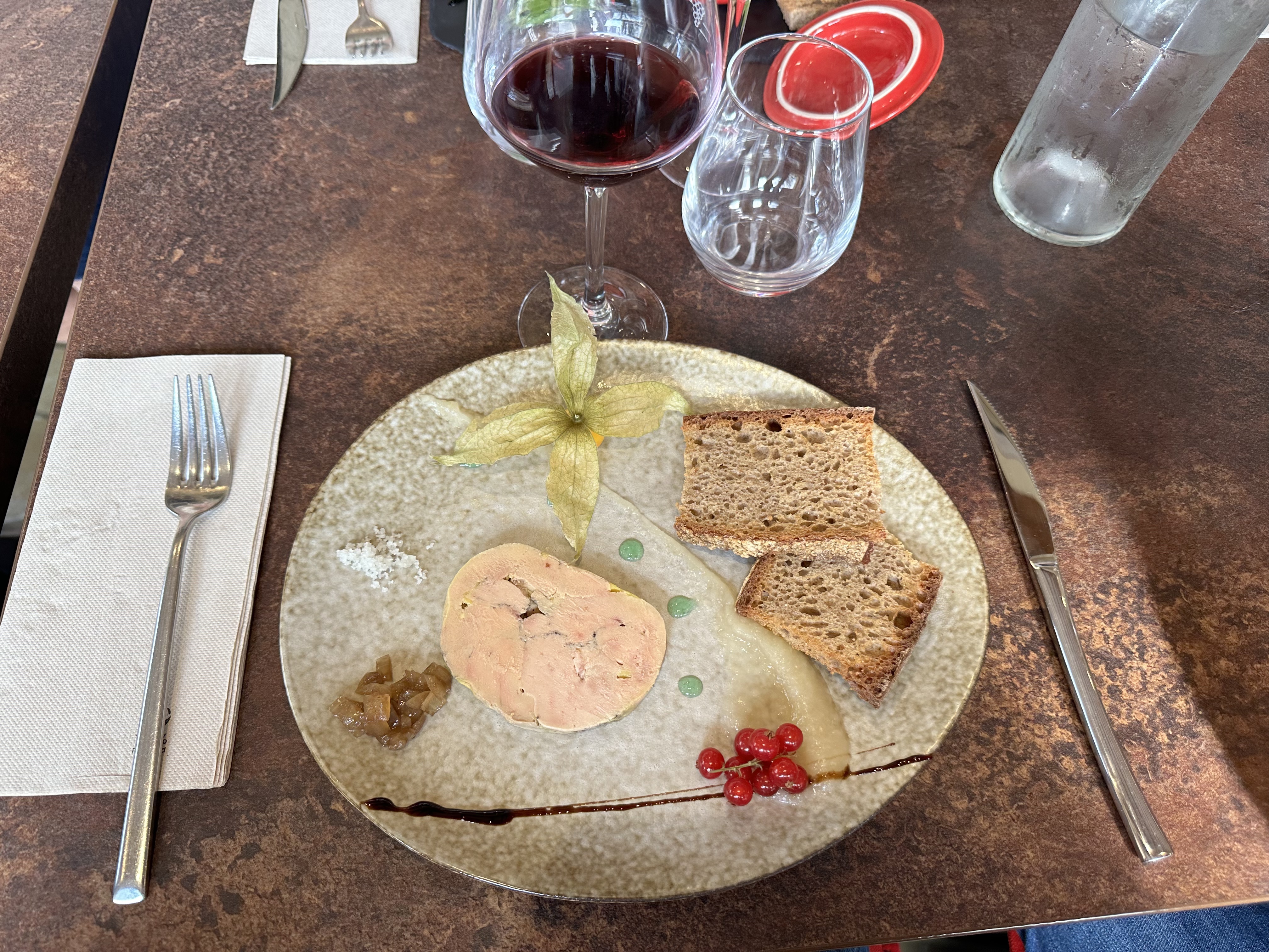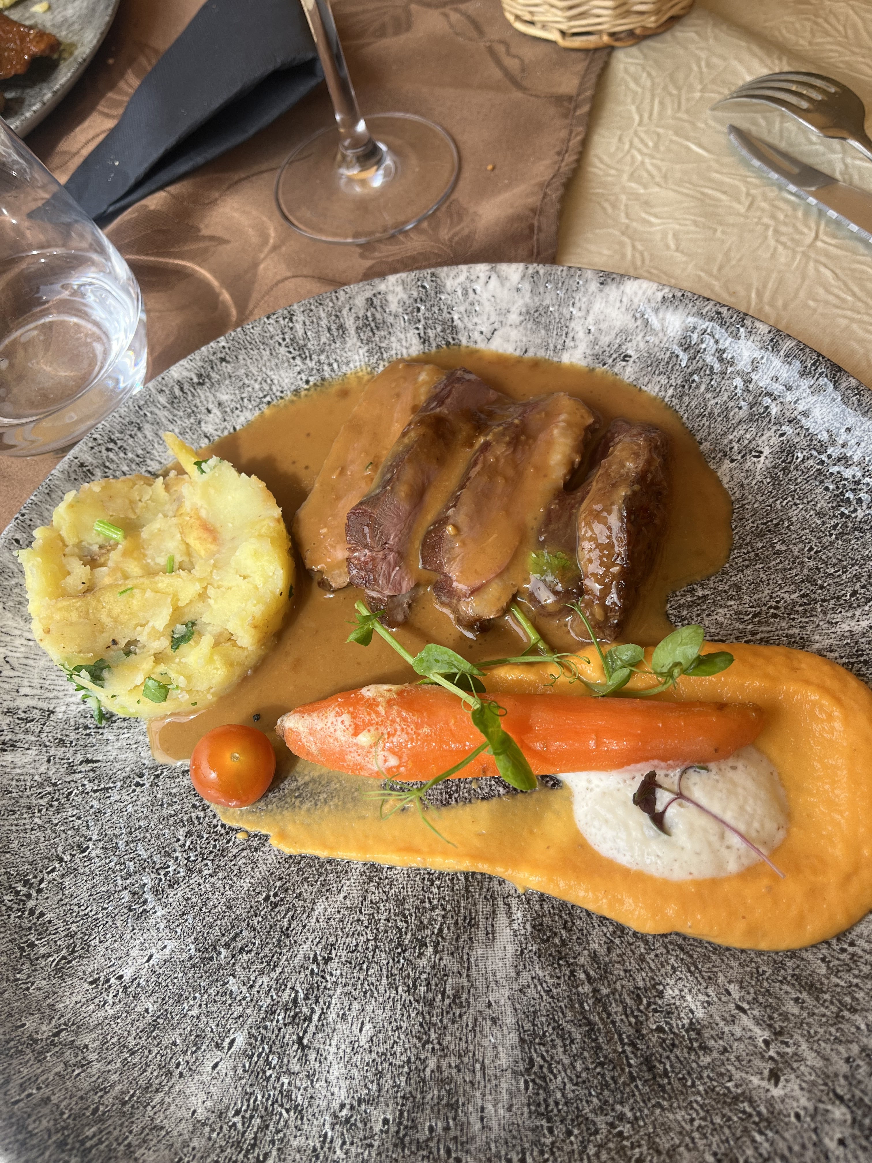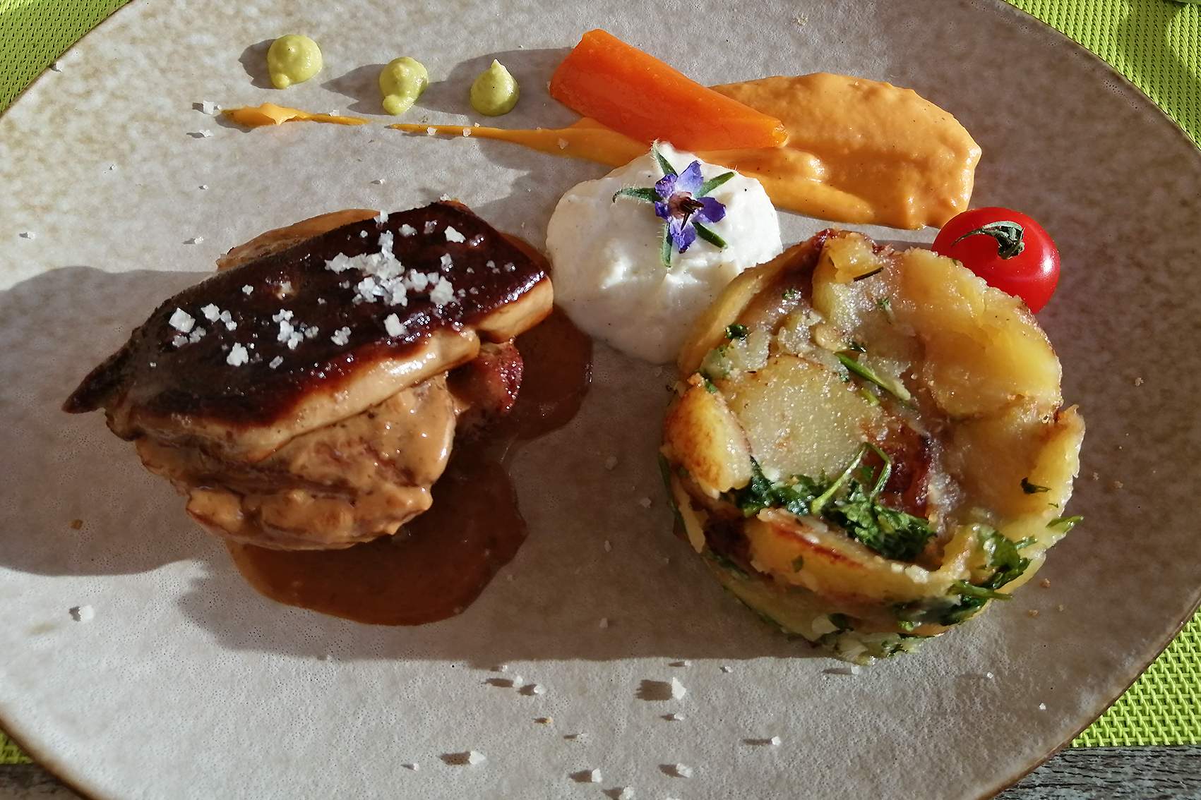 Un dîner extraordinaire, duo de foie gras, magret de canard, sur l’assiette chaque petite chose était exquise. Service impeccable et efficace. Digne d’un étoilé vraiment bravo.