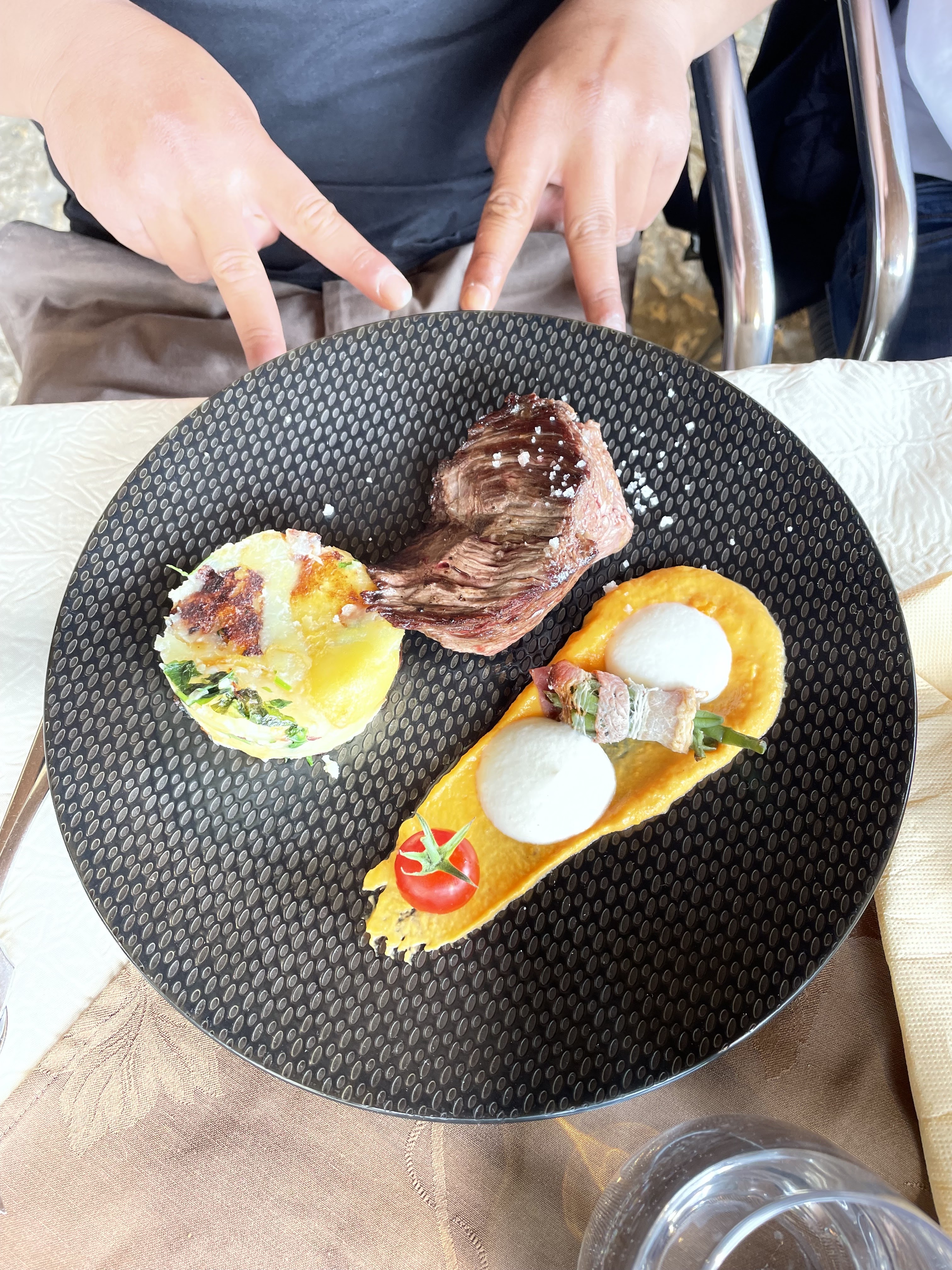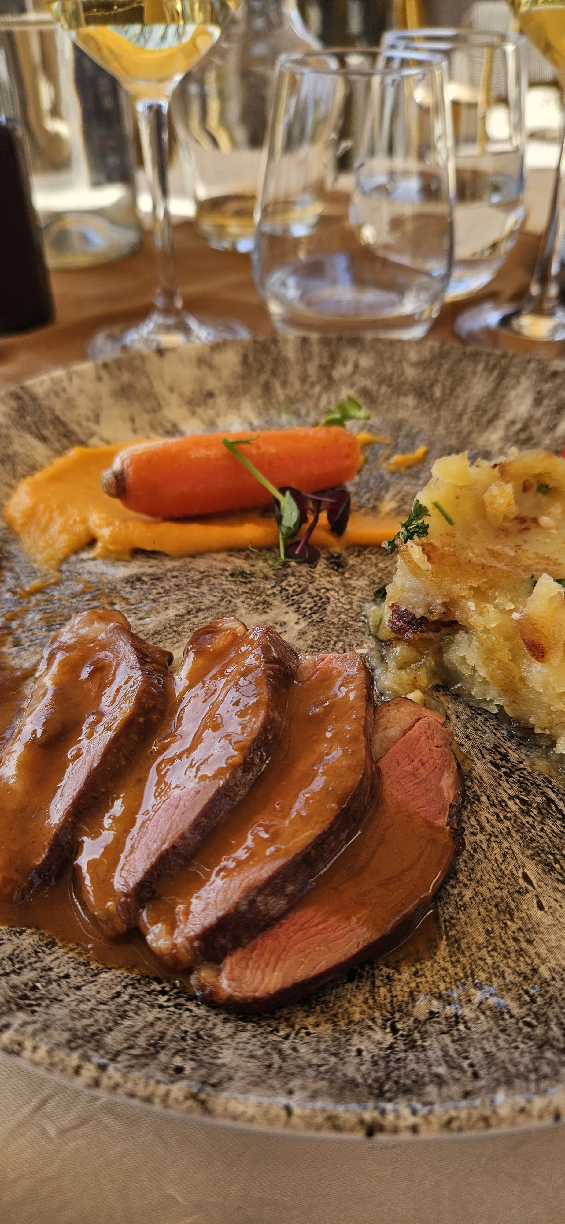 {2 étoile uniquement pour le dressage des assiettes} Mis a part le cadre du village séduisant, à l’intérieur de ce restaurant rien ne va comme prévu! Décoration type « street art » totalement hors du contexte après une visite du château, musique d’ambiance « boîte de nuit » également hors du sujet mais surtout un accueil froid et non commercial 😞 : Le refus de faire une assiette de frites en supplément alors que c’est un accompagnement proposé dans les autres plats!? Le fois gras est payant en supplément, le confits de canard minuscule… Il semble que l’équipe ne soit pas encore bien en place malgré des tarifs élevés : attention vous êtes prévenus.