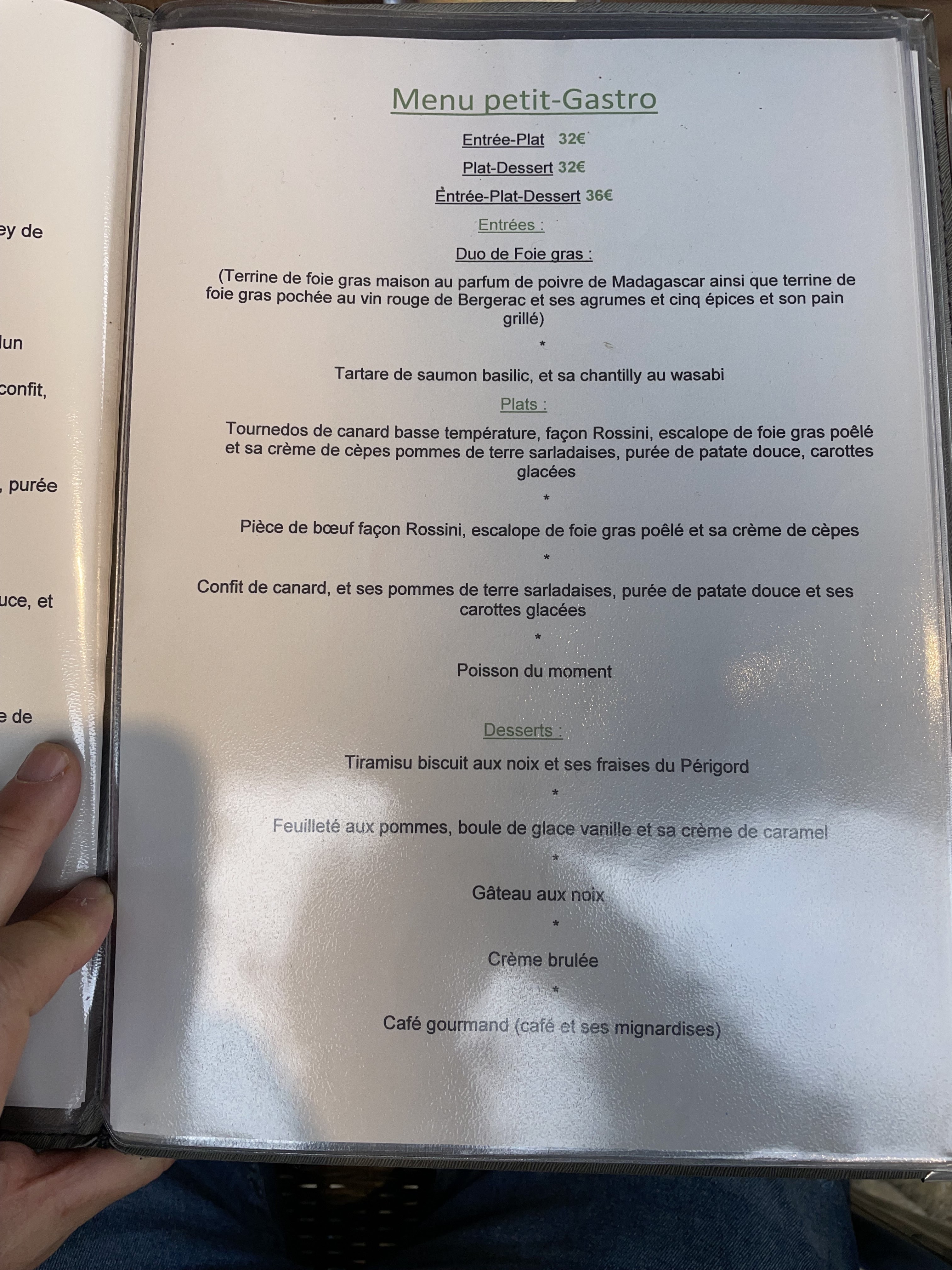 Très bon restaurant nous y avons mangé hier soir (16 juillet), serveurs très sympa, menu à 32€ entrée déclinaison de foie gras très bon cela permet de découvrir différentes préparations de celui ci, pièce de bœuf très bon même moi qui aime la viande à point celle ci ce mangeait facilement, purée de carottes excellente avec pomme sarladaise miam! Dessert feuilleté aux pommes moi qui suis pâtissière je l'ai trouvé très bon et pourtant je suis difficile là-dessus! Premier restaurant depuis 1an 1/2 nous n'avons pas été déçu mon mari et moi-même. Merci