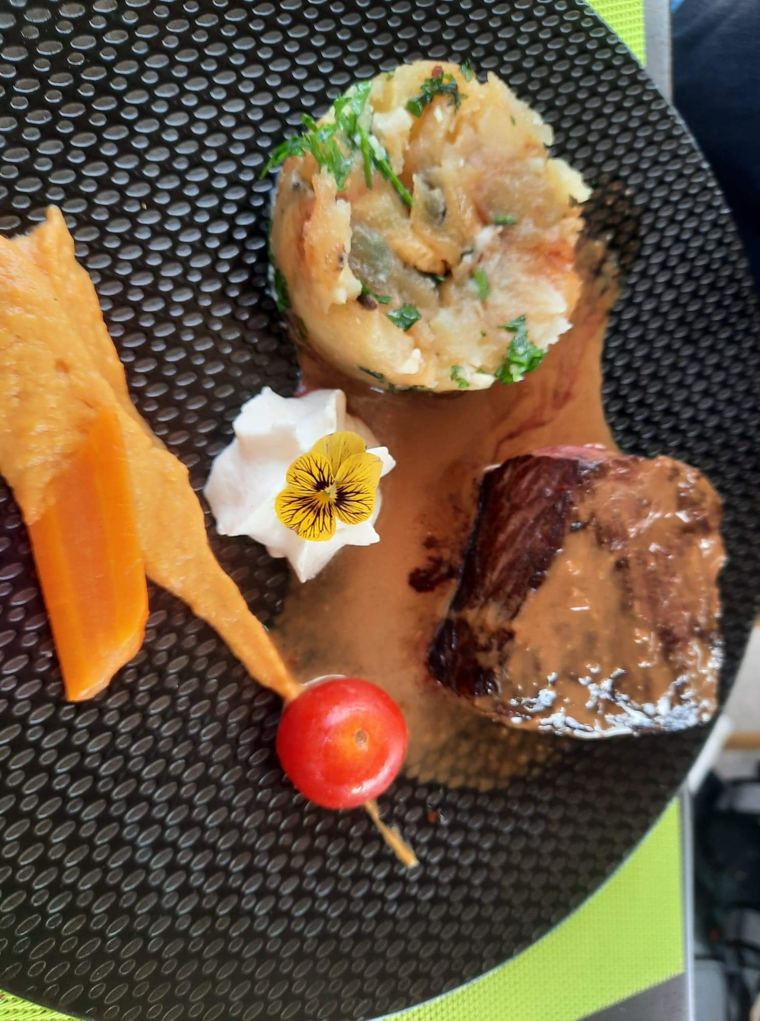 Je n'ai pas pris en photo les plats (dommage) car ils étaient tout autant beau que bon. Je me suis régalée. Un accueil et un service très satisfaisant nous mettant à l'aise avec quelques passages de rigolades très sympathique... Hâte d'y retourner pour goûter aux autres plats et de passer un bon moment avec un bon service en prime. 😋😇