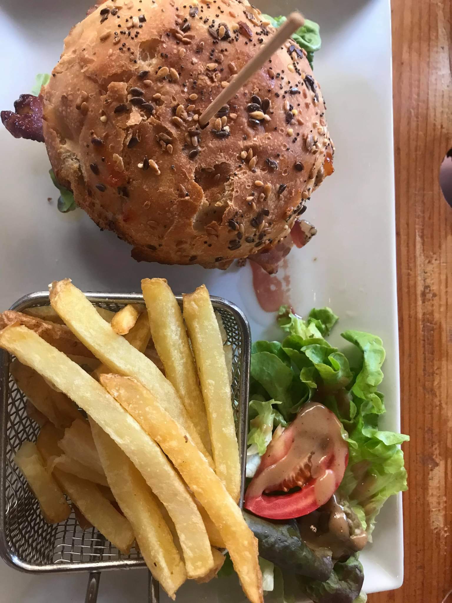 Nous avons mangé au restaurant. Le serveur chauve et barbu a été impinable.. Il nous a peine adressé la parole, il parlait avec des gestes sans nous regarder.. J'ai demandé une pauvre carafe d'eau, il a bien apporté les apéritifs pour mes amis mais la carafe d'eau.. Dans les oubliettes, obligé de redemander. Ensuite le burger était.. Vide de sens, sans tomate, sans sauce, quasi pas de fromage et le jambon est resté à l'abattoir mais plein de salade au cas où pour cacher sa médiocrité.. Le pain aucunement moelleux.. Pour un burger à 18euros c'est très léger de proposer et faire qqch comme ça.. Demander les toilettes au serveur, indiquer ceux de l'hôtel, trouver ça bizarre donc redemander à une serveuse qui nous indique que c'était au fond du bar.. Heureusement que la petite serveuse Sana relève le niveau de ce service totalement aberrant Première fois que j'écris un commentaire pour mentionner à quel point le service était minable et la cuisine inutile. Cela prouve à quel point je n'en reviens pas Merci mais non merci