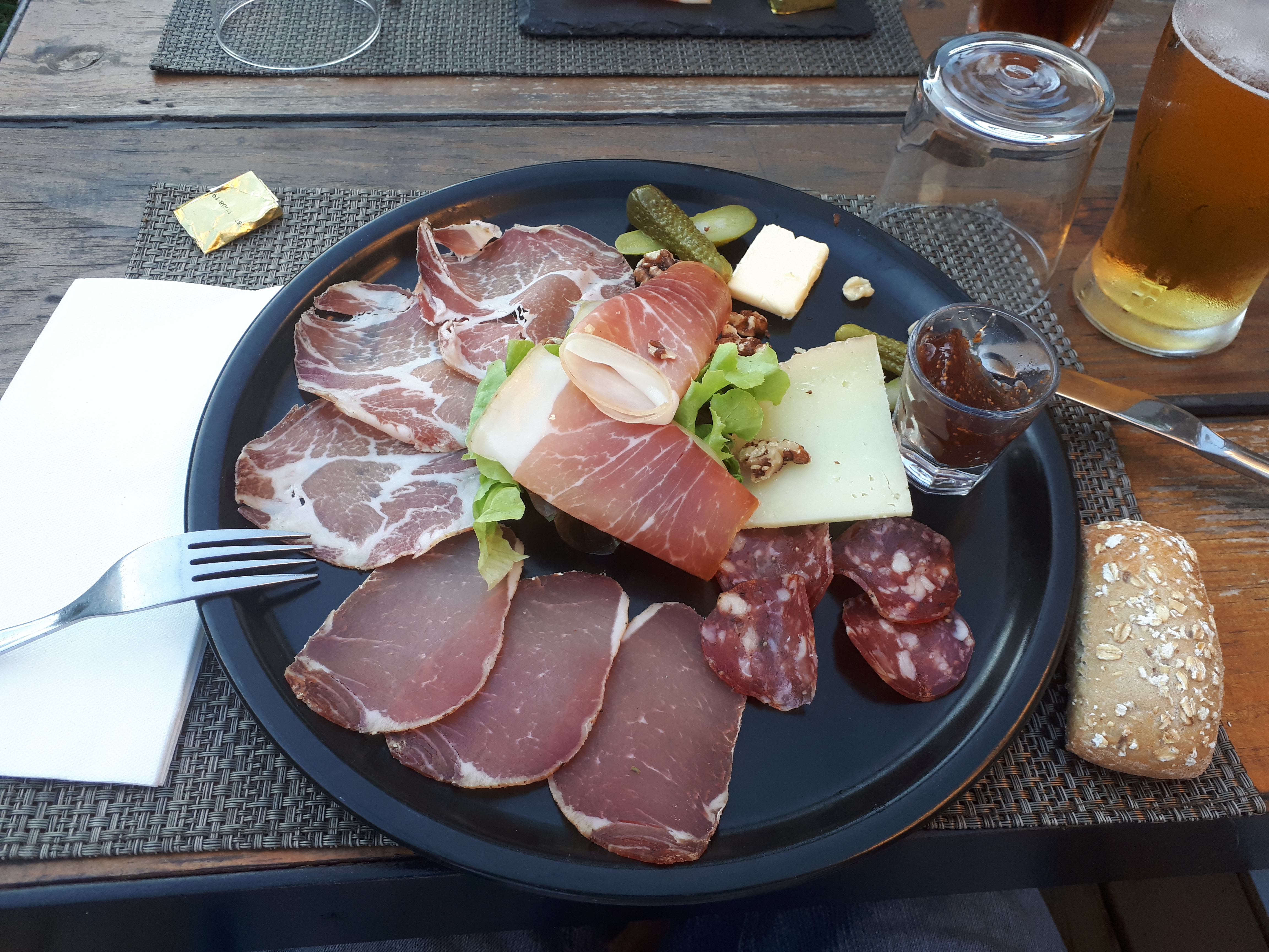 Repas du midi, serveuse agréable. Nous avons pris brochette de bœuf, la viande bonne et tendre, et veau aux olives, également bon.