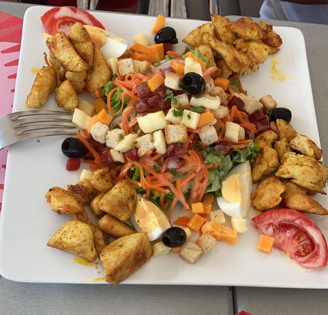 Nous sommes trois personnes j'ai prit une salade oriantal mais le poulet est trop sec dommage et la sauce pour salade devrait être servie à part car trop vinaigré les deux autres convives ont appréciés leurs plats sinon c'est un très bel endroit conviviale et familiale ou les serveurs(ses) sont très à l'écoute et très sympathiques...