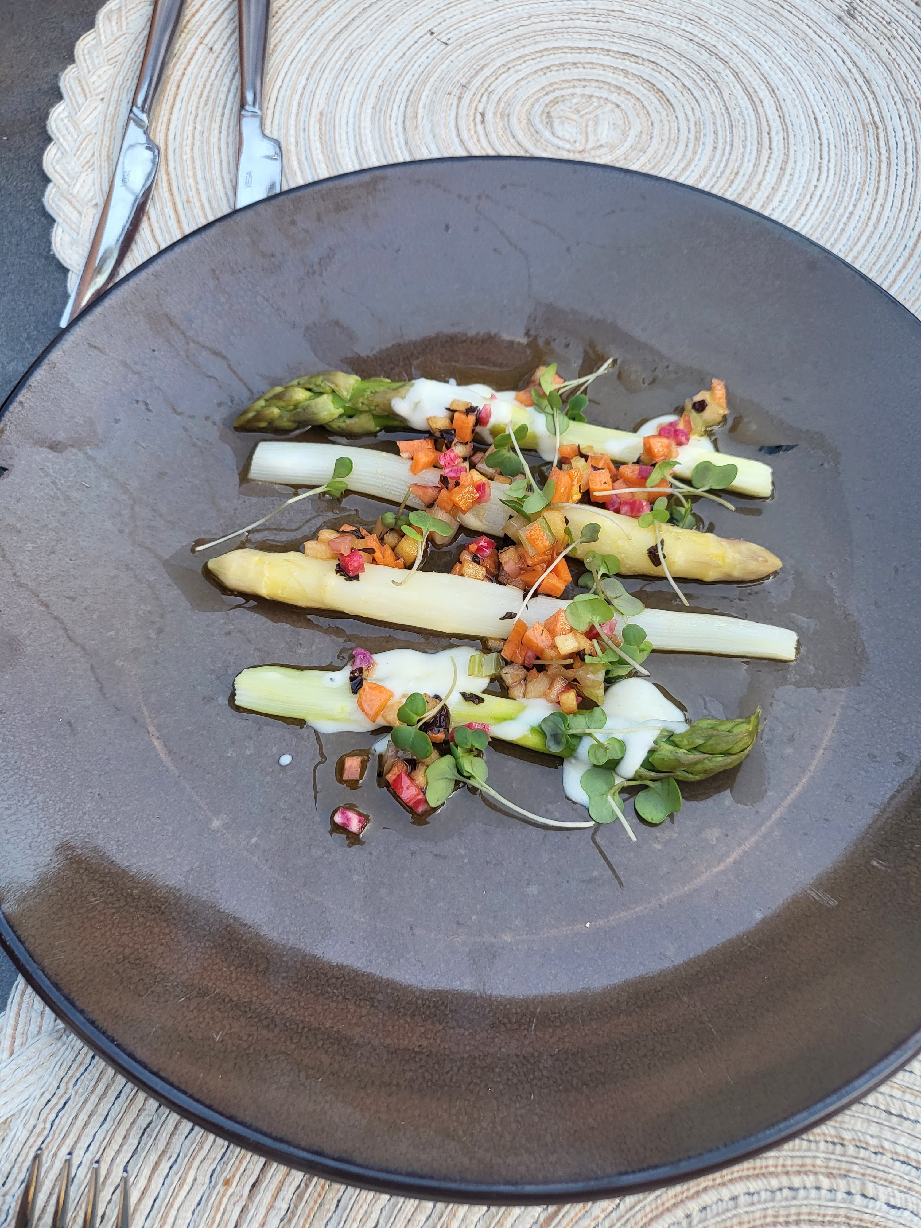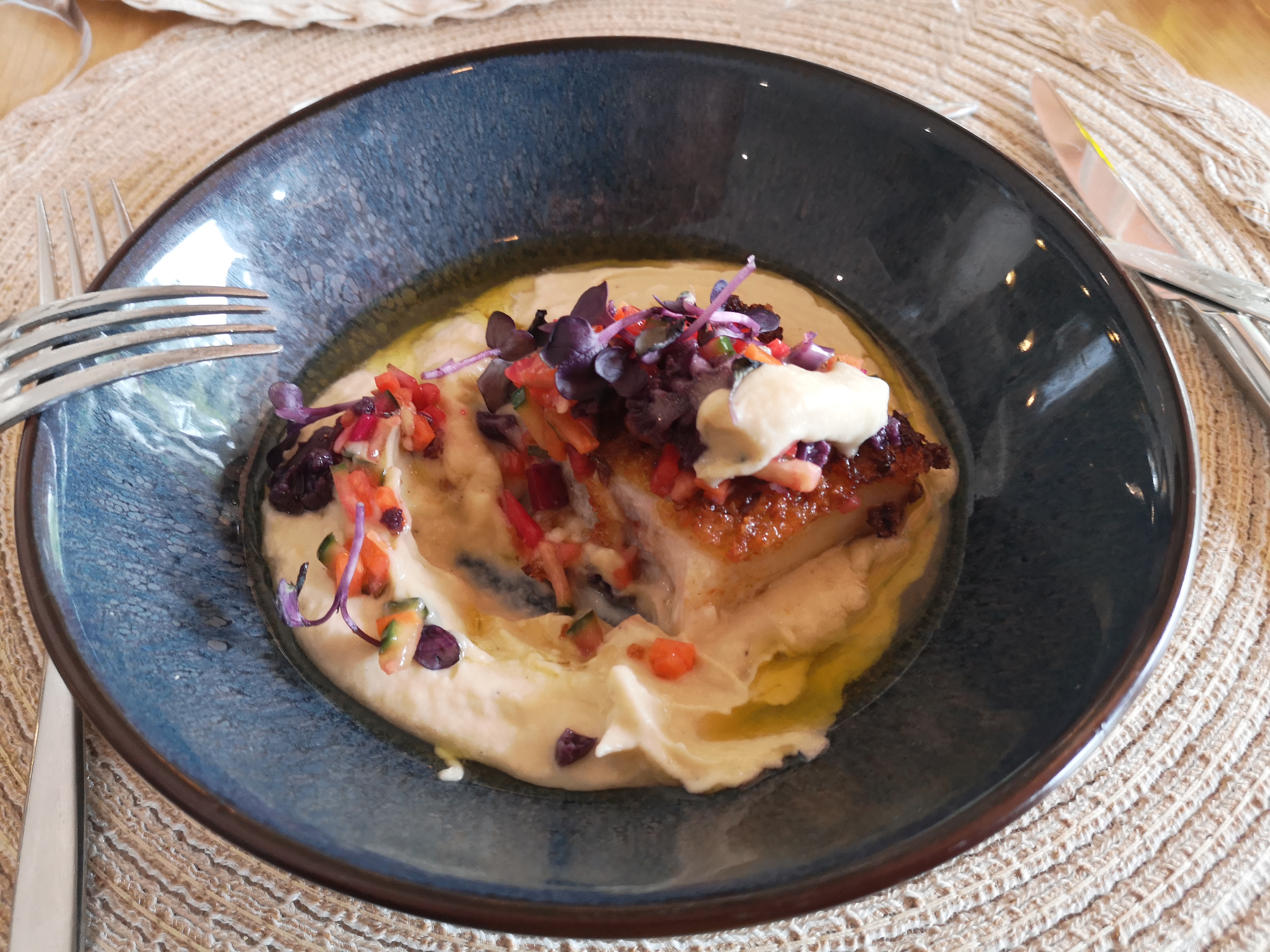 Une sélection de mets à la danoise plein de promesses, mais qui malheureusement ne les tient pas ! Une dégustation en 6 services pour 39 euros par personne (annonce the Fork), pour des plats servis en une seule fois, dans des contenants à partager. Tempura, aïoli, pickles, gravlax, confit, condiment...n'ont que le nom sur le papier mais en aucun cas dans l'assiette. La magie est bien là pourtant : quand des asperges se transforment en artichaut, que certains produits disparaissent de nos assiettes comme les radis, le céleri branche, la crème d'œuf de truite... et que le croustillant du bacon devient charbon ! Une carafe d'eau (tiède) et une cuillère n'apparaîtront que difficilement, voire jamais... C'est dommage, les produits semblent être de qualité, mais ils ne sont pas travaillés. Aucun peps, aucun goût, aucun jus un peu relevé, ou condiment pour apporter un peu de saveur. En résumé, une note salée mais pas de quoi nous faire frétiller les papilles ! Seul le vin (un rosé Campuget Syrah Vermentino 2022) et le cadre auront illuminés notre soirée.