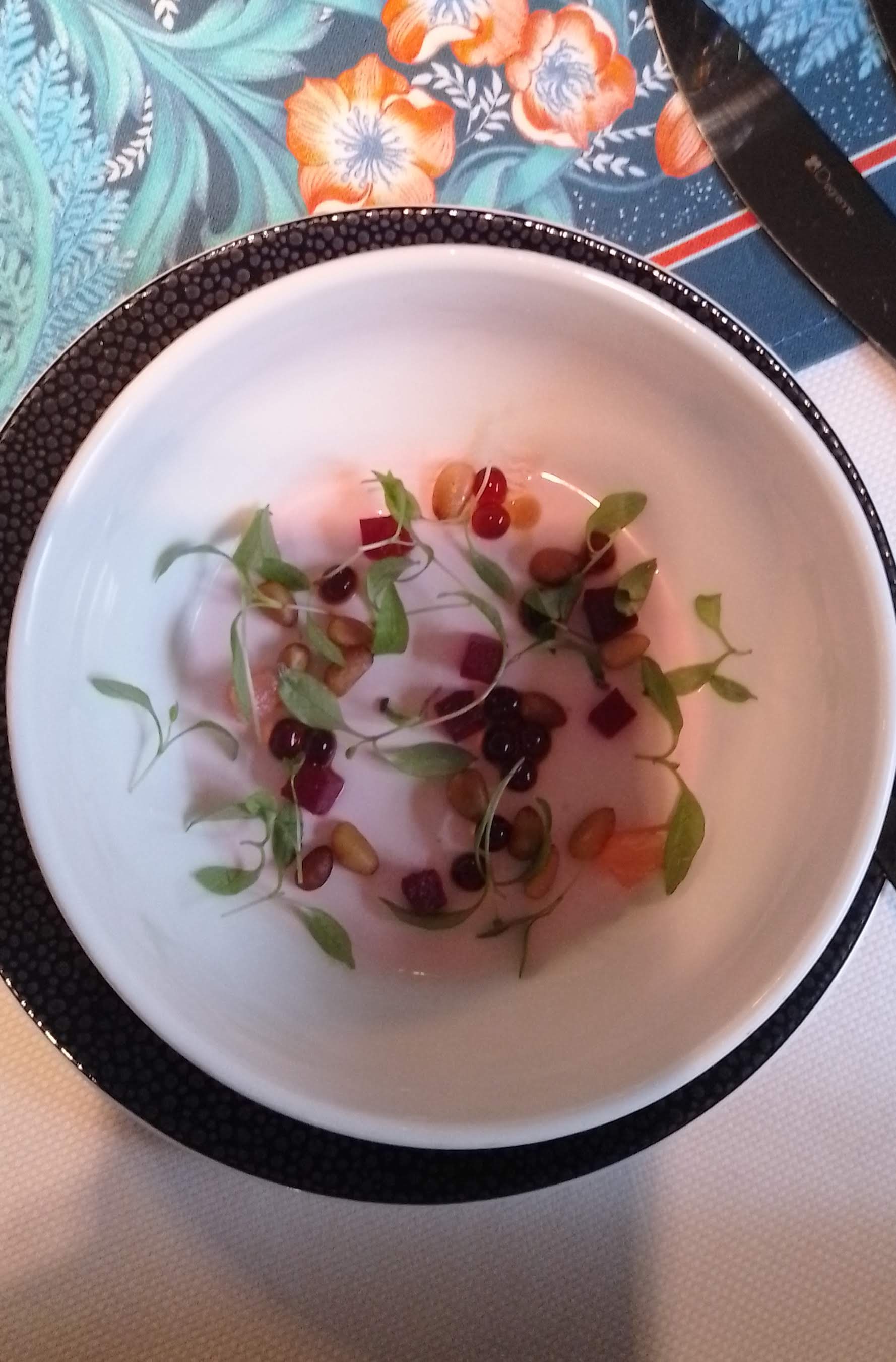 Dans une cour fleurie, un délicieux et très original repas. La patte d'un très grand cuisinier vraiment allez y !