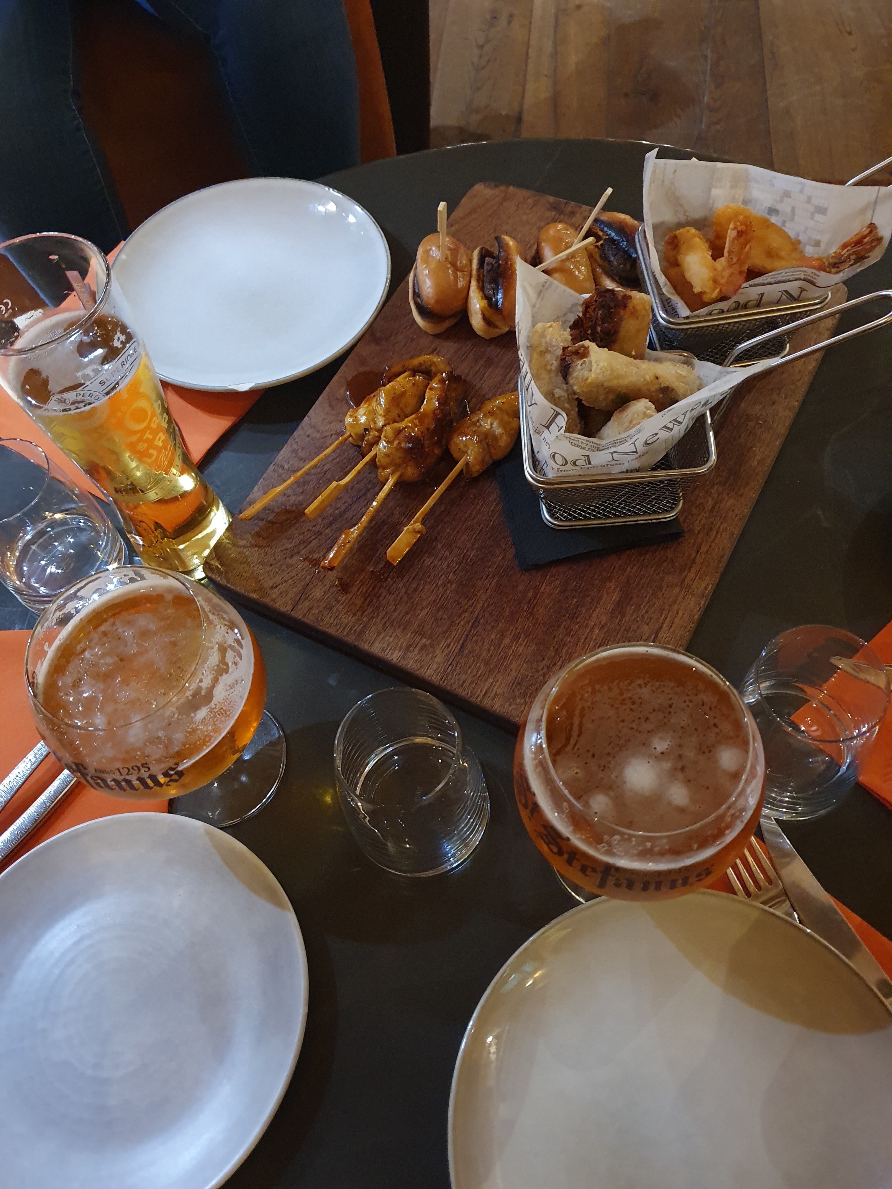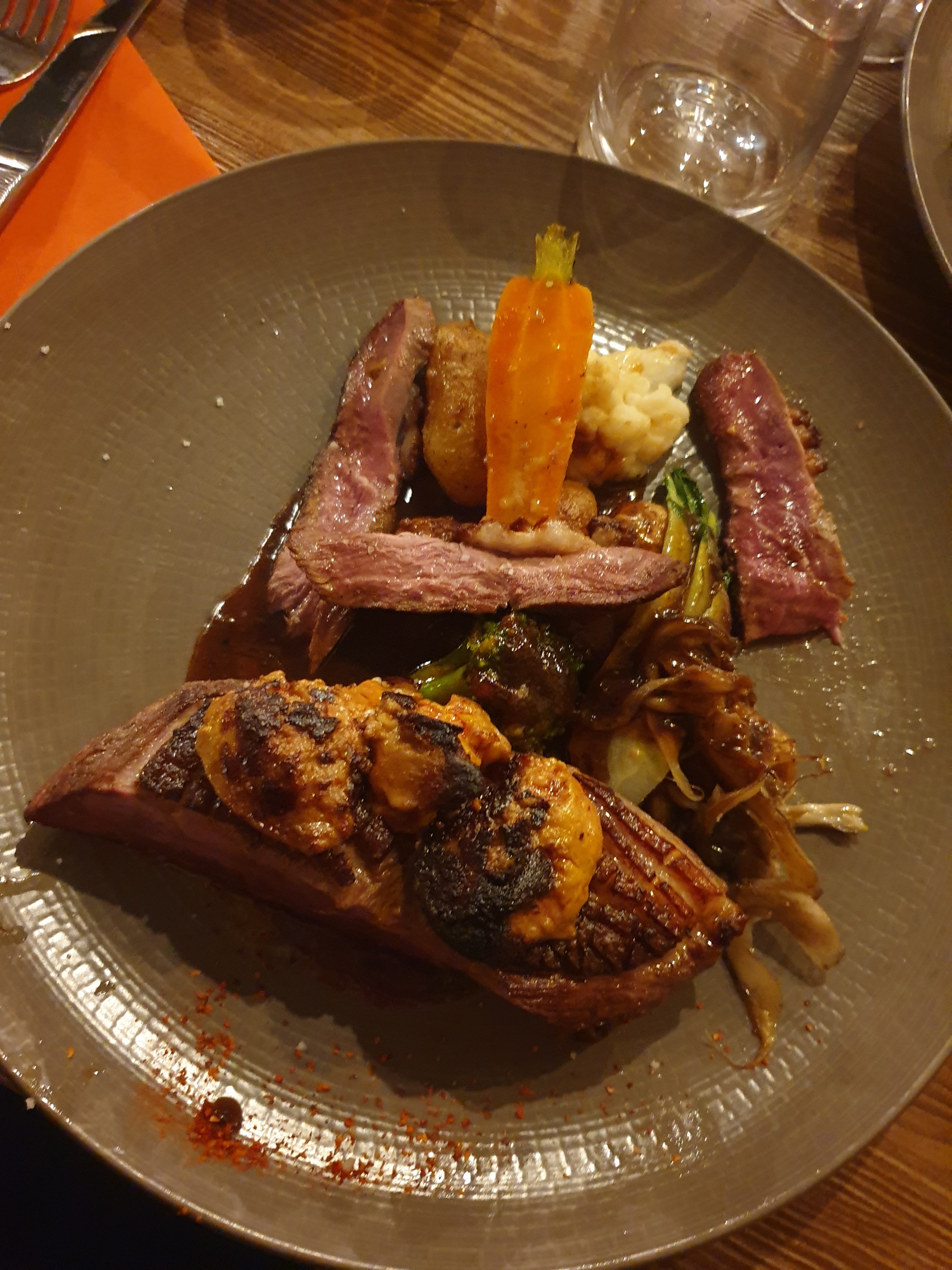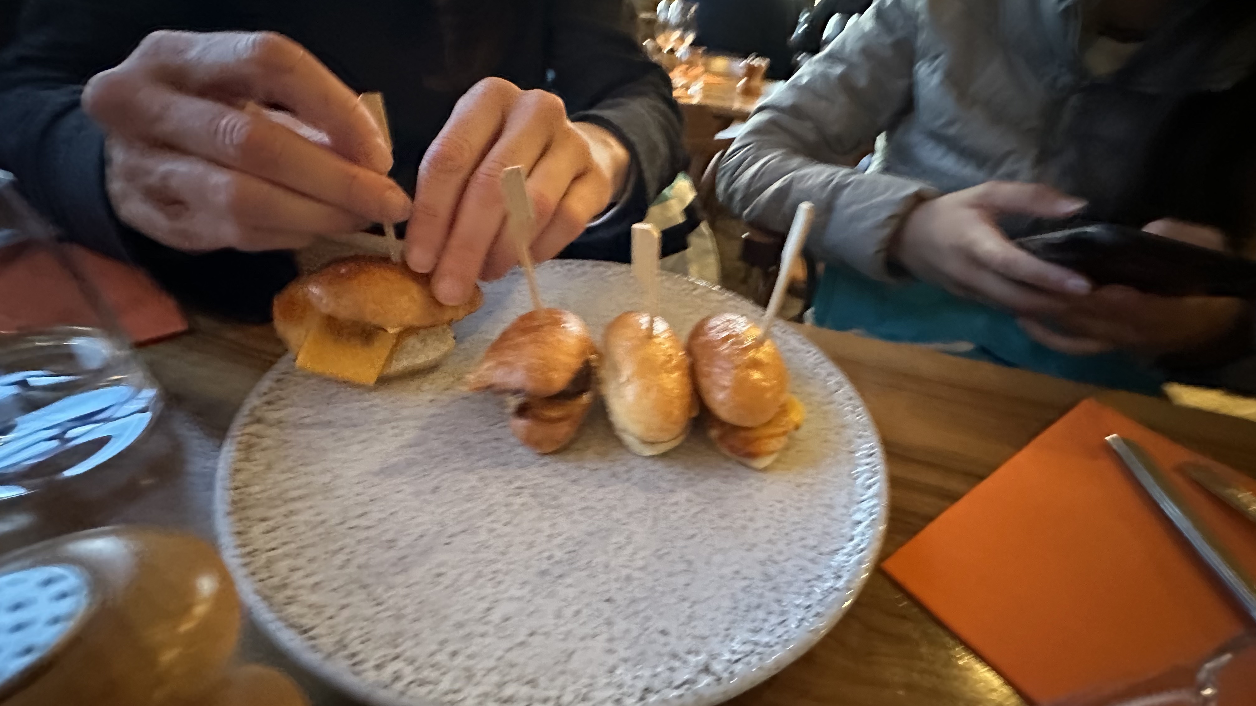 C'était excellent ! Assez cher et peu copieux, mais excellent! En entrée nous avons opté pour un assortiment de tapas : 4 mini burgers, 4 rouleaux de saumon, 4 brochettes de poulet teriyaki et 4 nems de poulet. Tout était très bon. Même si, il faut le dire, les burgers étaient un peu banales, les nems étaient, eux, sans pareil! En plat nous avons décidé de partager deux entrées : la Soupe à l'Oignon et son Toast Gratiné et le Duo de Foie Gras. Nous nous sommes vraiment régalés avec les deux assiettes. A deux avec 2 kirs, cela nous est revenu à 85€. Cependant, nous avions encore faim en sortant. Note a Bene : pour un dîner romantique ou plus au calme, n'hésitez pas à demander à migrer à l'étage, la salle du bas peut être très bruyante.