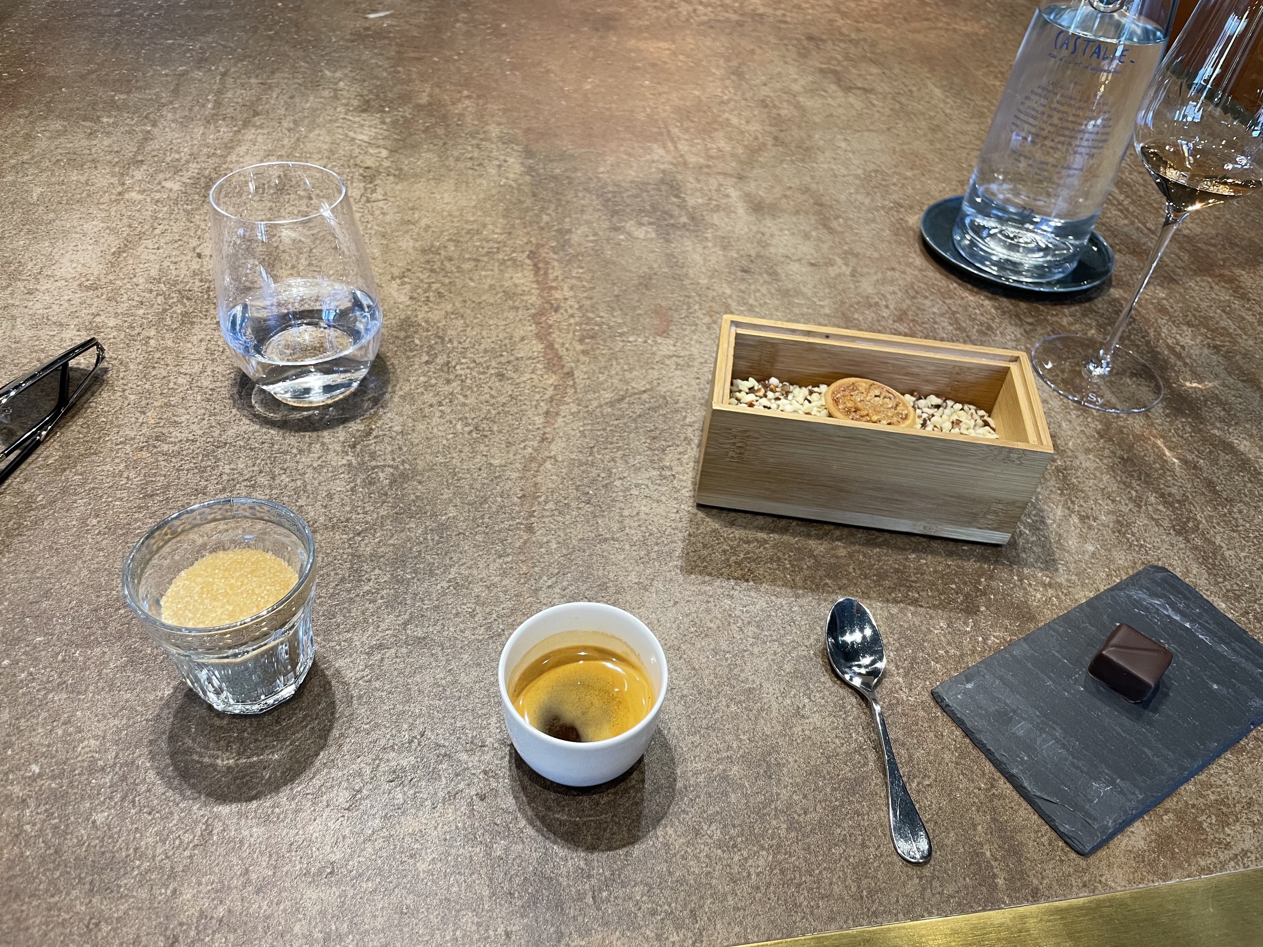 Tout est remarquable, le mariage des saveurs, des consistances, l'accord des vins avec les plats, le service avec une présentation de chaque plat et de son vin. Enfin le concept choisi qui nous permet de voir le travail du chef et de sa brigade, tout cela dans un cadre sobre et de bon goût. Quel merveilleux moment partagé, toutes mes félicitations !