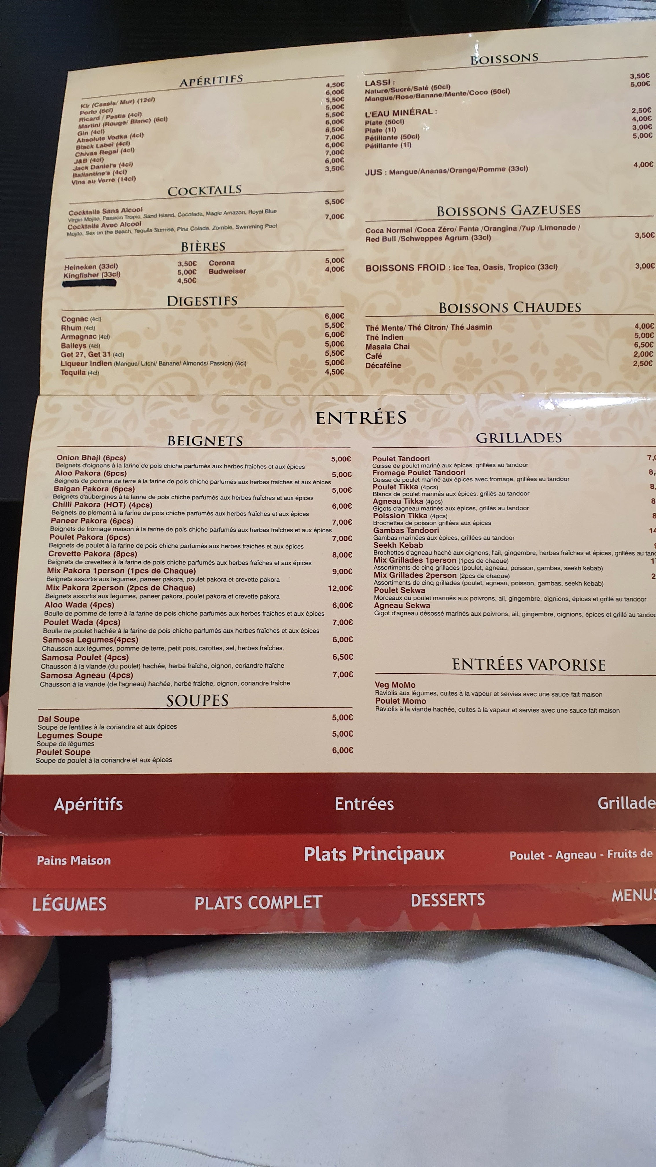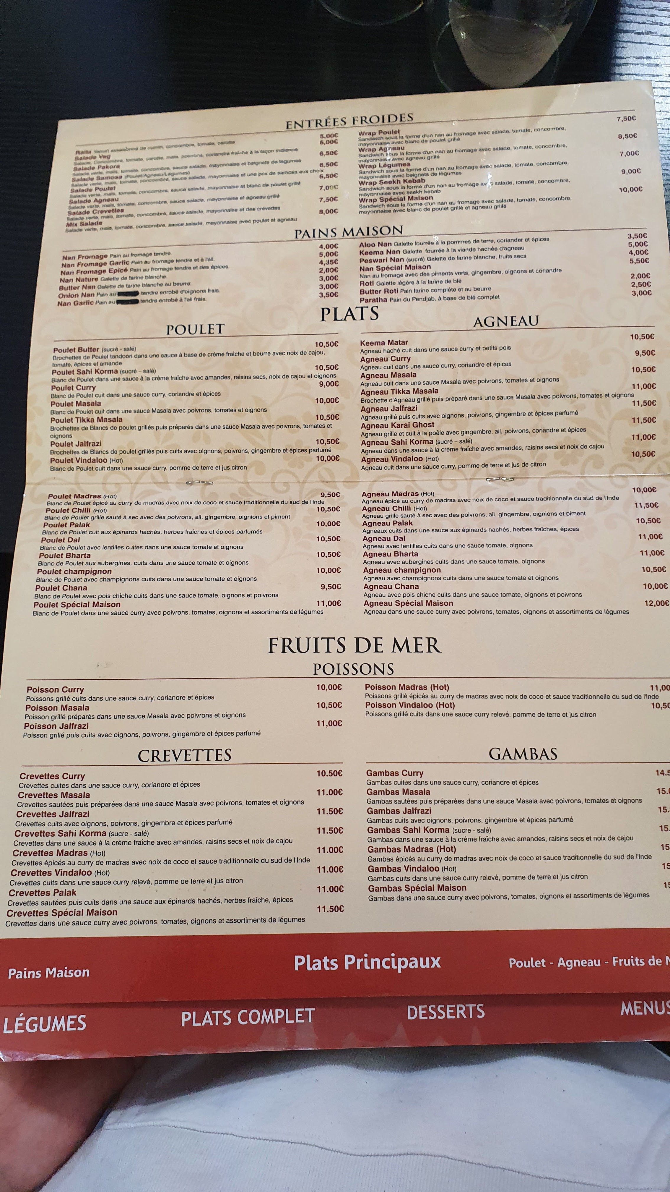 Carte attractive et pas trop chère. Menu intéressant pour le prix (11 a 13 euros). Les saveurs indiennes sont là avec toutefois un point négatif sur les beignets de l’entrée qui manquaient un peu de croustillant et le dessert moyen. Les quantités sont correctes.