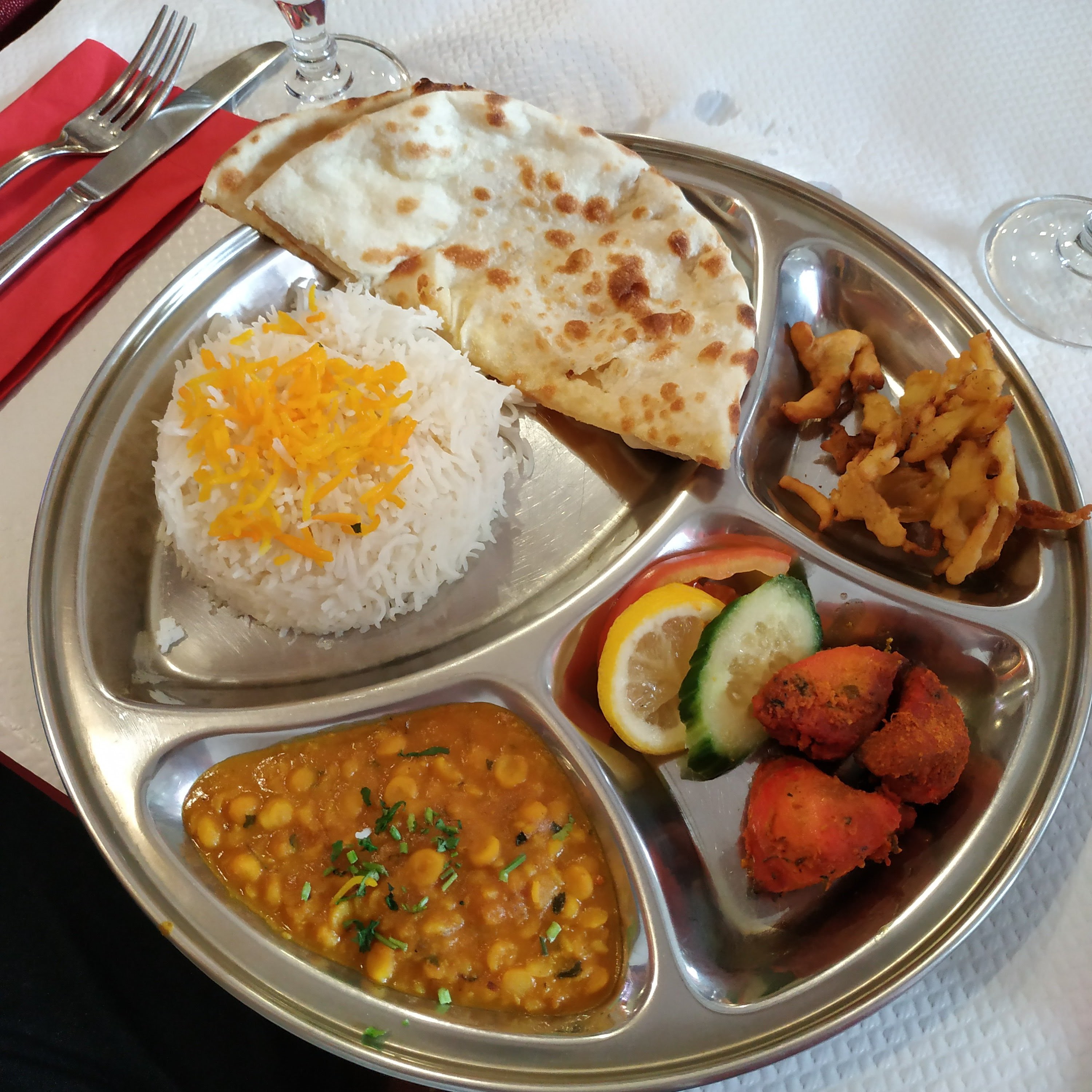 Je me suis régalée, j'ai pris un plat de lentilles que j'ai trouvé très savoureux et équilibré au niveau des épices. Accompagné d'un nan au fromage et d'un dessert à la cardamone, je suis repartie calée. Un vrai régal ! J'ai été bien accueillie. Le restaurant était peu fréquenté et le temps de service était parfait : rapide sans être pressant. J'ai pris mon temps sereinement. Une belle découverte 😀