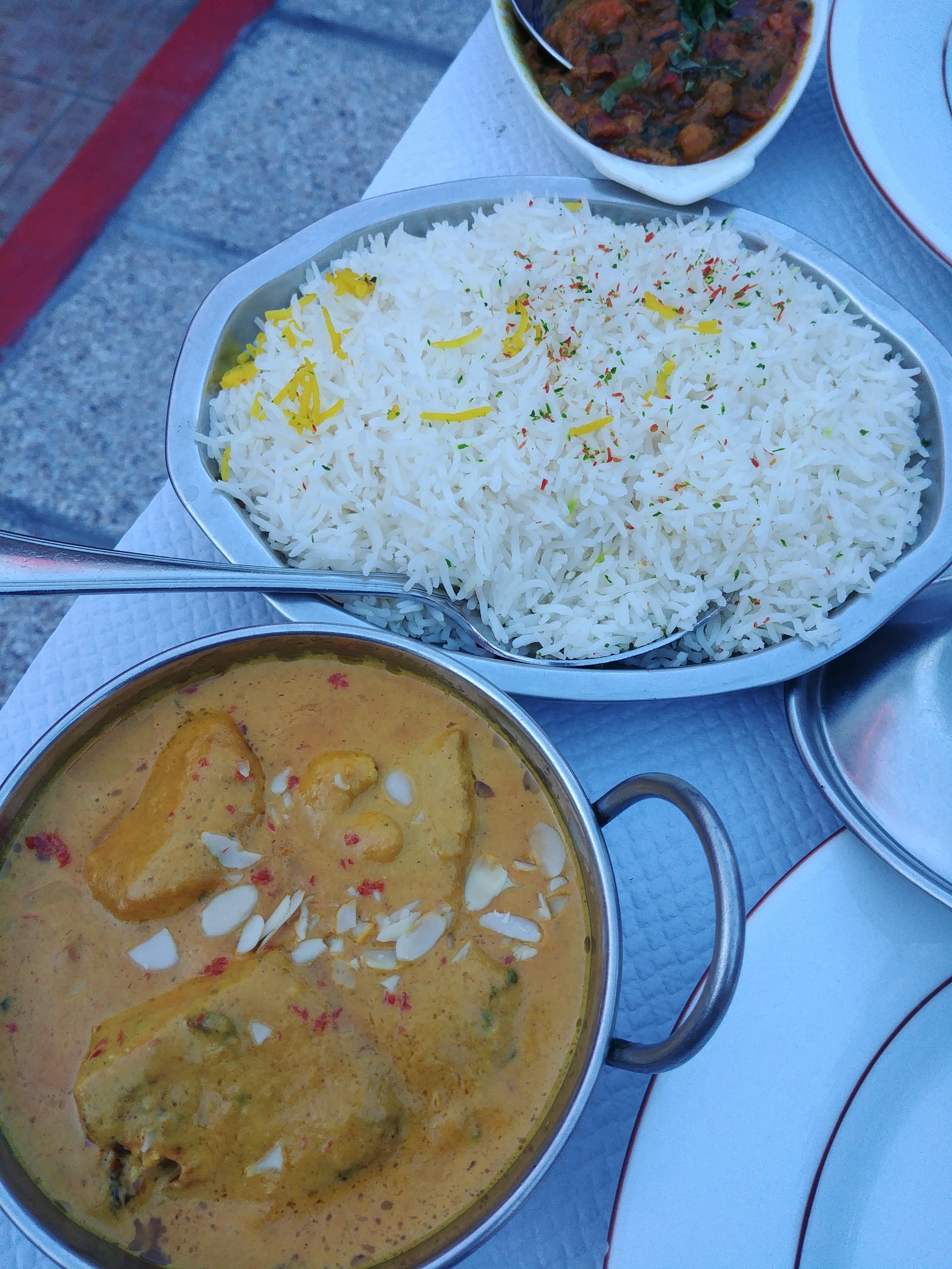 Pour une première commande à domicile, c'était nickel! Livreur souriant, à l'heure. Le repas était chaud et très bien assaisonné ce qui est rare. C'était très bon. Bon rapport qualité/prix. J'ai aimé le riz aux fruits secs qui contenait des fruits (confits?). Je craignais qu'il soit trop sucré comme un dessert mais pas du tout, le riz n'est pas sucré. Avec un accompagnement, le plat et juste peu sucré et peu salé. C'est top! Le biryani d'agneau parfait! Quelques plats sans viande, c'est un plus!