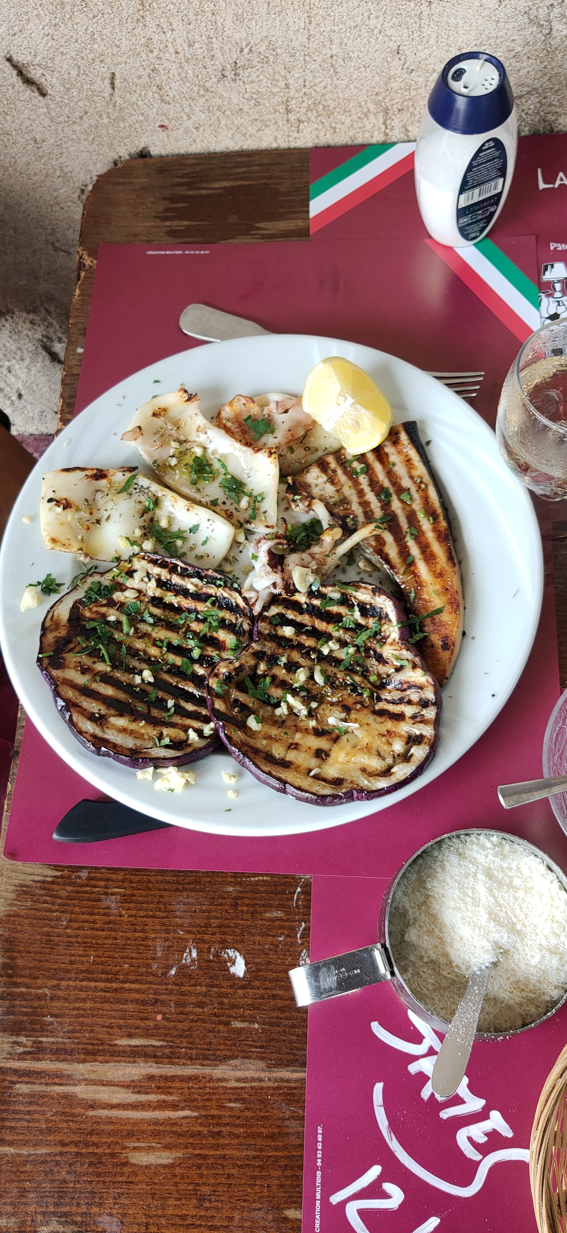 Bonne cuisine italienne nous avons mangés le plat du jour espadon et calamars avec Aubergine poissons frais une très bonne adresse derriere le port Vauban....