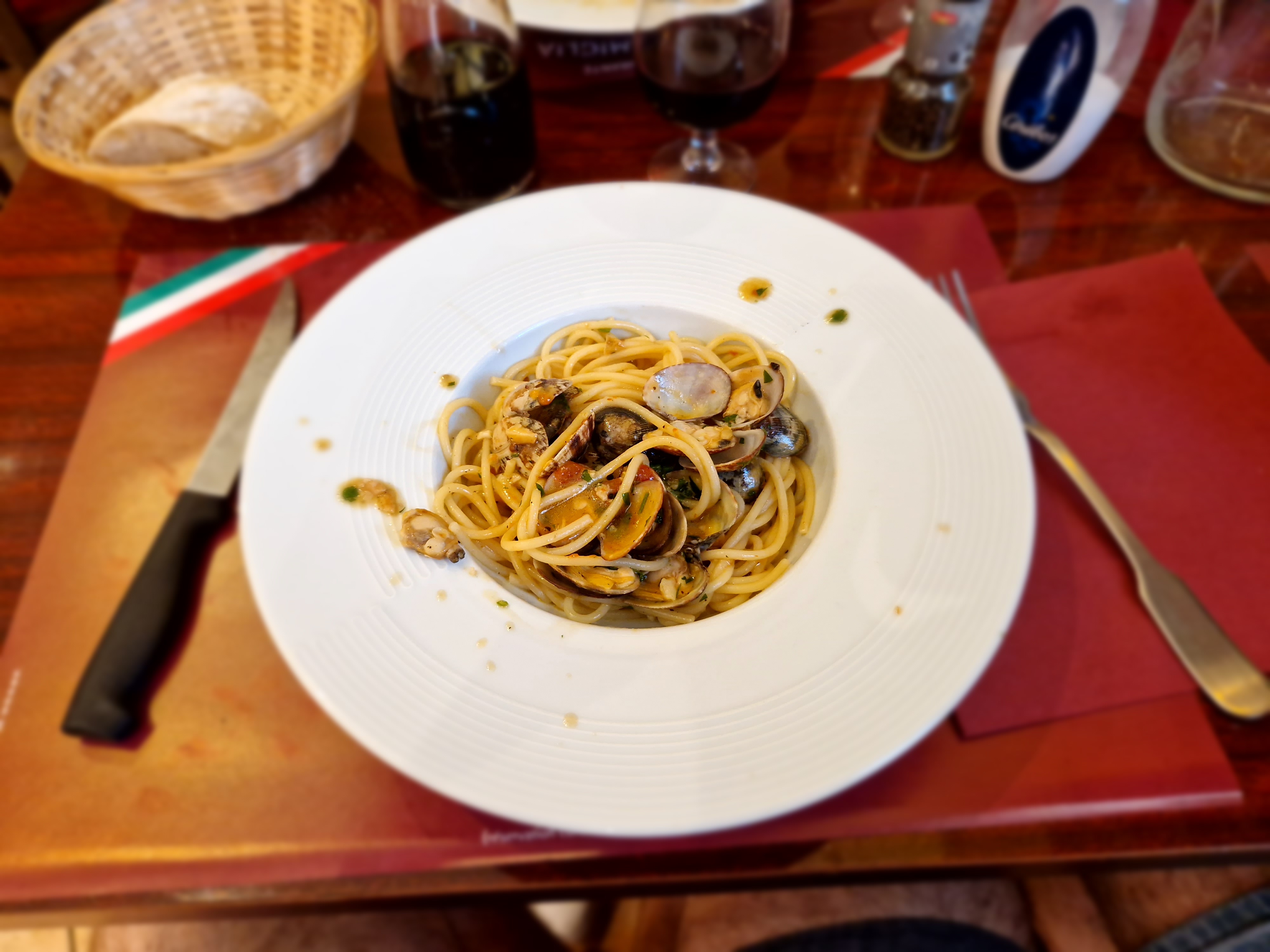 Accueil familial, spaghettis aux moules fraîches exceptionnelles. Les plats sont si copieux qu'on se retient de venir tous les jours !!!