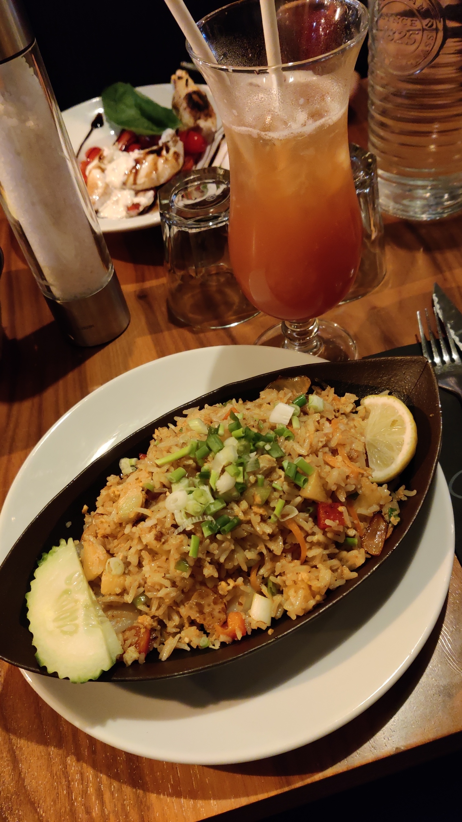 Un nom et deux adresses l’une en face de l’autre : cuisine italienne dans l’une et asiatique dans l’autre. Nous avions prévu d’aller côté asiatique car bien noté, même si nous étions un peu perplexe de manger asiatique dans un restaurant au nom italien, mais le restaurant asiatique était fermé. Nous nous sommes donc « rabattu » côté italien même si nous avions mangé italien la veille, mais oh surprise, il y avait des propositions asiatiques à la carte. Nous sommes donc restés sur notre envie première et avons pris un BoBun et un Pad thaï au poulet, toujours un peu perplexe. Et en fait, c’était vraiment très bien, parfaitement réalisé, digne de bons restaurants asiatiques ! Pas particulièrement bon marché mais le rapport qualité/prix reste au rendez-vous. Ceci dit, les pizzas avaient l’air très appétissantes aussi 😉.