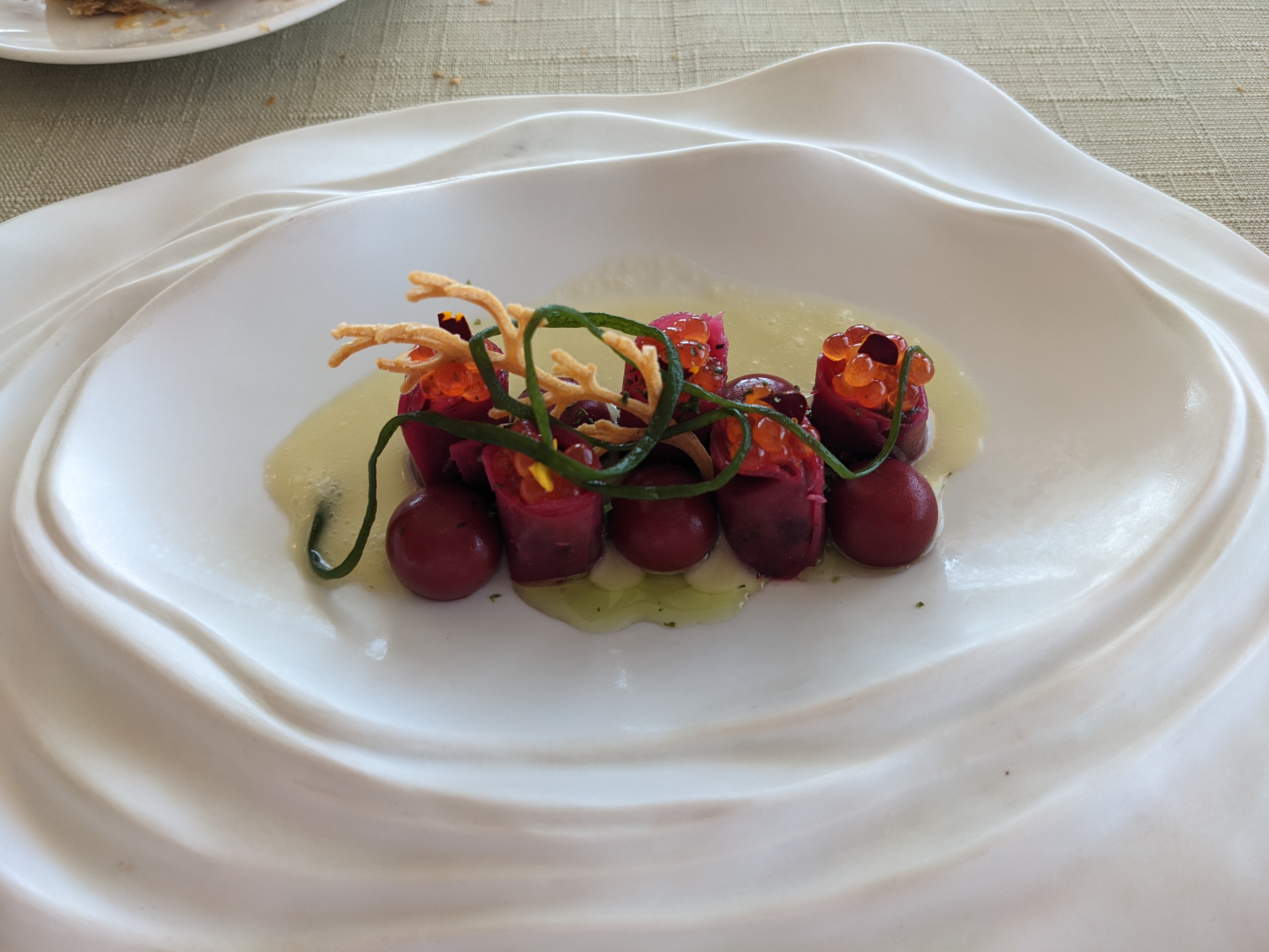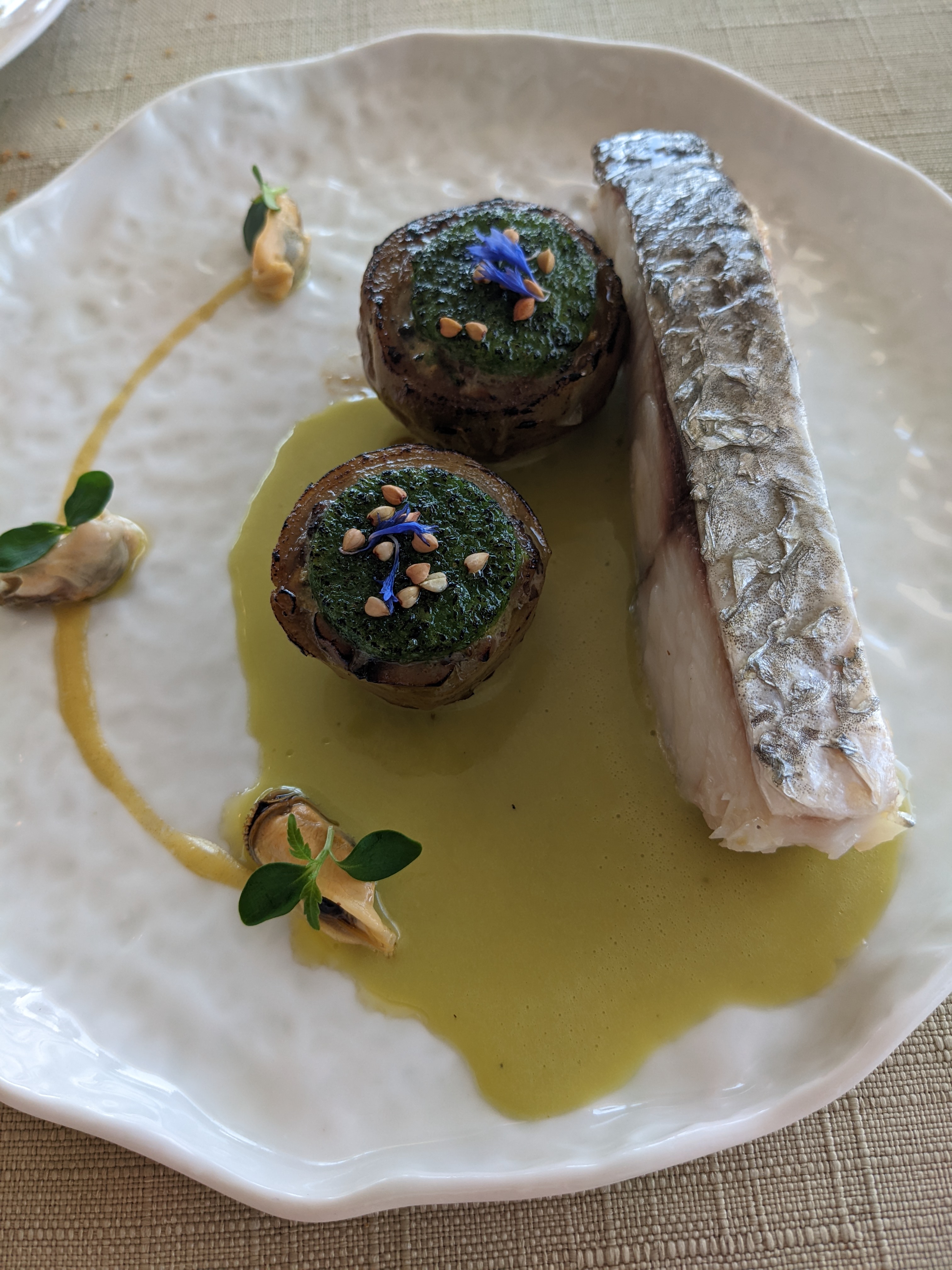 Nous avons été éblouis par les saveurs de la mer (herbes, algues...) Bravo au chef pour les déclinaisons succulentes de produits ainsi et la présentation. Les vins d'accompagnement étaient exquis . Vie idyllique sur l'océan. Les desserts nous ont paru moins grandioses C'était notre second passage Nous reviendrons