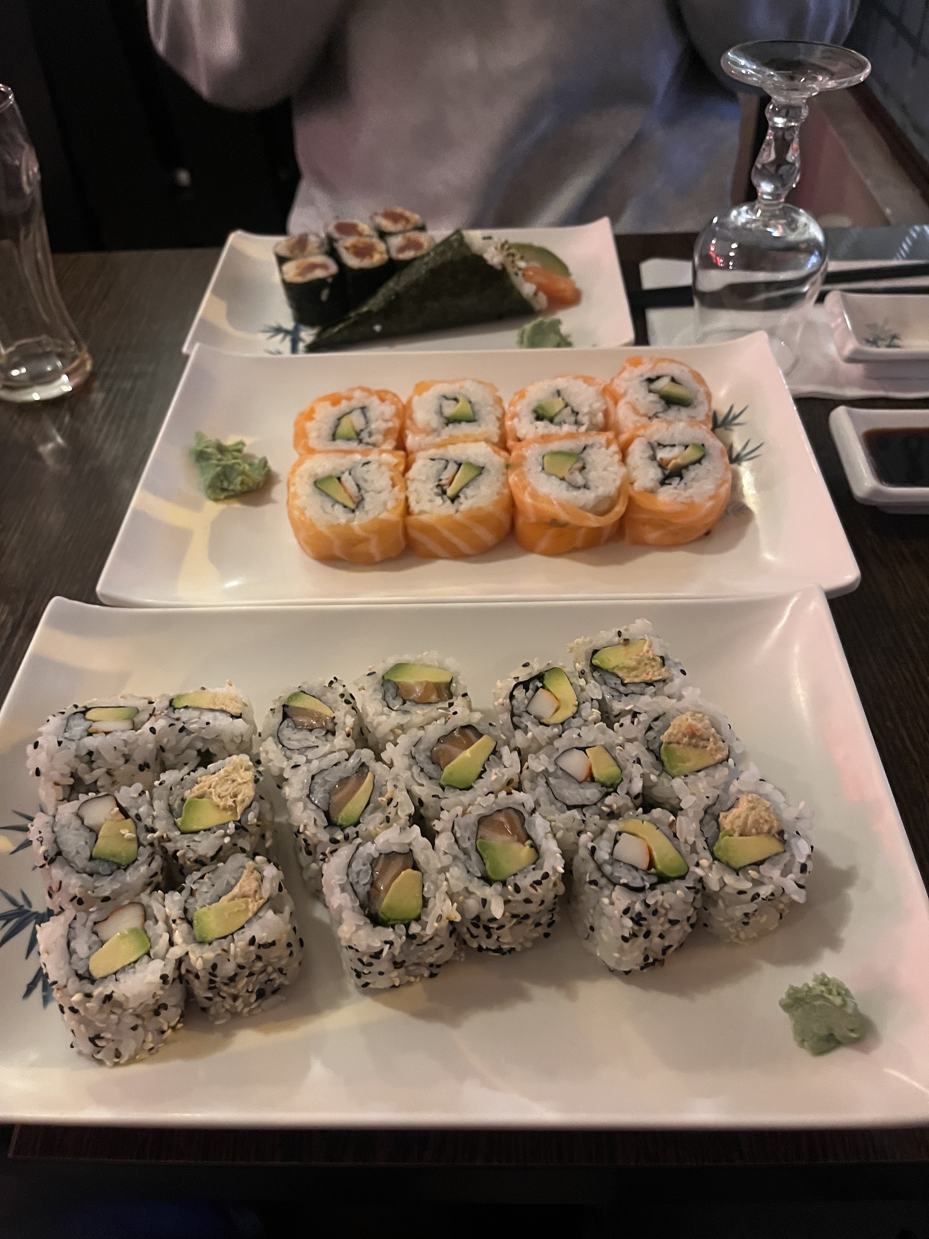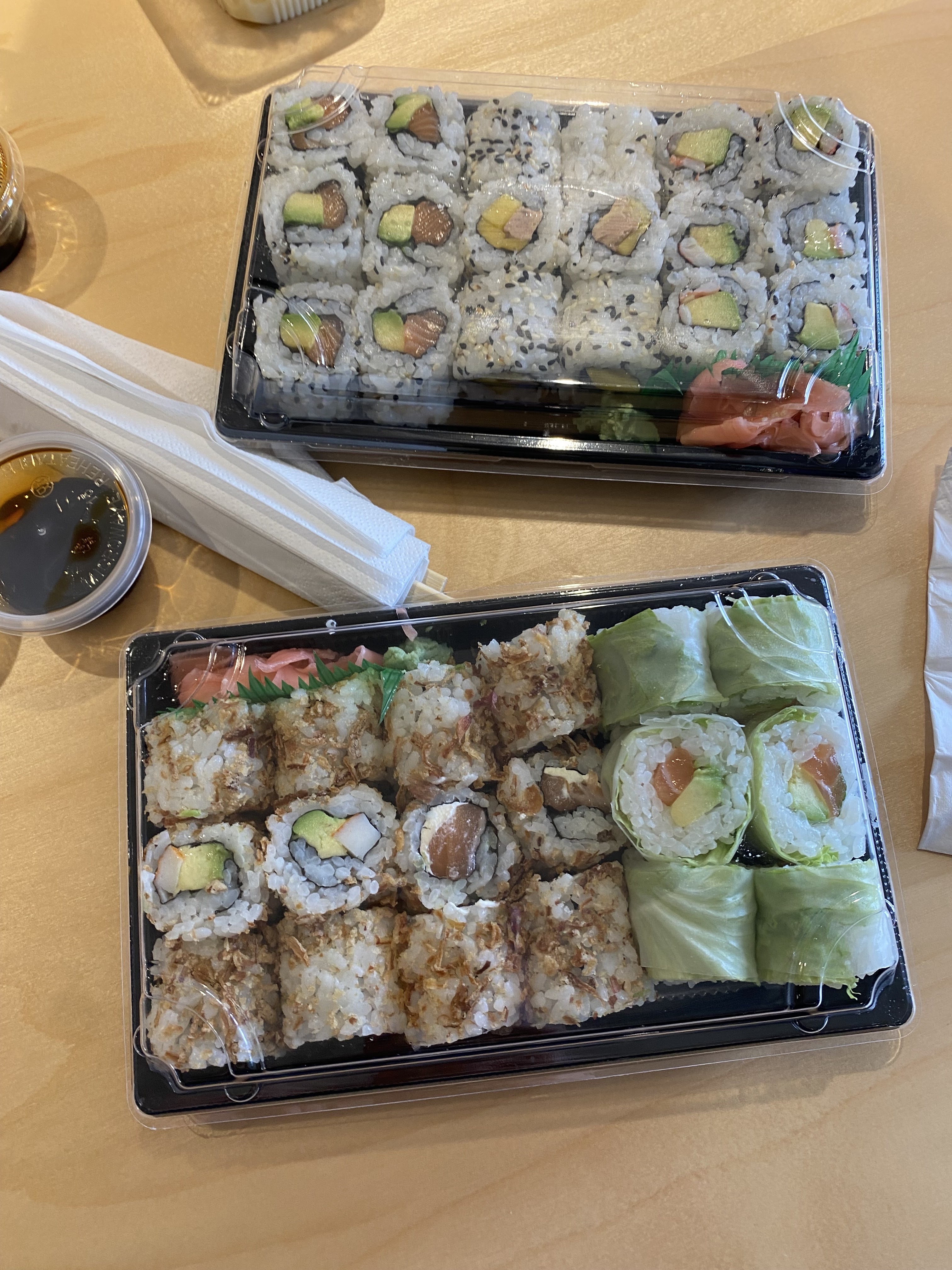Sushis super bon, gingembre frais Super initiative de donner des serviettes pour s'essuyer les mains mais elles semblent quand meme pas mal utilisé, peut etre voir pour en changer plus régulièrement sinon vraiment top 👍