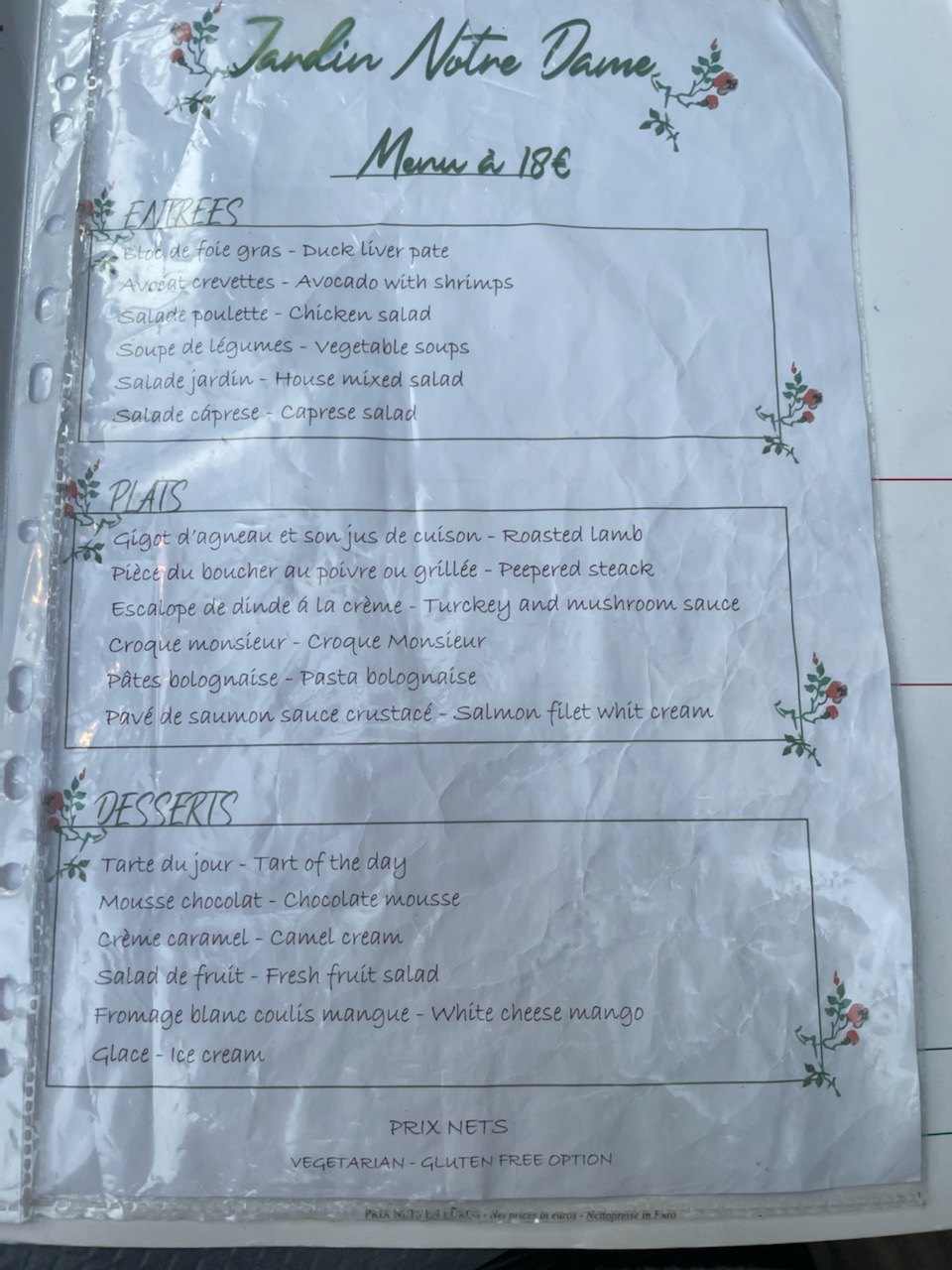 Prix :35€ 2 repas avec 25cl de vin et 2 cafés.bonne qualité de ce qui servi. En plus si arrivèe de bonne heure : vue sur notre dame sous véranda.
