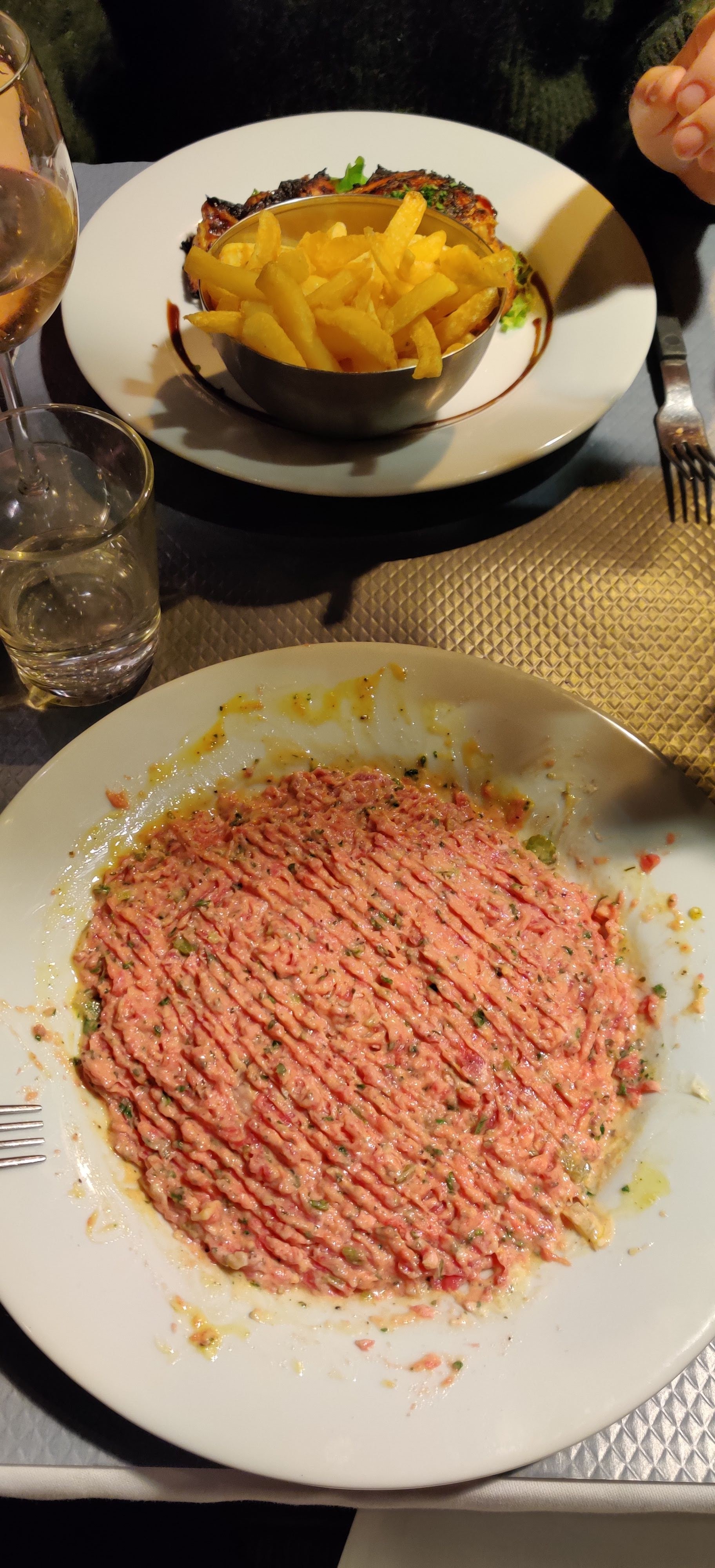 Nous avons commandé deux menus à 16h : - entrée : foie gras : convenable mais mal présenté - « carré » d’agneau : ressemble plus à des côtelettes tel que présenté. Grosse déception en ce que peu garni et sec (servi avec frites mais sans sauce). Nous avons dû payer une sauce poivre en extra (+2 euros) - entrecôte frites sauce poivre : steak bien cuit mais peu de frites. Sauce moyenne - desserts : • une mousse au chocolat : pareille que celles qu’on trouve dans les cantines. • une part de tarte aux pommes : un peu cramée. Je regrette d’y être allé.